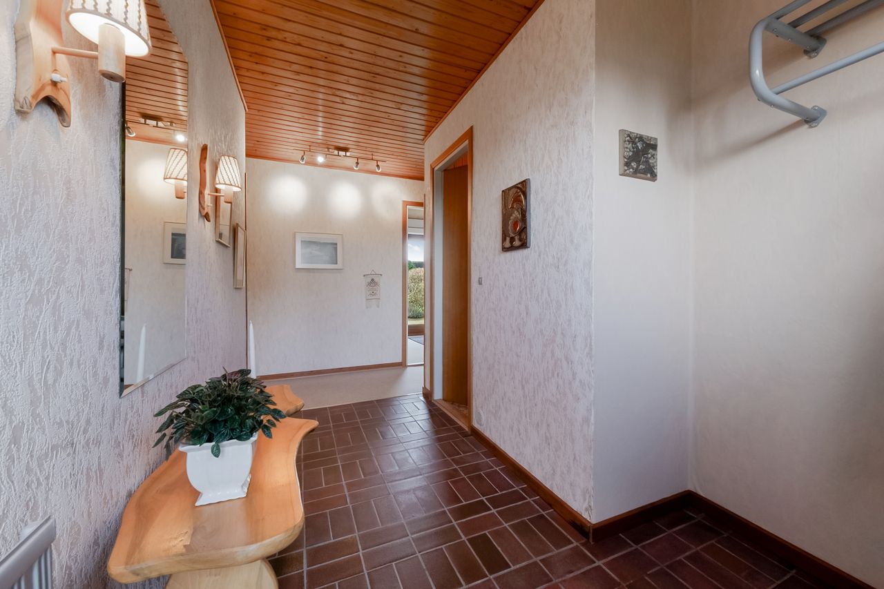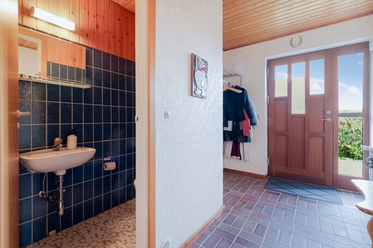 Når du træder ind gennem den smukke hoveddør, bydes du velkommen i en rummelig og lys entré, indrettet med klinker og plads til overtøj. Fra entréen er der adgang til et gæstetoilet indrettet med klassiske blå klinker. Entréen fører dig videre til en fordelingsgang, der giver direkte adgang til de fleste af husets øvrige rum.