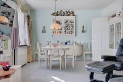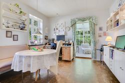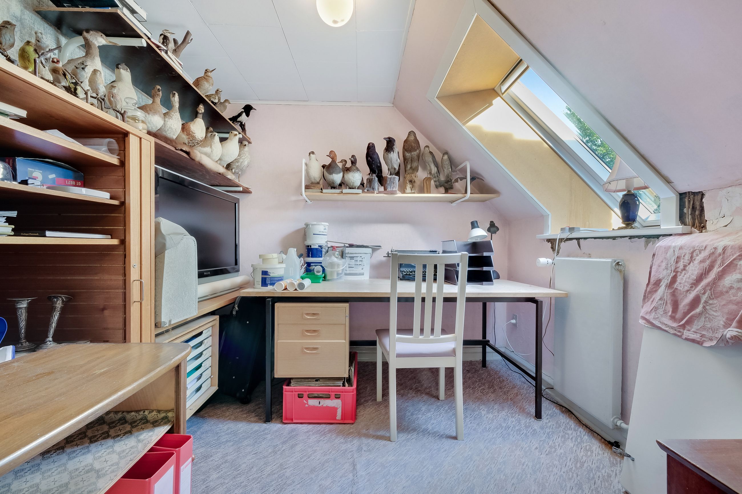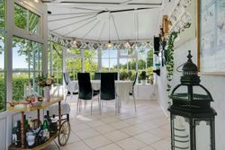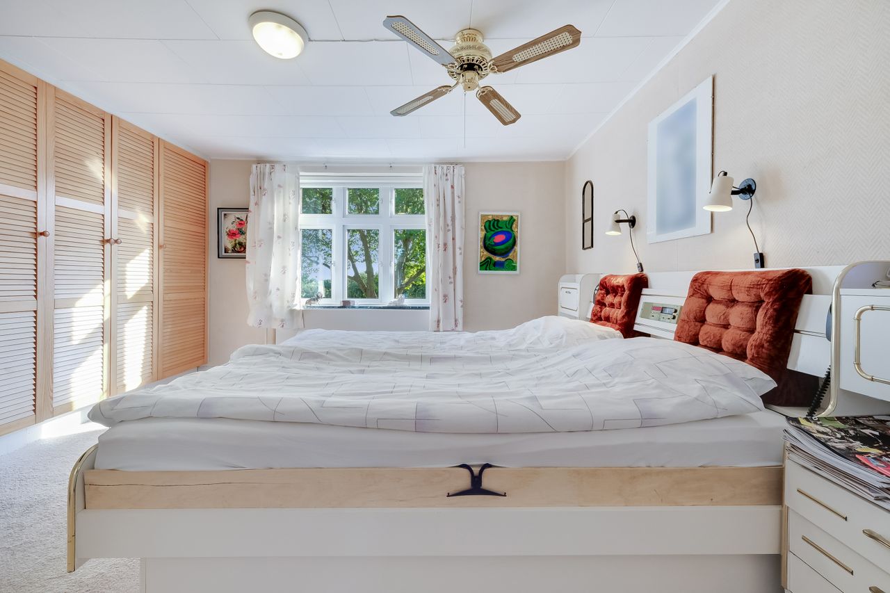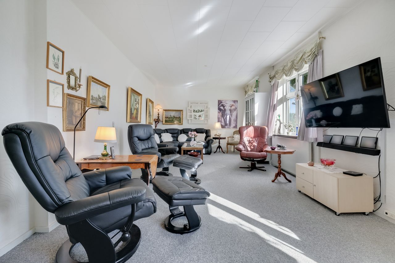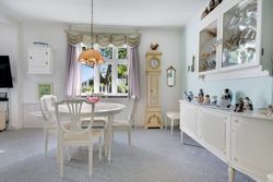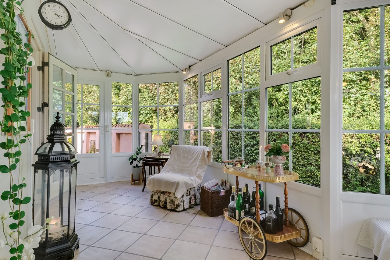 Udestuen er bygget i 2008 og er boligens perle – nærmest som en scene taget ud af Badehotellet. Her skaber sprossede vinduer og det omkringliggende grønne som bagtæppe en idyllisk stemning, og for at gøre det endnu bedre, kan du herfra endda se til Ringe Sø.