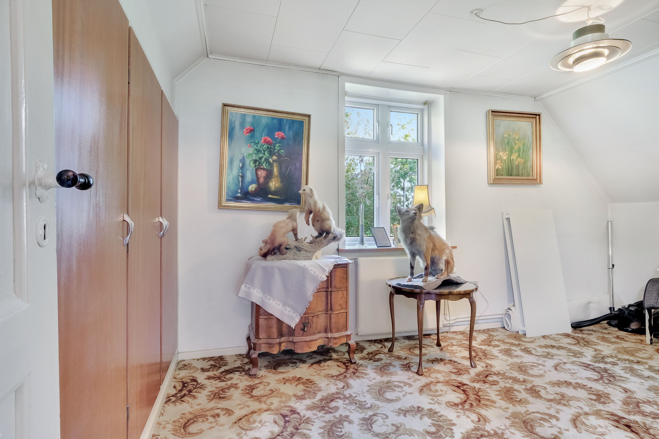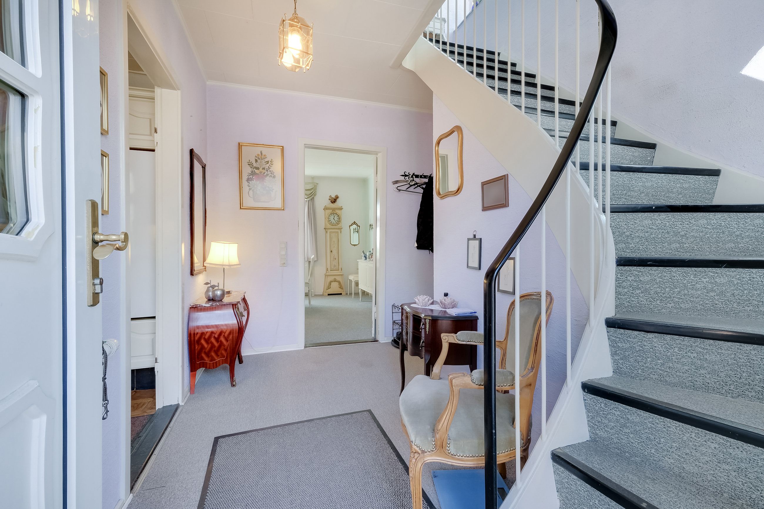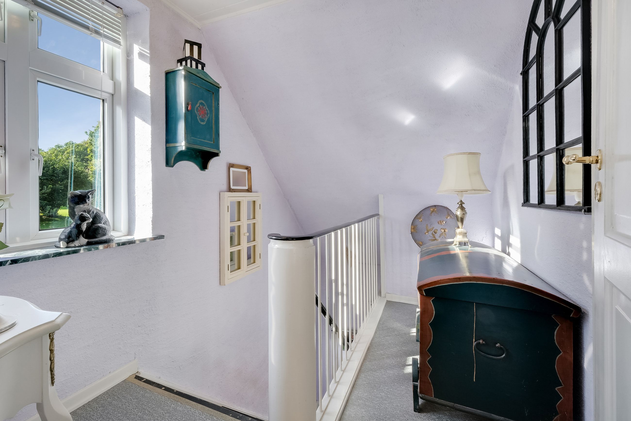 Indendørs træder du ind i en rummelig entré, hvor den smukke svungne trappe straks fanger blikket og fører op til førstesalen. Heroppe finder du en repos med opbevaringsmuligheder, et soveværelse med indbyggede skabe, yderligere to værelser, samt et badeværelse med smukke lyseblå retrofliser og indmuret badekar.
