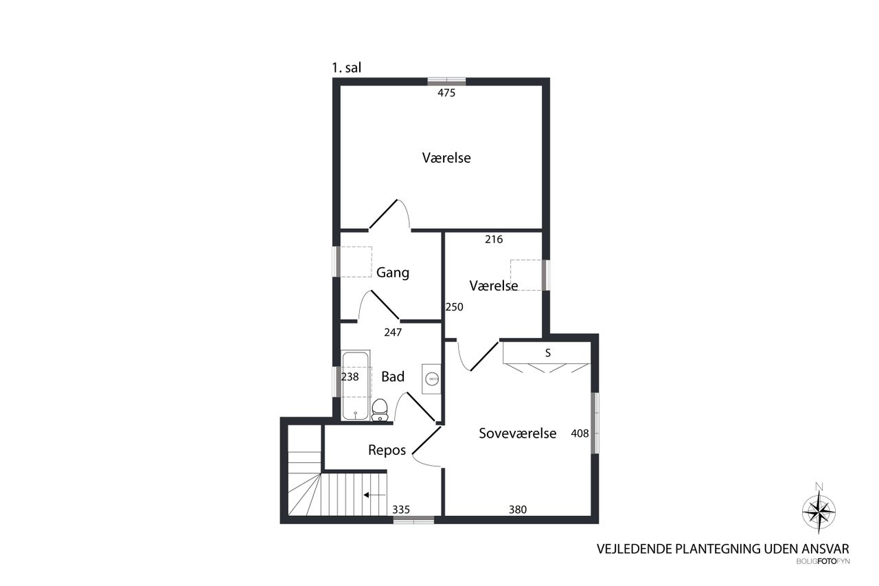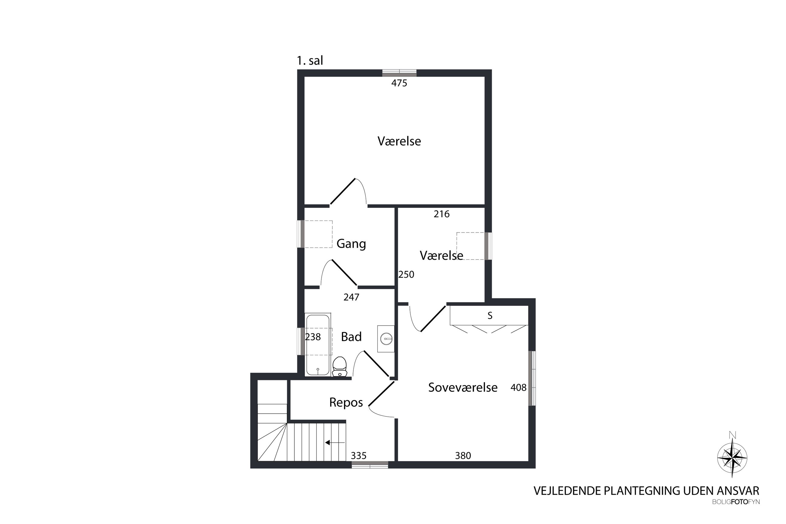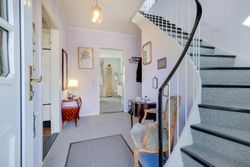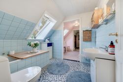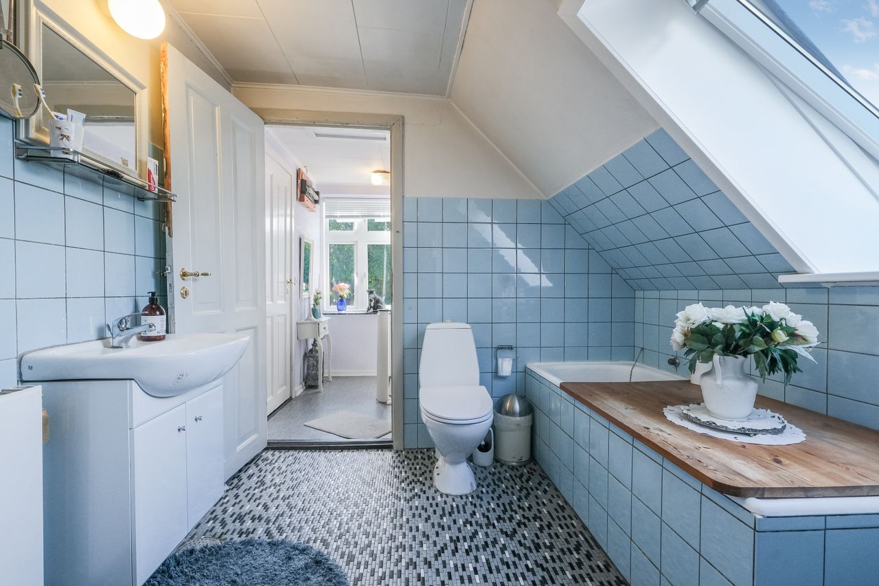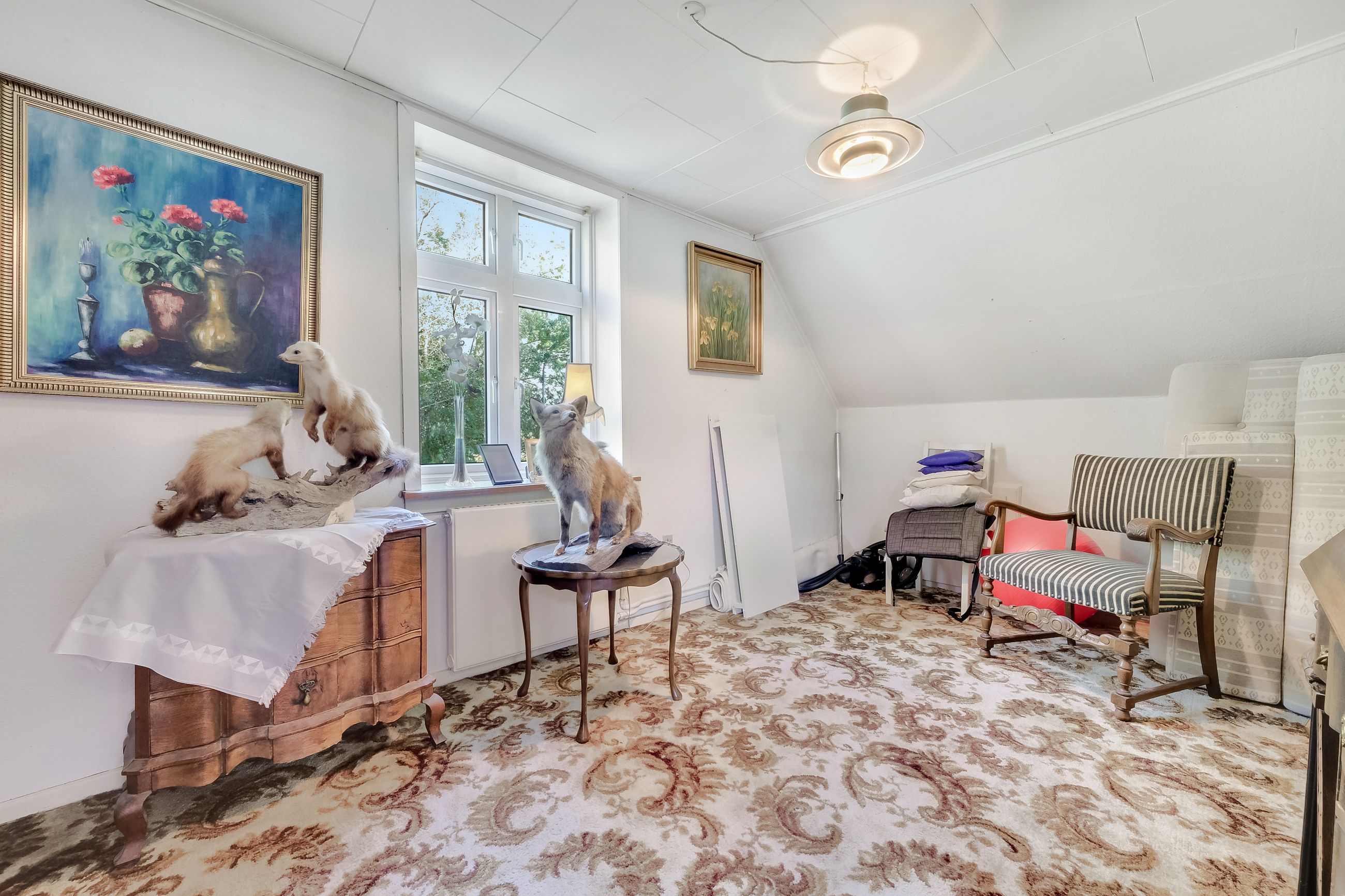Indendørs træder du ind i en rummelig entré, hvor den smukke svungne trappe straks fanger blikket og fører op til førstesalen. Heroppe finder du en repos med opbevaringsmuligheder, et soveværelse med indbyggede skabe, yderligere to værelser, samt et badeværelse med smukke lyseblå retrofliser og indmuret badekar.