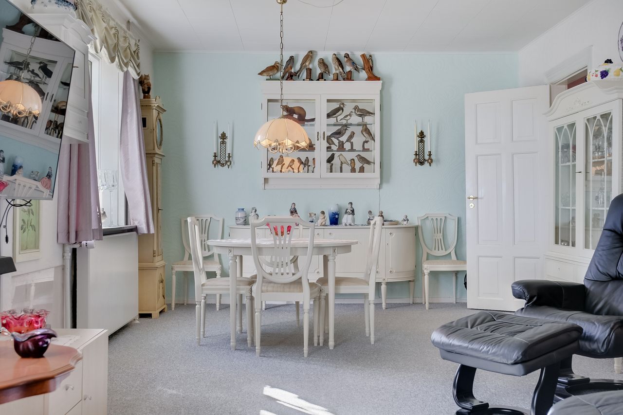 I stueplan ligger boligens leverum: køkken-alrum og stue. Stue og køkken ligger i dag separat, men planløsningen kan gentænkes, hvis du drømmer om et mere åbent rumforløb. Stuen er aflang og fleksibel med plads til både sofahjørne, spisearrangement eller et ekstra værelse, hvis behovet opstår – perfekt som kontor, legerum eller gæsteværelse. Køkkenet står med hvide fronter og træbordplade, og en halvmur markerer en naturlig opdeling til spisepladsen i alrummet.