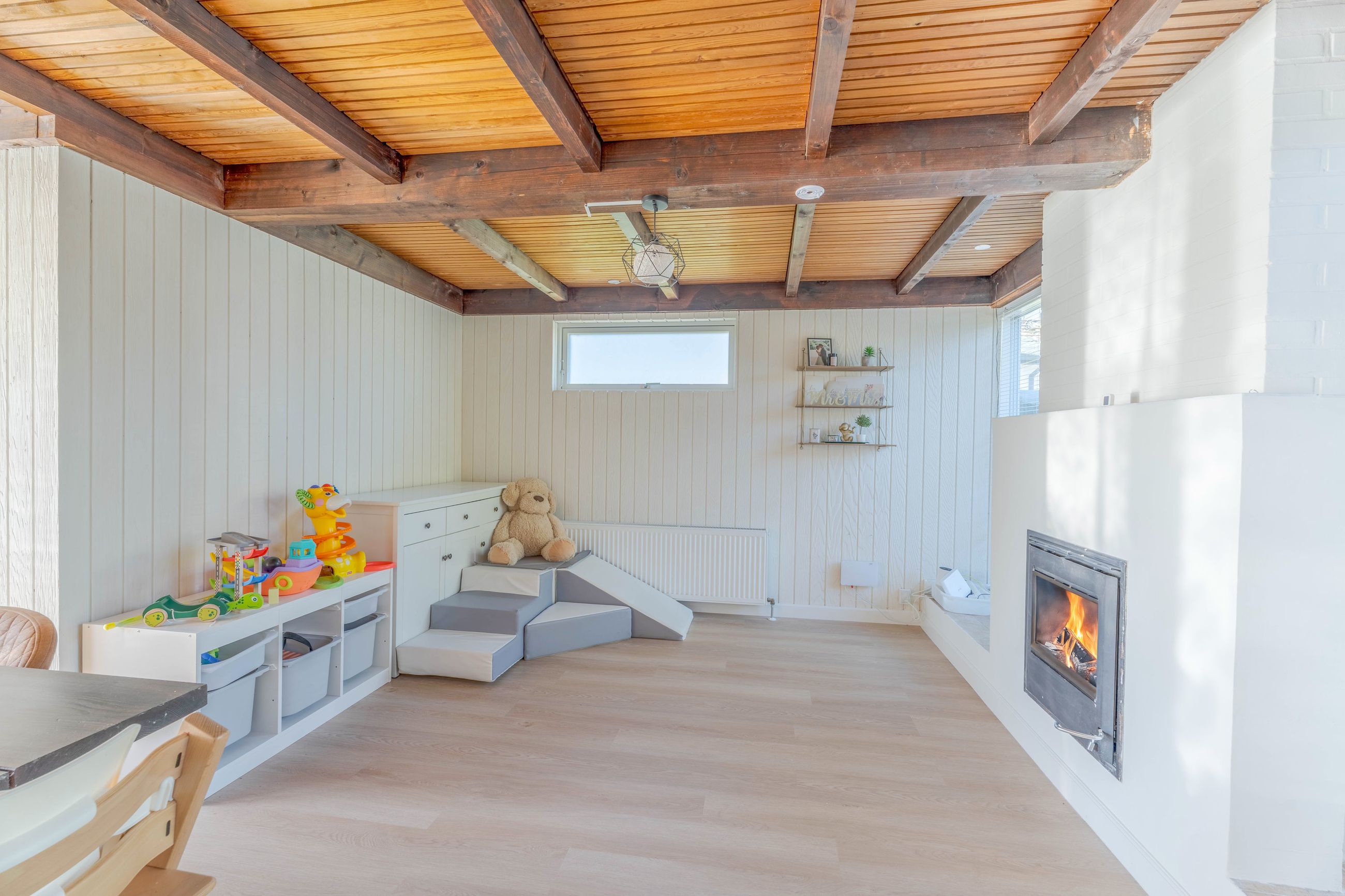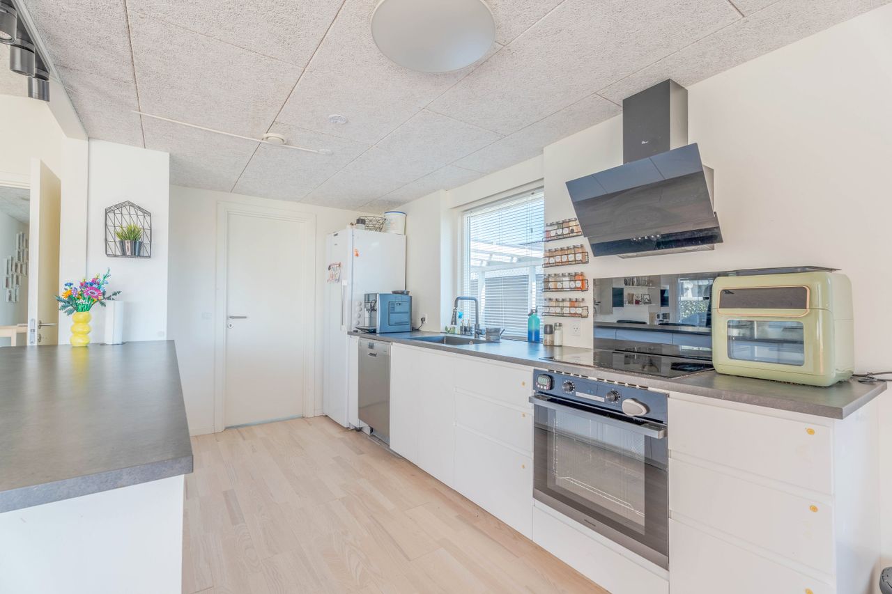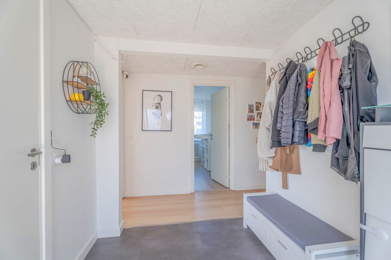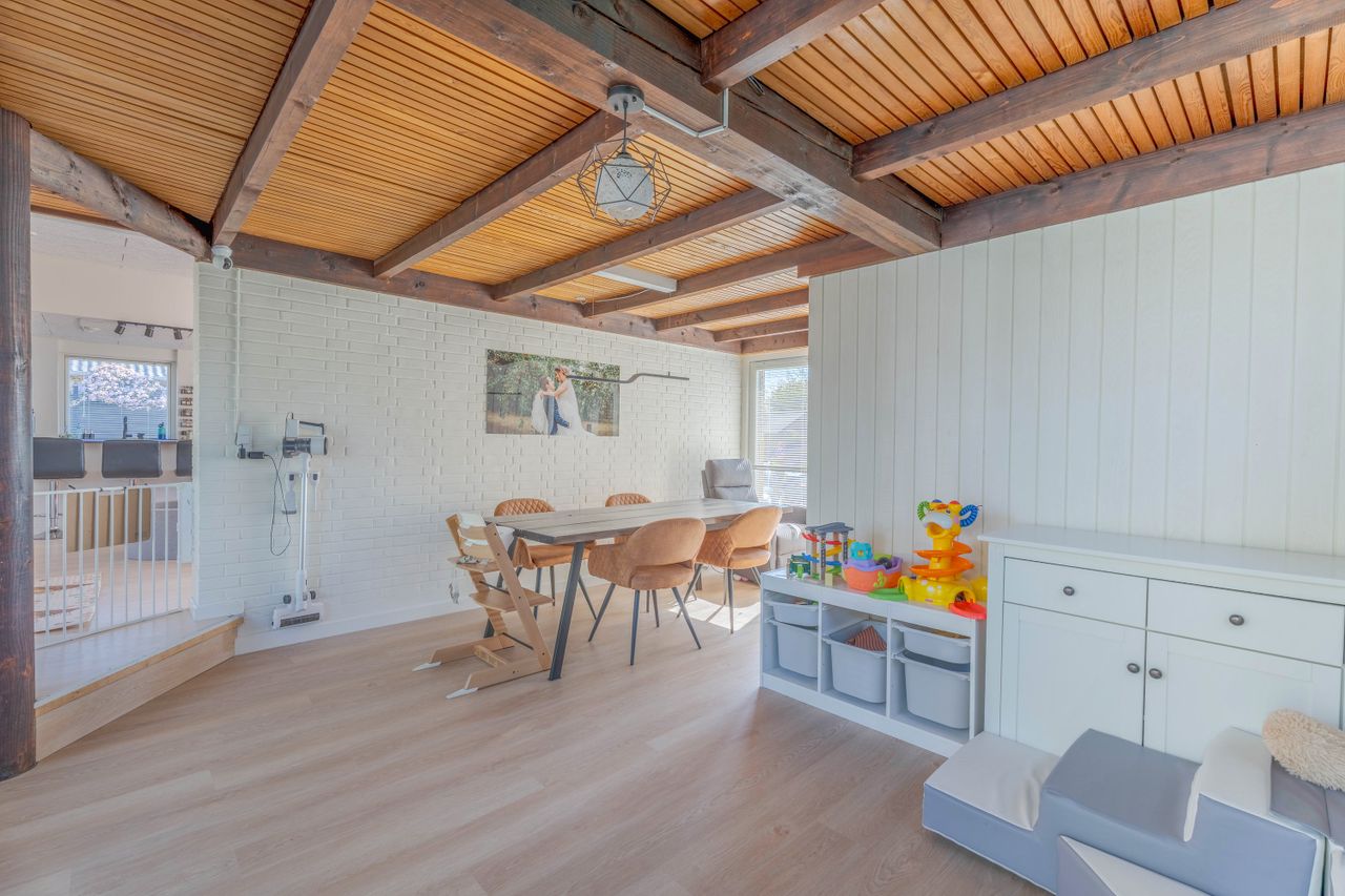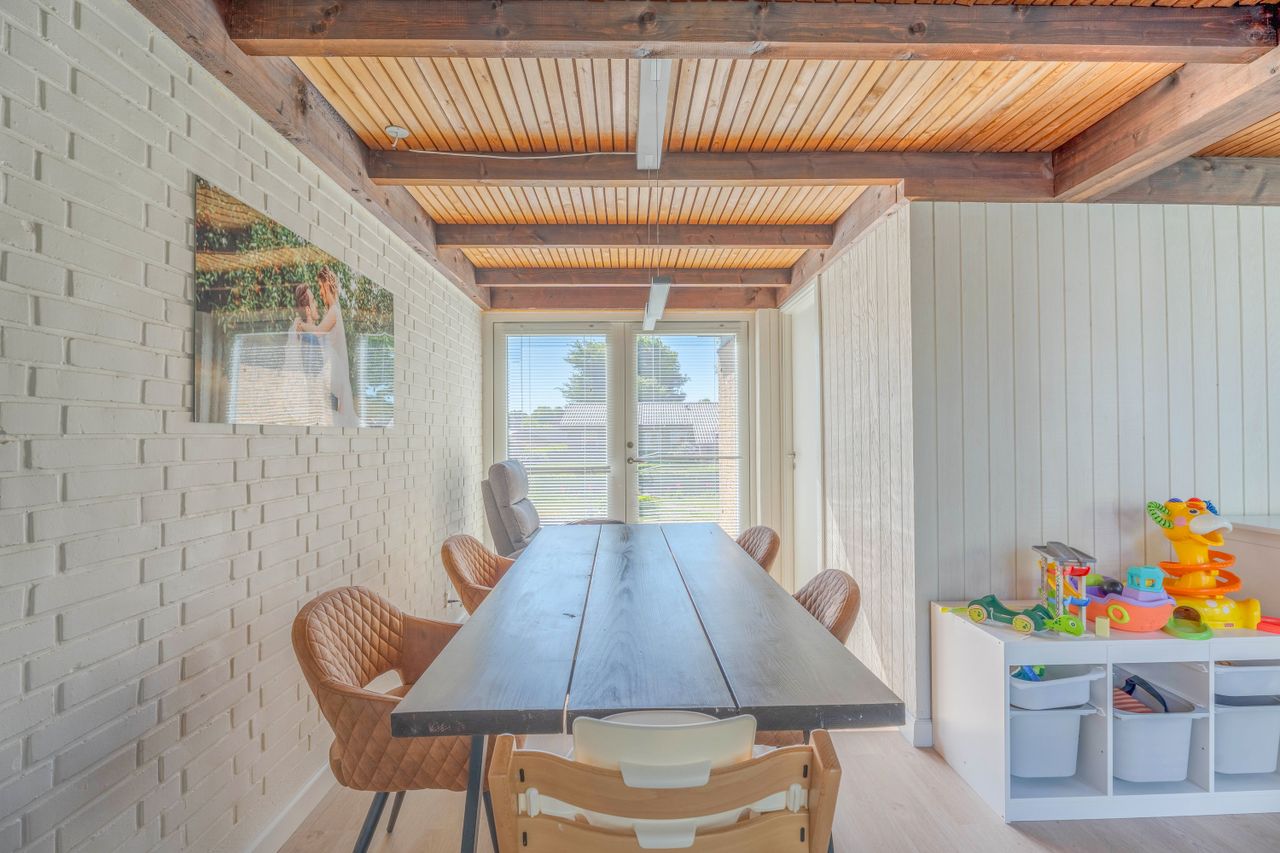 Planløsningen er funktionel og familievenlig. Entréen giver adgang til det store, lyse køkken-alrum med moderne køkken, parketgulv og Troldtekt-loft, som sikrer god akustik. Herfra er der nedgang til en hyggelig stue med synlige loftbjælker og brændeovn, samt udgang til både for- og baghave. Boligen har desuden tre gode værelser og et soveværelse – to af værelserne ligger sammen med soveværelset og tilgås via fordelingsgangen, mens det sidste værelse har adgang fra stuen. Afslutningsvis rummer boligen et praktisk viktualierum, samt to badeværelser. Det ene badeværelse har charmerende blå klinker og badekar med brus, mens det andet badeværelse er indrettet med flotte mørke klinker på gulvet, lyst inventar, bruseniche, dobbelthåndvask og her er plads til vaskefaciliteter.