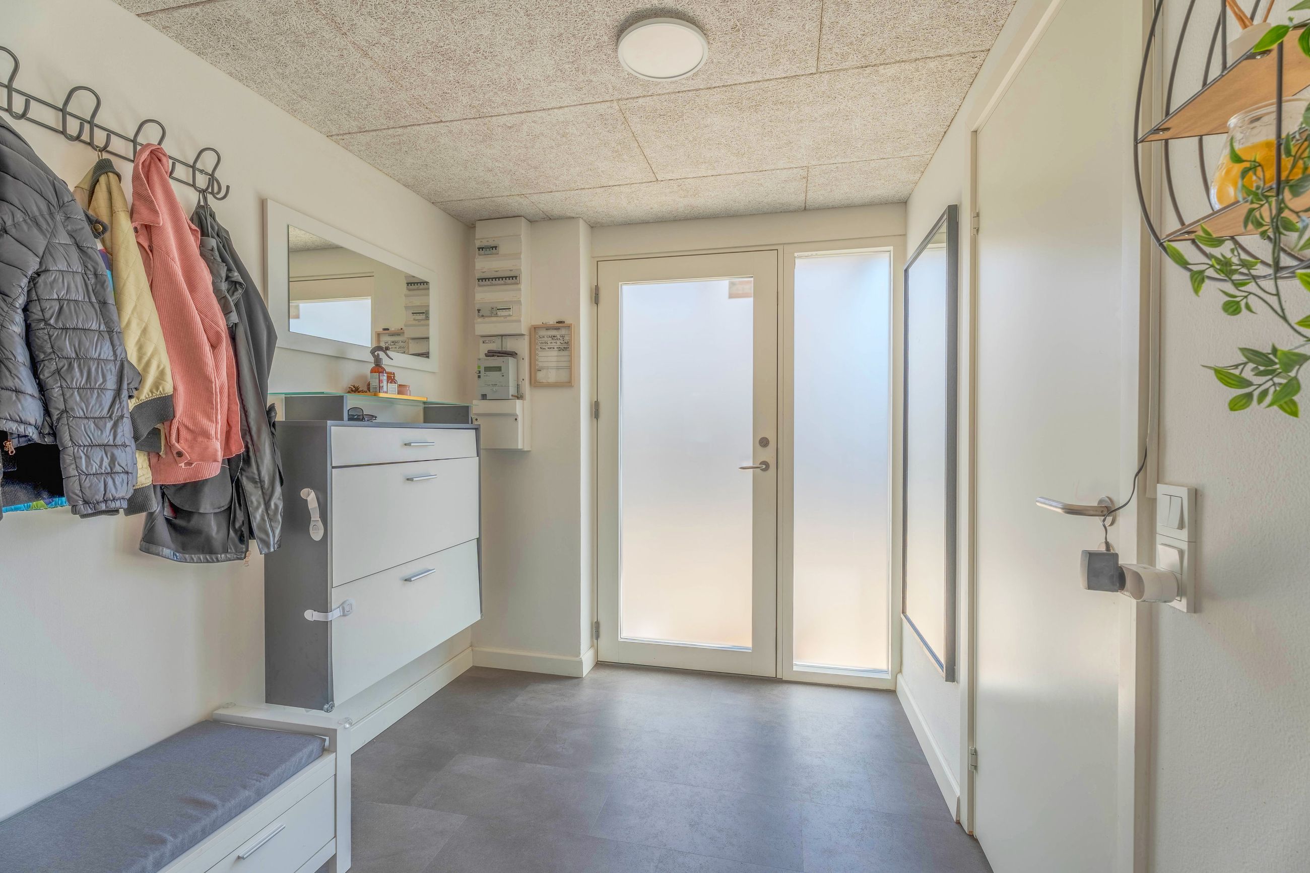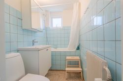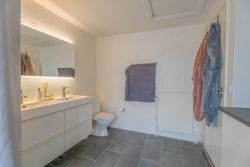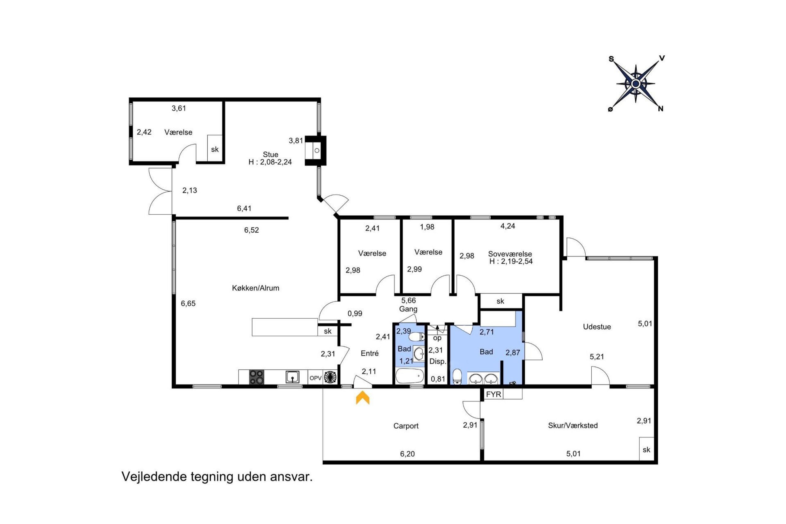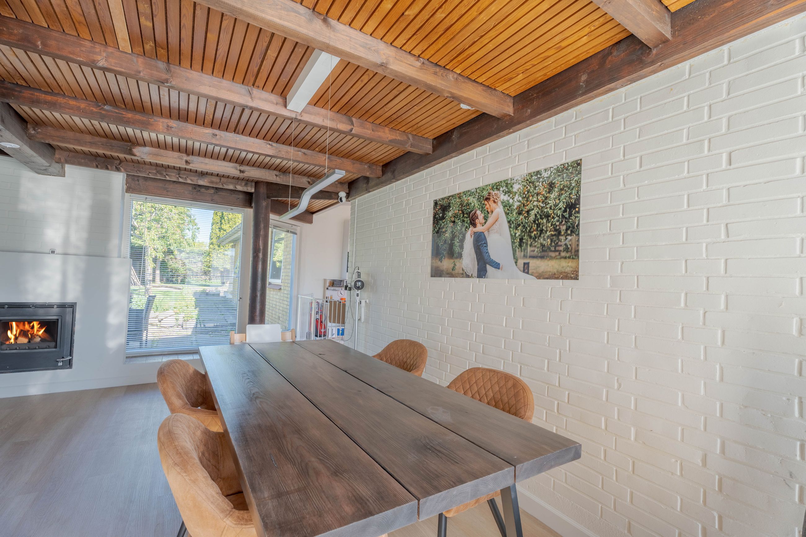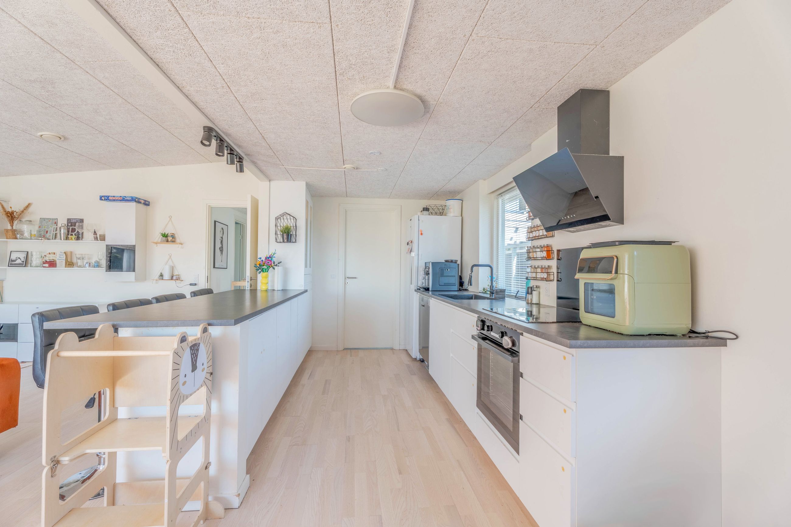 Planløsningen er funktionel og familievenlig. Entréen giver adgang til det store, lyse køkken-alrum med moderne køkken, parketgulv og Troldtekt-loft, som sikrer god akustik. Herfra er der nedgang til en hyggelig stue med synlige loftbjælker og brændeovn, samt udgang til både for- og baghave. Boligen har desuden tre gode værelser og et soveværelse – to af værelserne ligger sammen med soveværelset og tilgås via fordelingsgangen, mens det sidste værelse har adgang fra stuen. Afslutningsvis rummer boligen et praktisk viktualierum, samt to badeværelser. Det ene badeværelse har charmerende blå klinker og badekar med brus, mens det andet badeværelse er indrettet med flotte mørke klinker på gulvet, lyst inventar, bruseniche, dobbelthåndvask og her er plads til vaskefaciliteter.