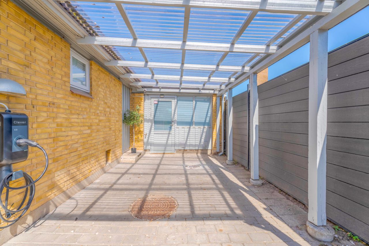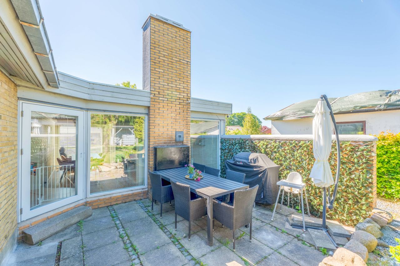 Grunden er på 710 m2 og rummer både carport, udhuse og overdækkede arealer, som giver fine muligheder for opbevaring og ophold. Opvarmning sker via fjernvarme.