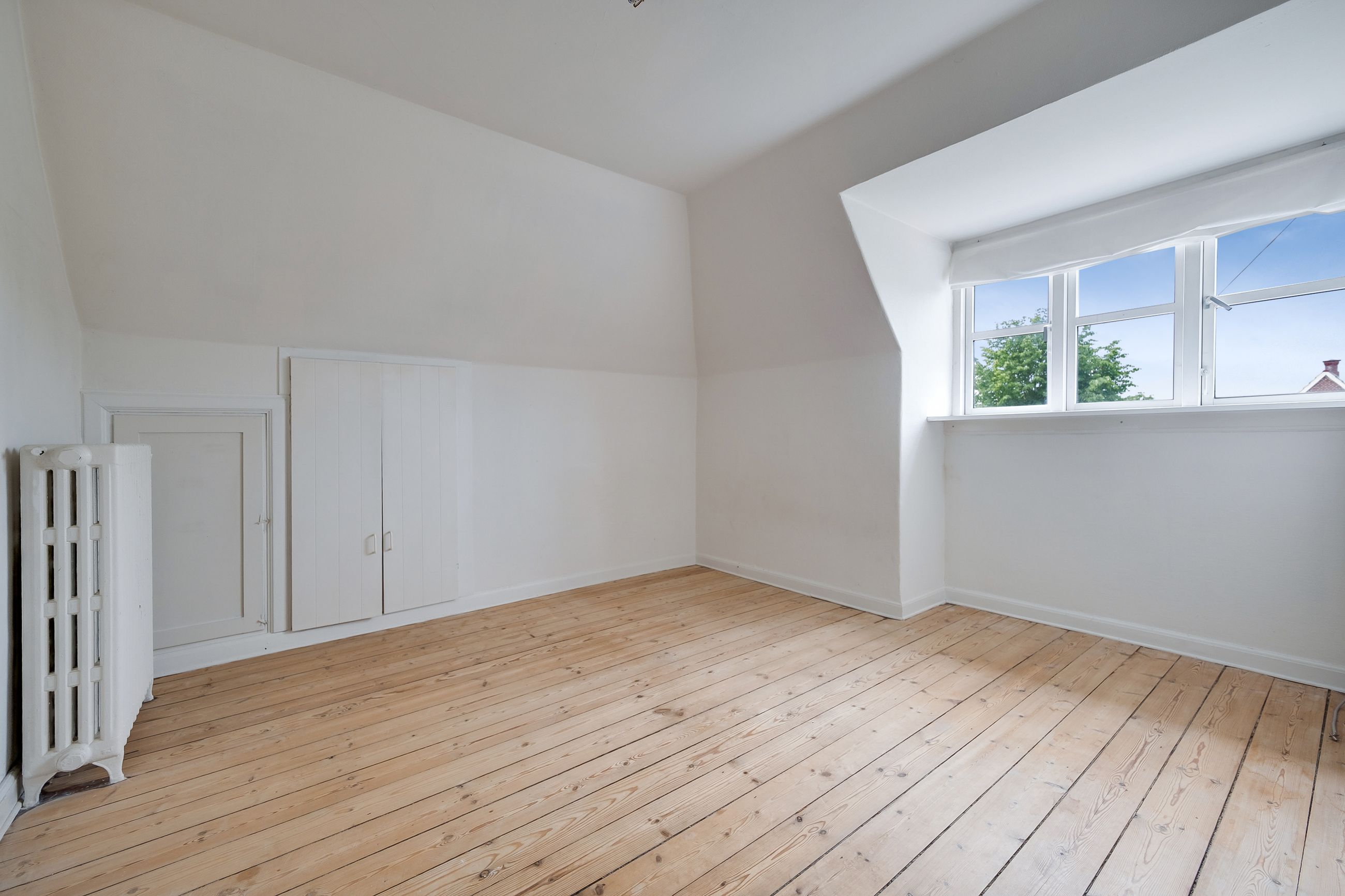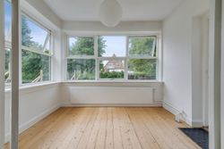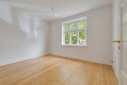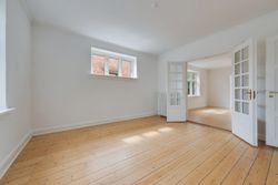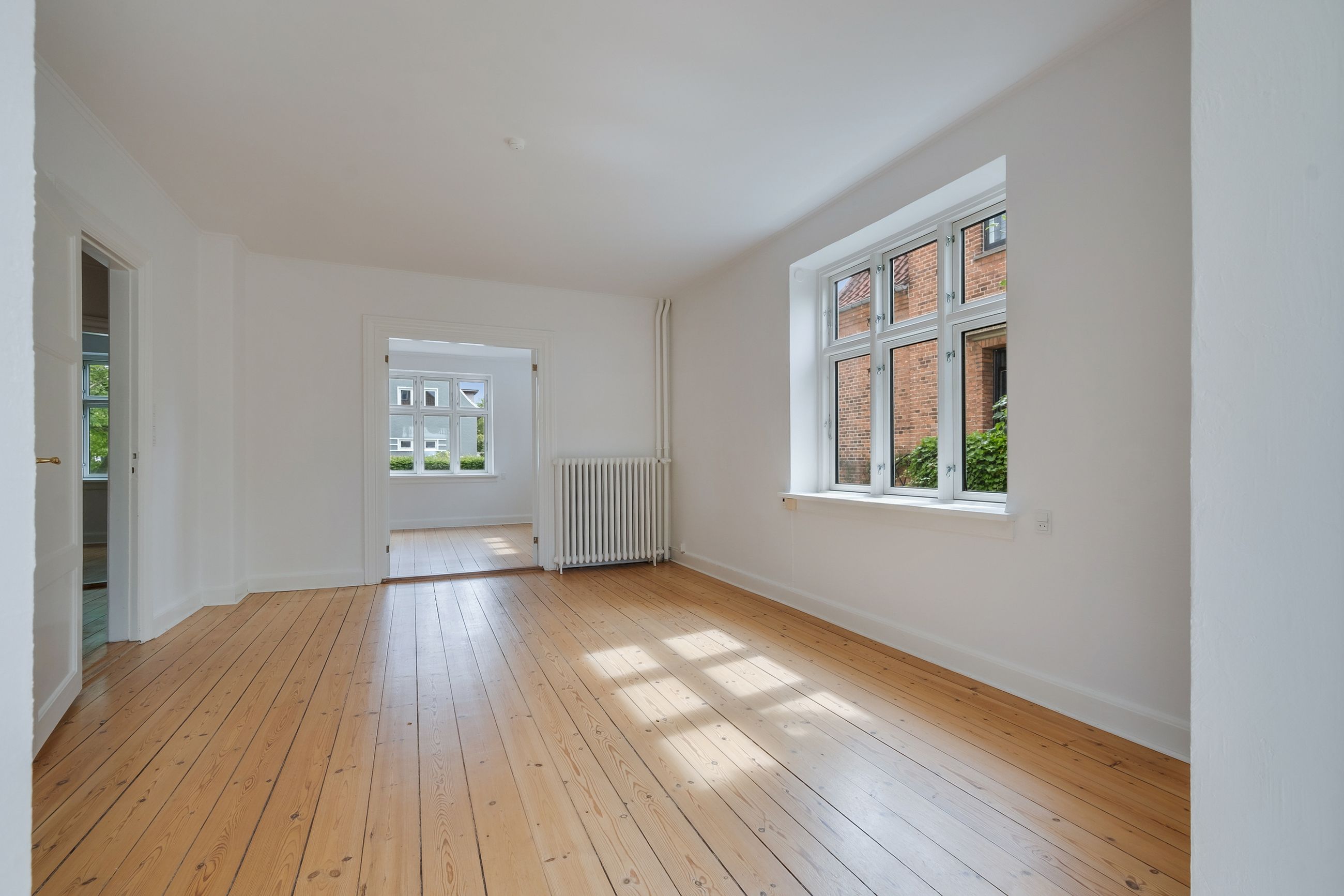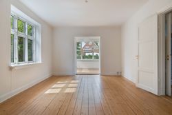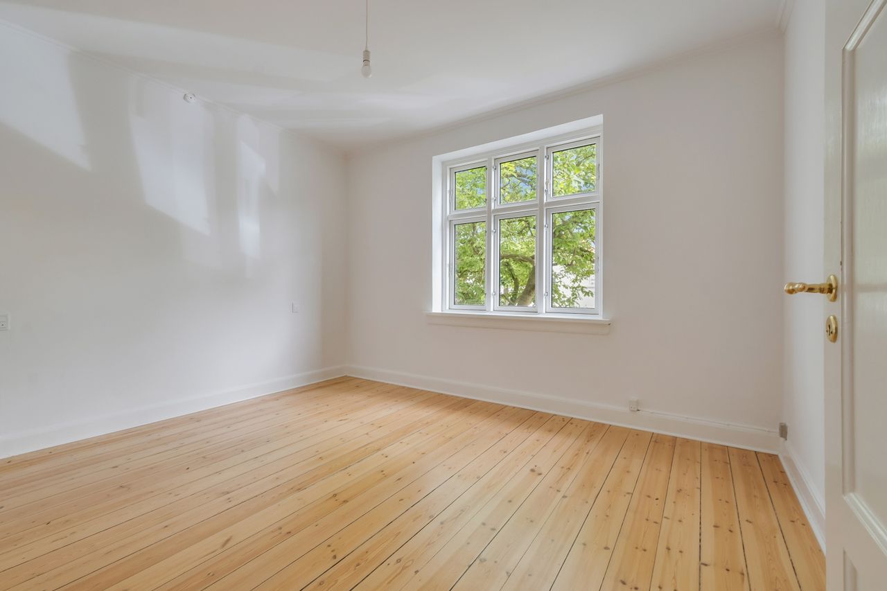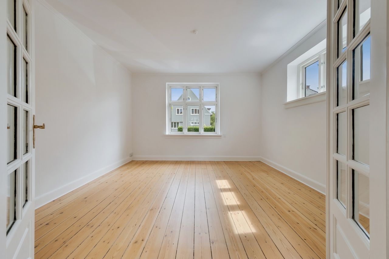 Går du til venstre i fordelingsgangen, finder du et rummeligt soveværelse. Stuerne en suite er delt op af en fransk dobbeltdør, og de store vinduer i stuerne giver et dejligt lysindfald, som skaber en indbydende, hjemlig atmosfære.