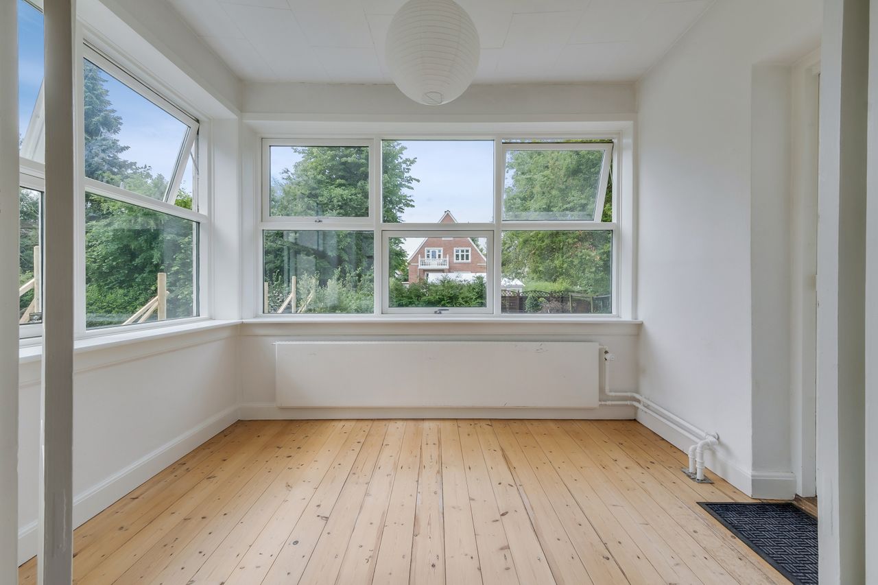 Fra stuen er der udgang til verandaen, som fungerer som et ekstra opholdsrum, som takket være de store vinduer er dejlig at opholde sig i året rundt - her er der altid et godt lysindfald og god udsigt over haven. Fra verandaen er der udgang til haven, så du nemt kan komme ud og nyde tilværelsen i grønne, rolige omgivelser.