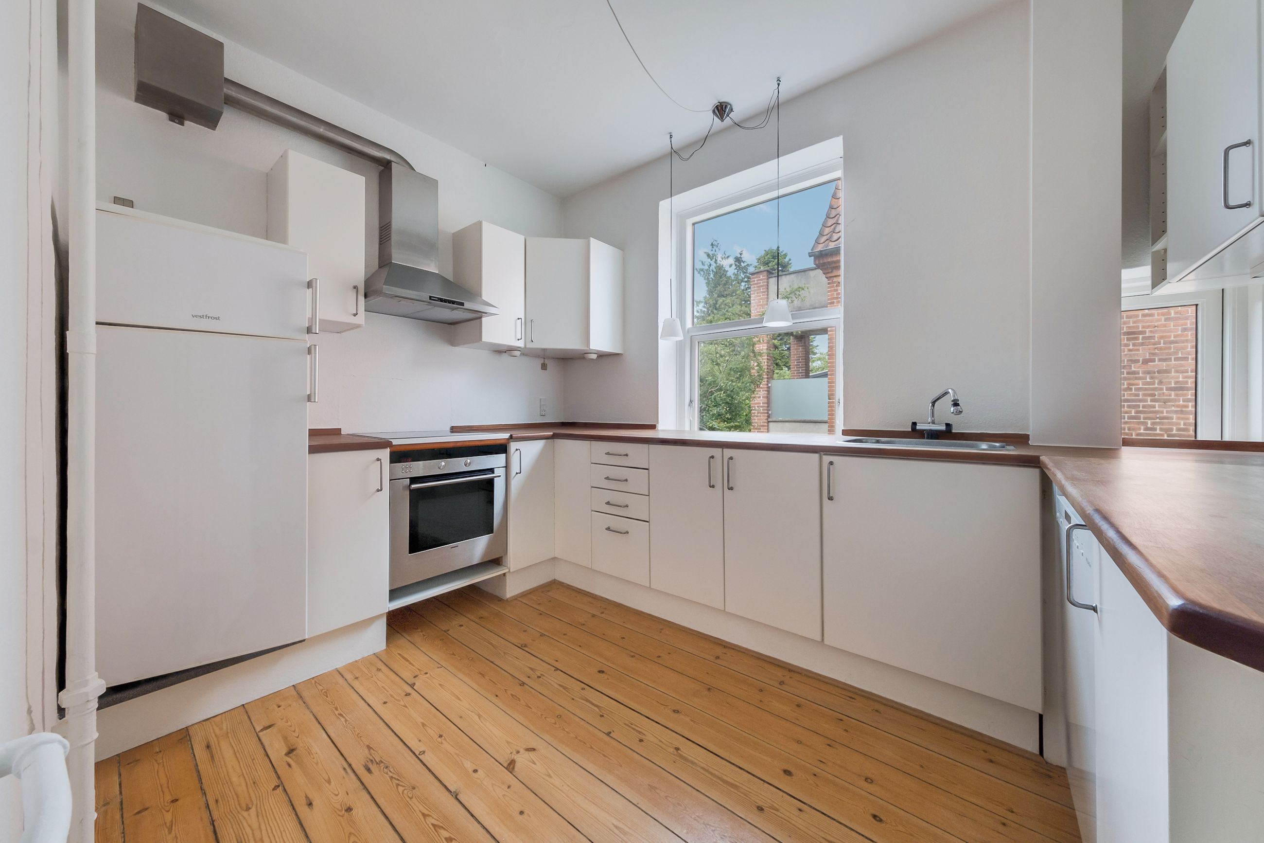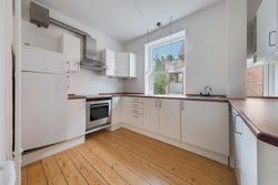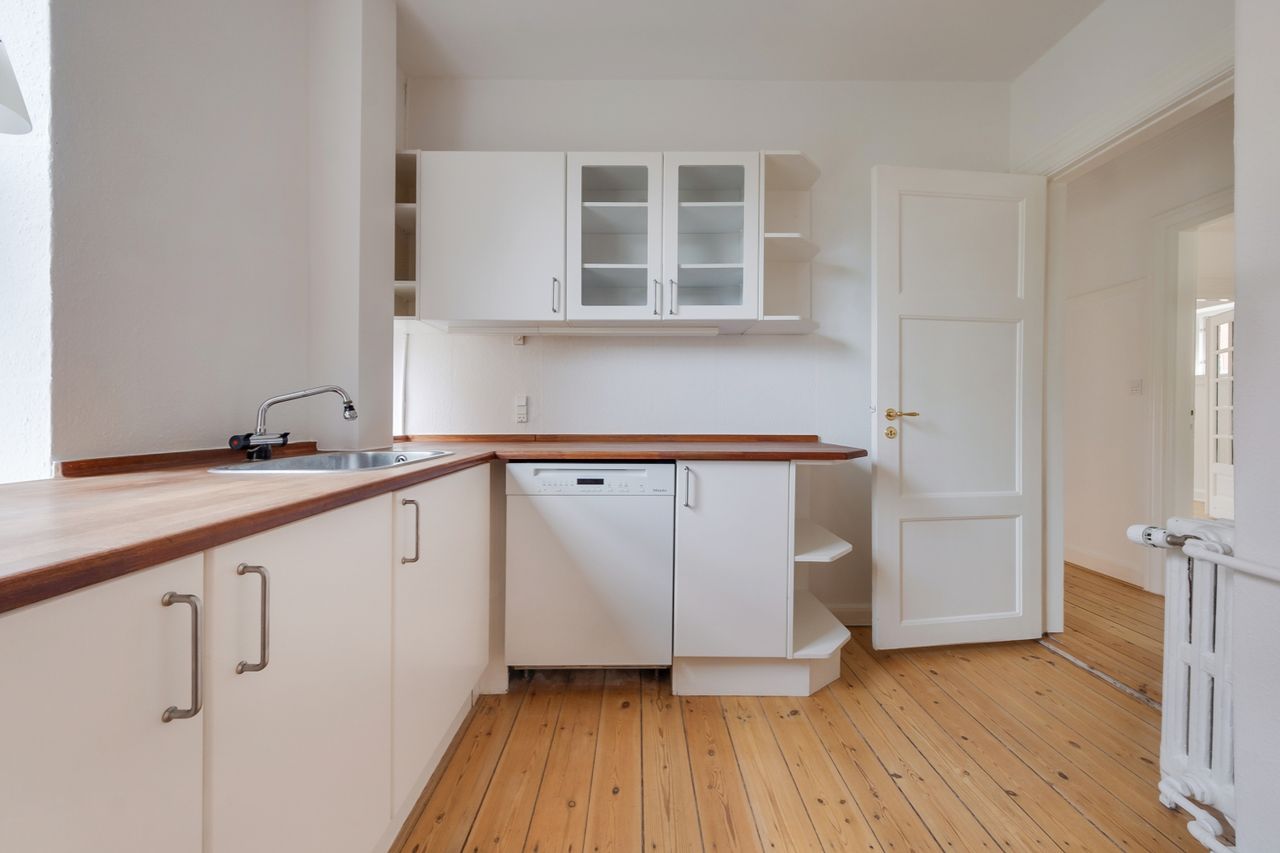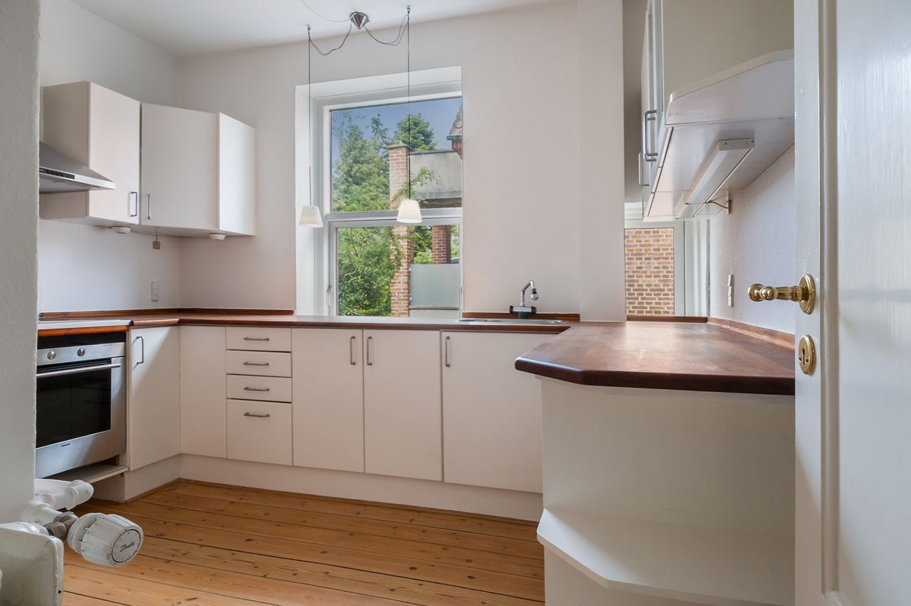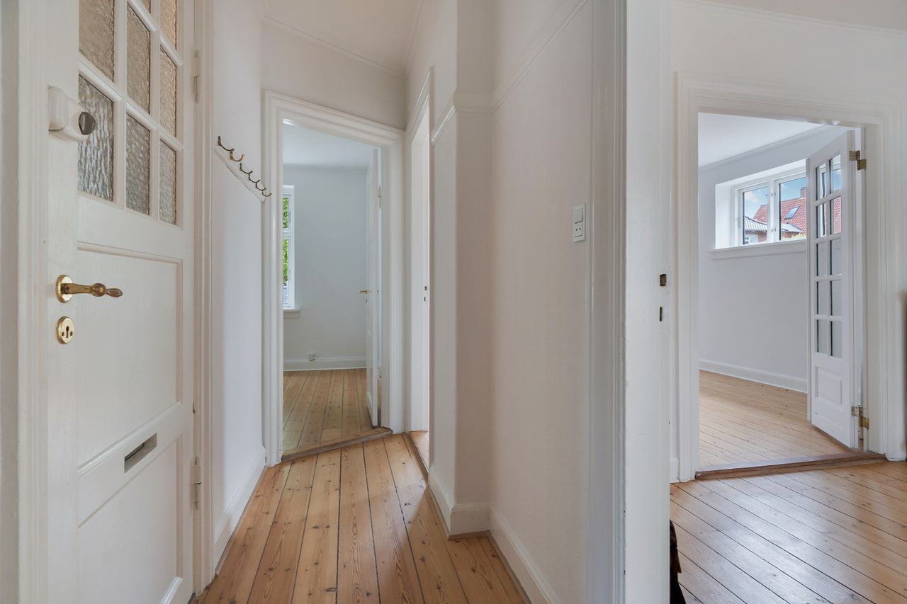 Lejligheden emmer af charme med højt til loftet og originale træplanker på gulvene, som er gennemgående i hele lejligheden og skaber en sammenhæng mellem rummene. Plankerne er velholdte og behandlet med lak, så de både er slidstærke og nemme at rengøre.