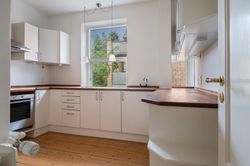 Når du kommer ind i lejligheden, møder du først fordelingsgangen hvorfra du har adgang til alle rum i lejligheden. Mod højre finder du et rummeligt, lyst og velholdt badeværelse med gulvvarme. Ved siden af ligger køkkenet, hvor du med masser af bordplads og opbevaring nemt kan udfolde dine kulinariske evner.