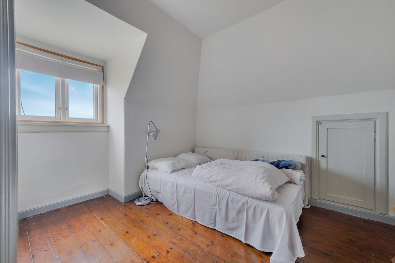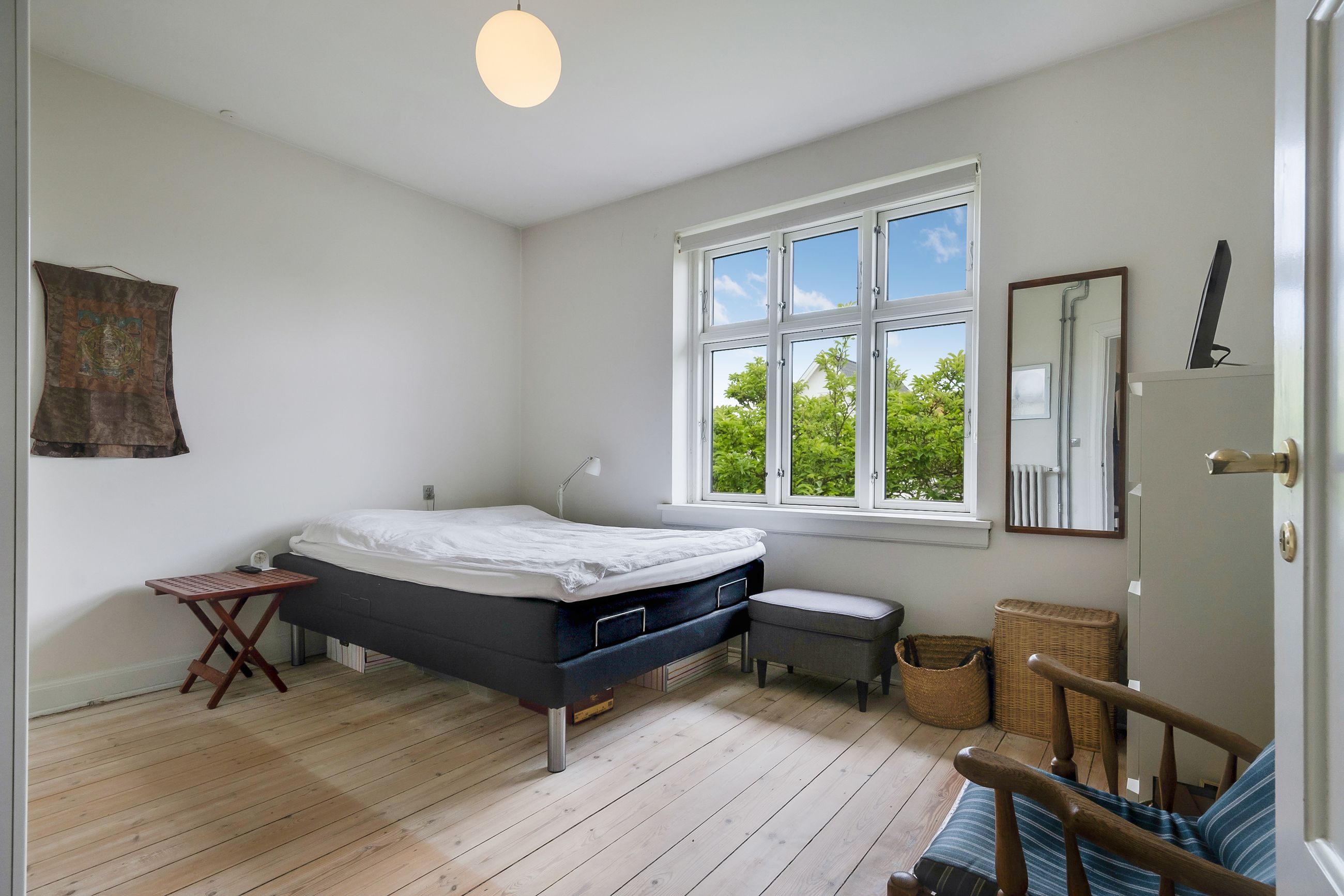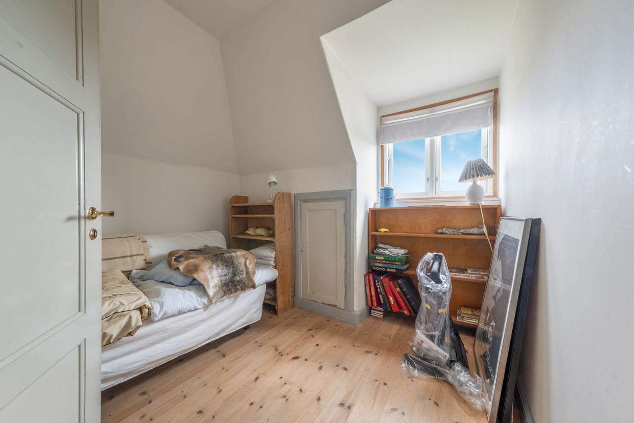 Ved siden af den ene stue finder du et rummeligt soveværelse med et stort vindue, hvorfra du kan opleve