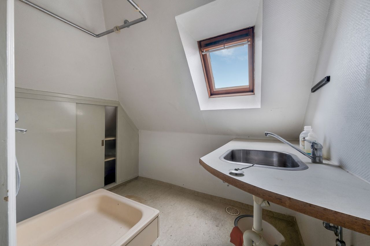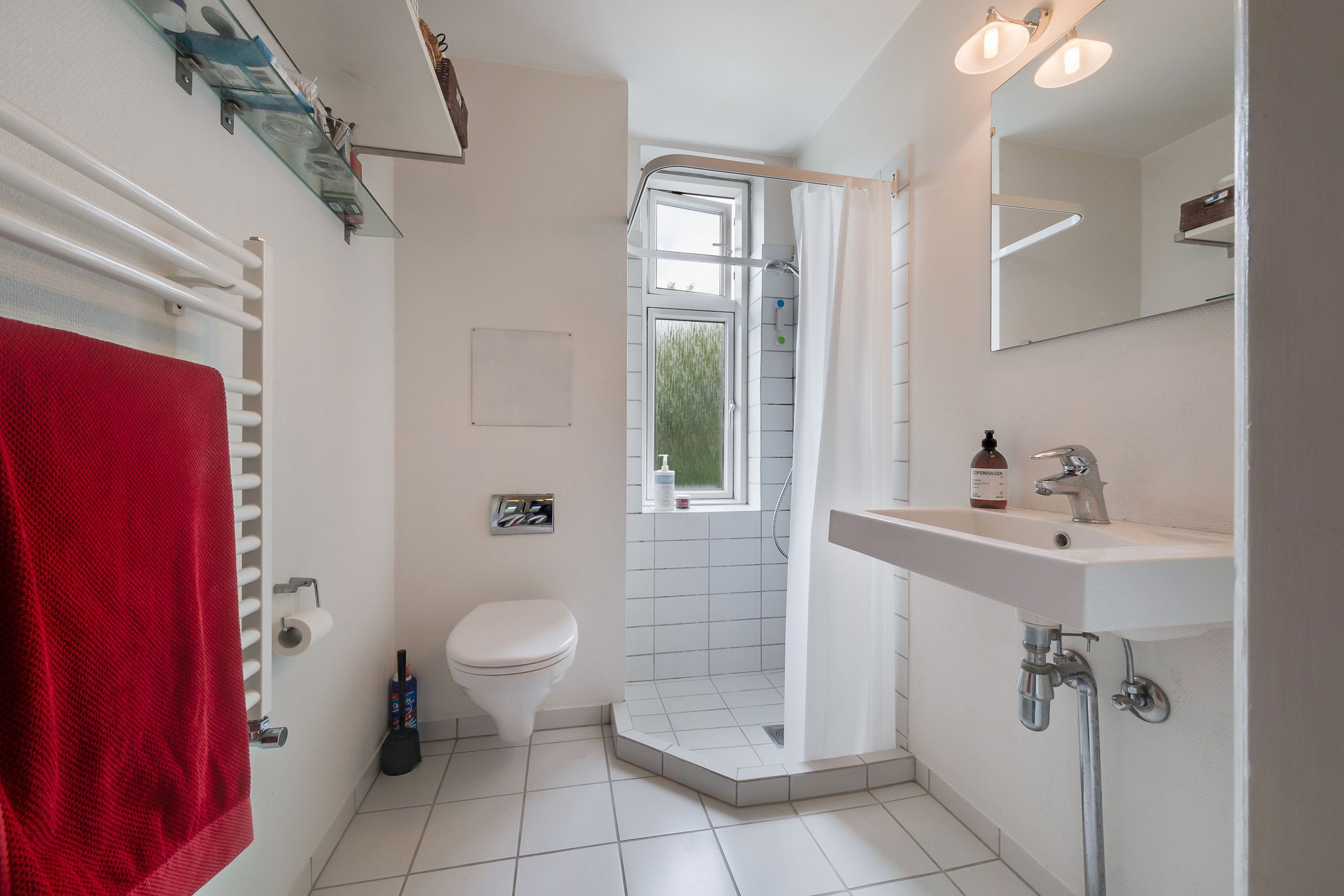 du et badeværelse i god stand med gulvvarme og som er holdt i lyse nuancer. Ved siden af ligger