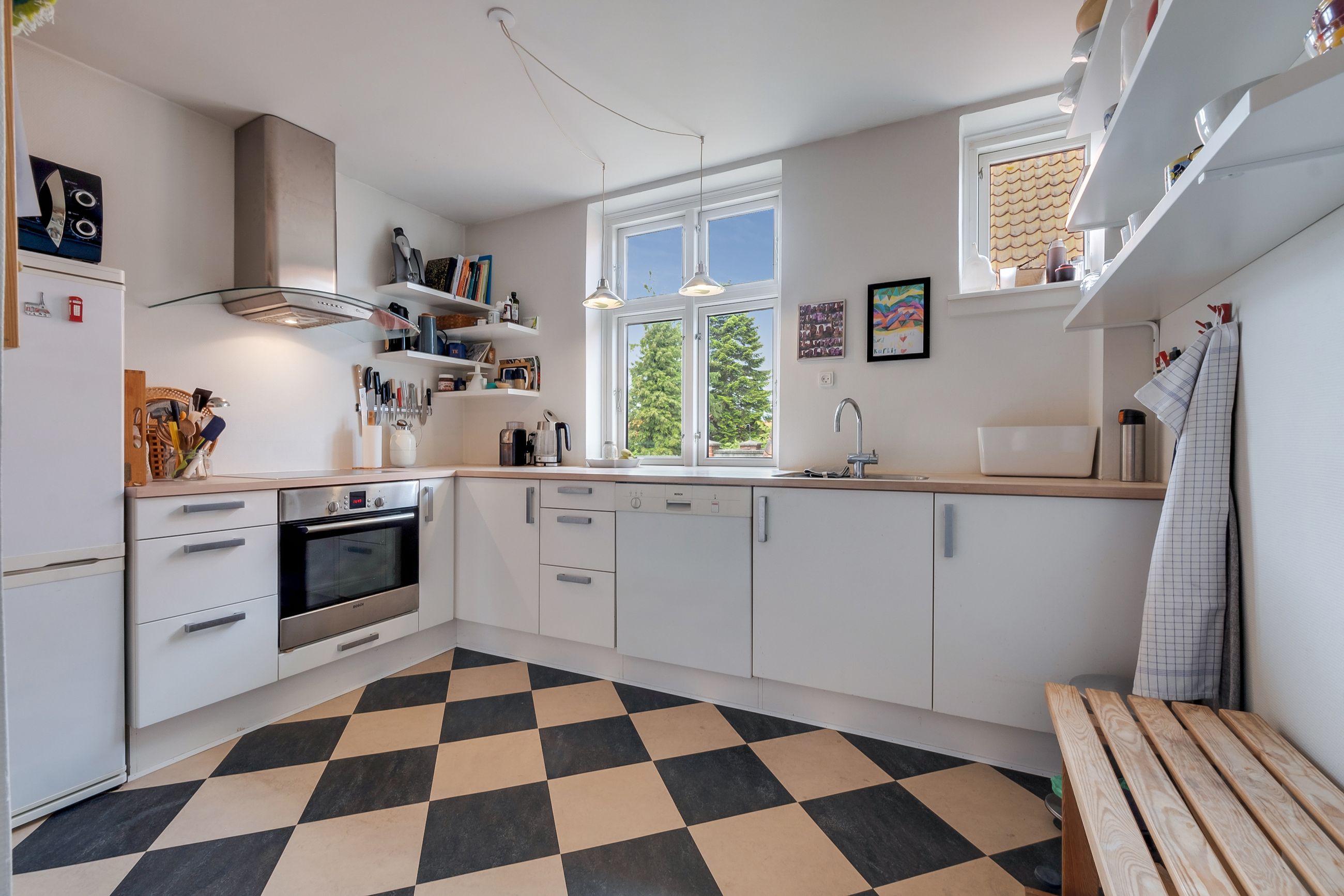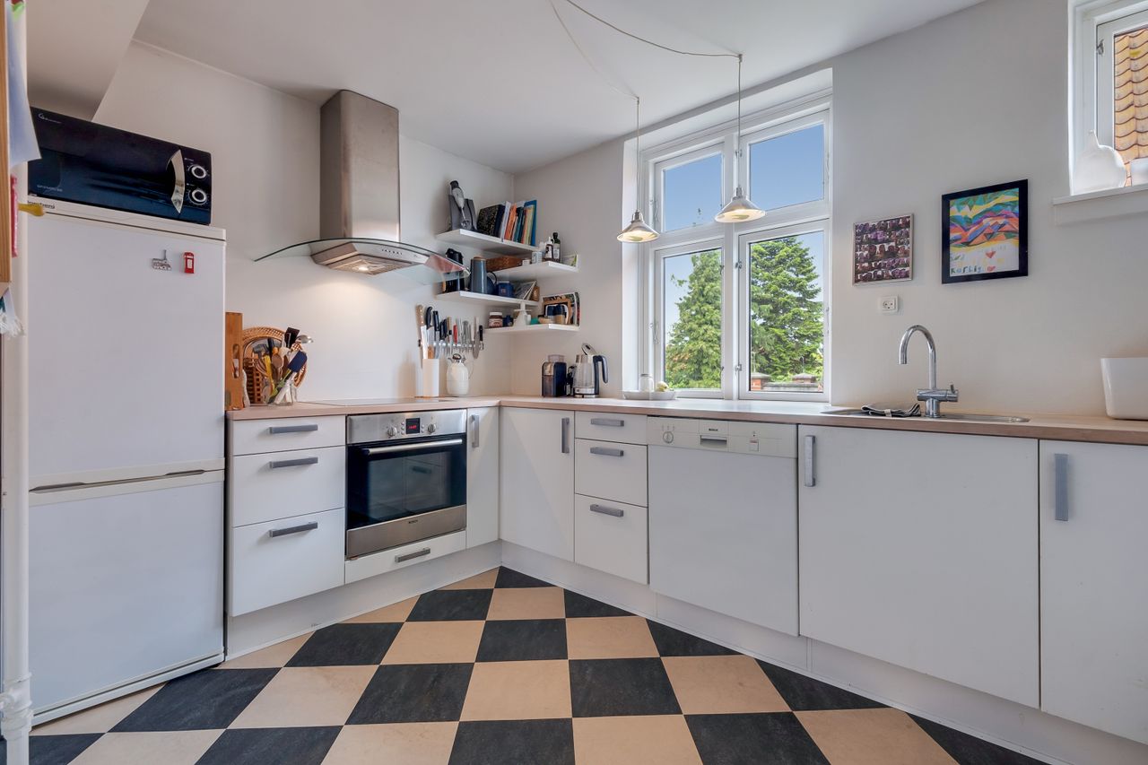 køkkenet, hvor det hyggelige skakternede gulv giver rummet ekstra charme. Køkkenet er fra Svane Køkken