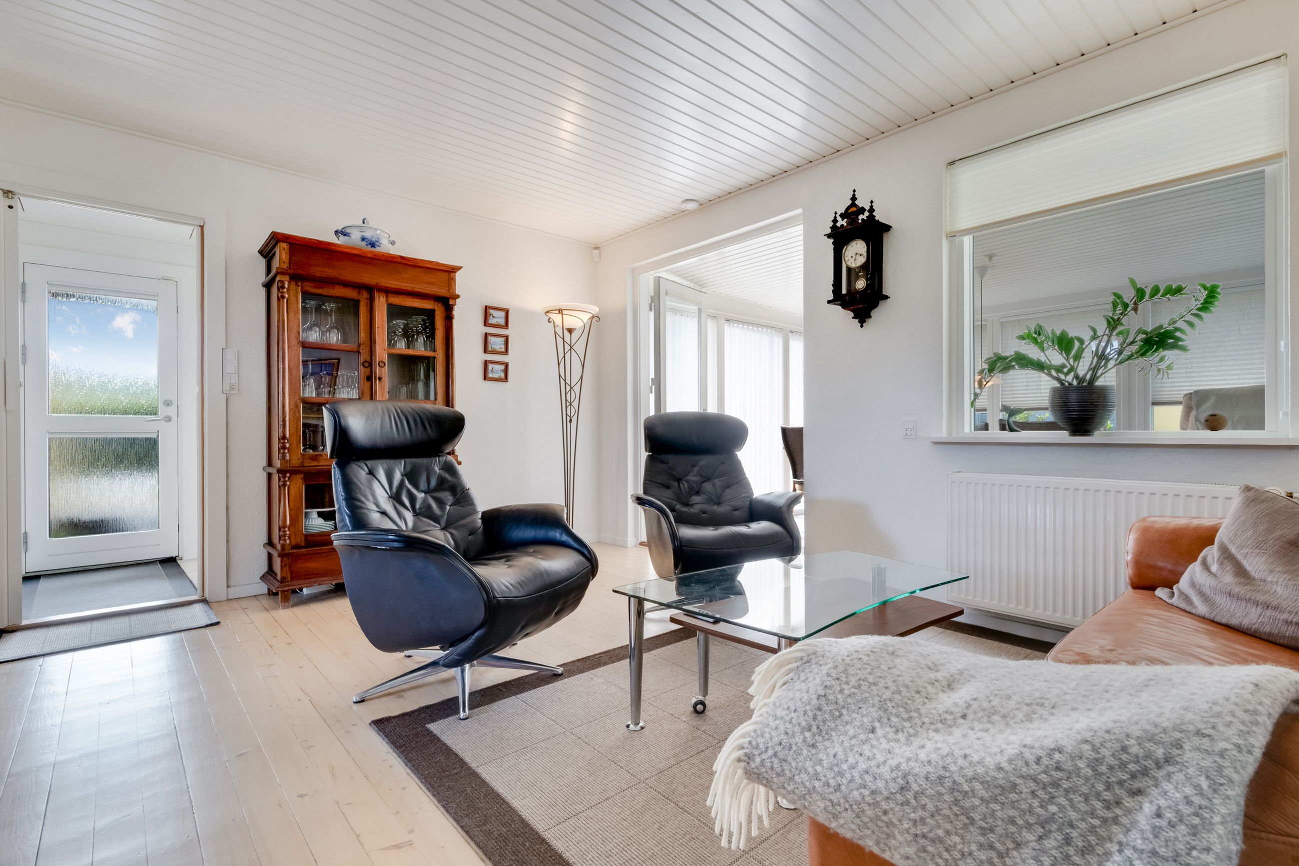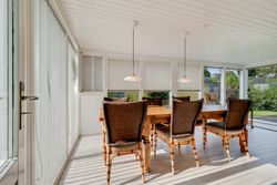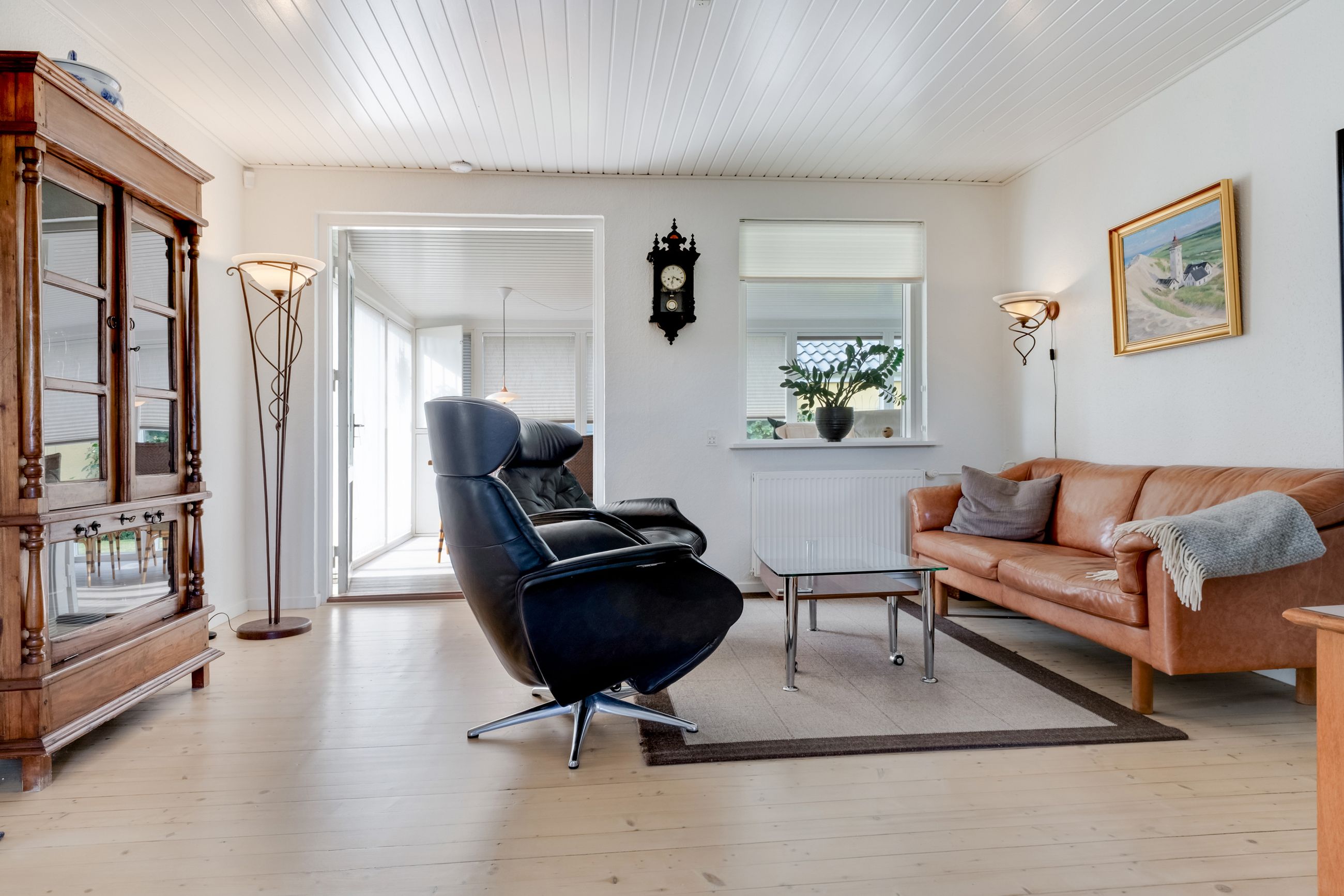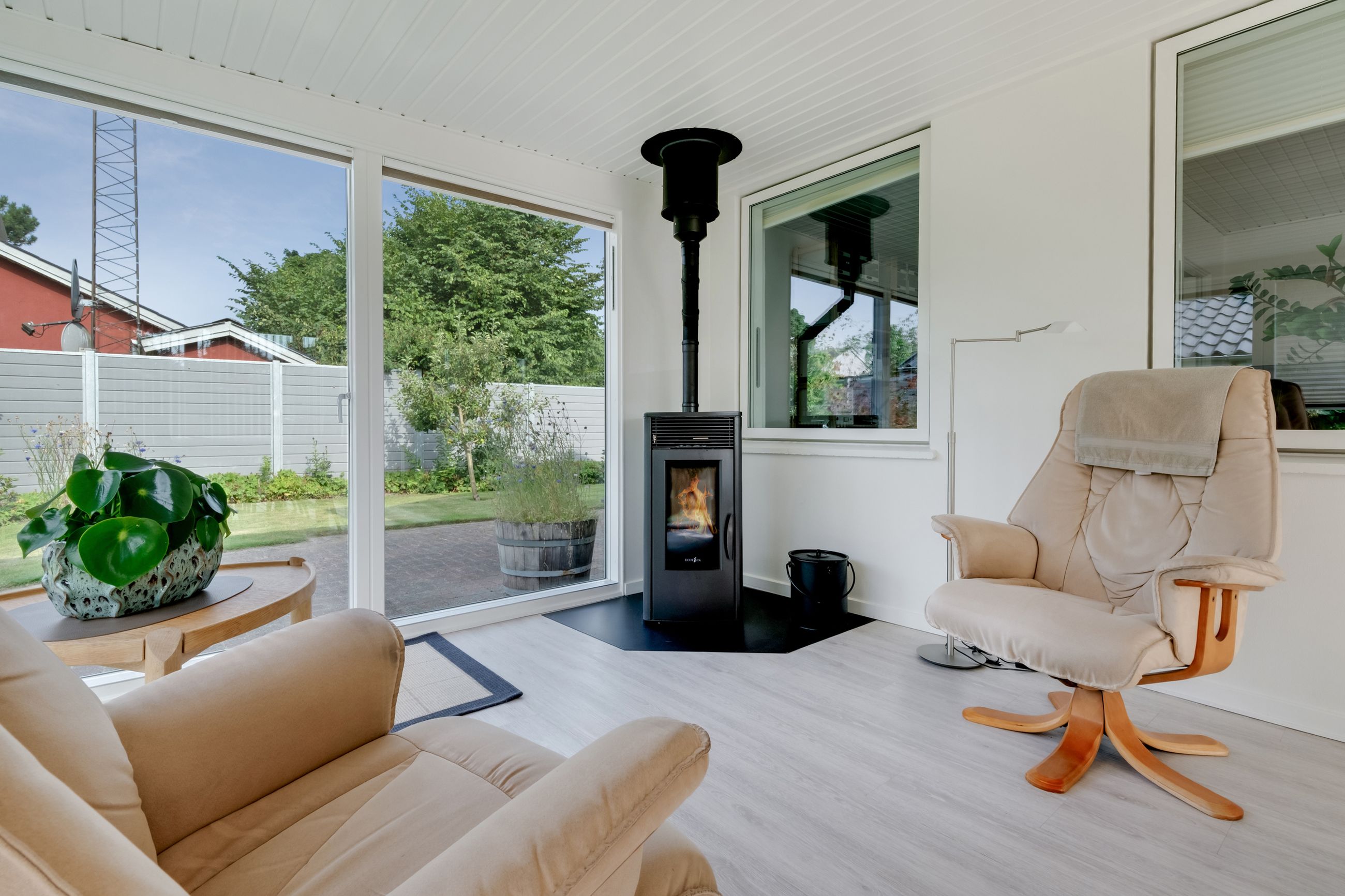 Stuen byder på smukt, afhøvlet og lakeret trægulv. Herfra er der adgang til den fantastiske udestue – et rum med store vinduespartier hele vejen rundt, elegant gulv og en stemningsskabende pillebrændeovn, som gør ophold her muligt året rundt. Her er plads til spisebord, lænestole og rolige stunder med udsigt til haven.
