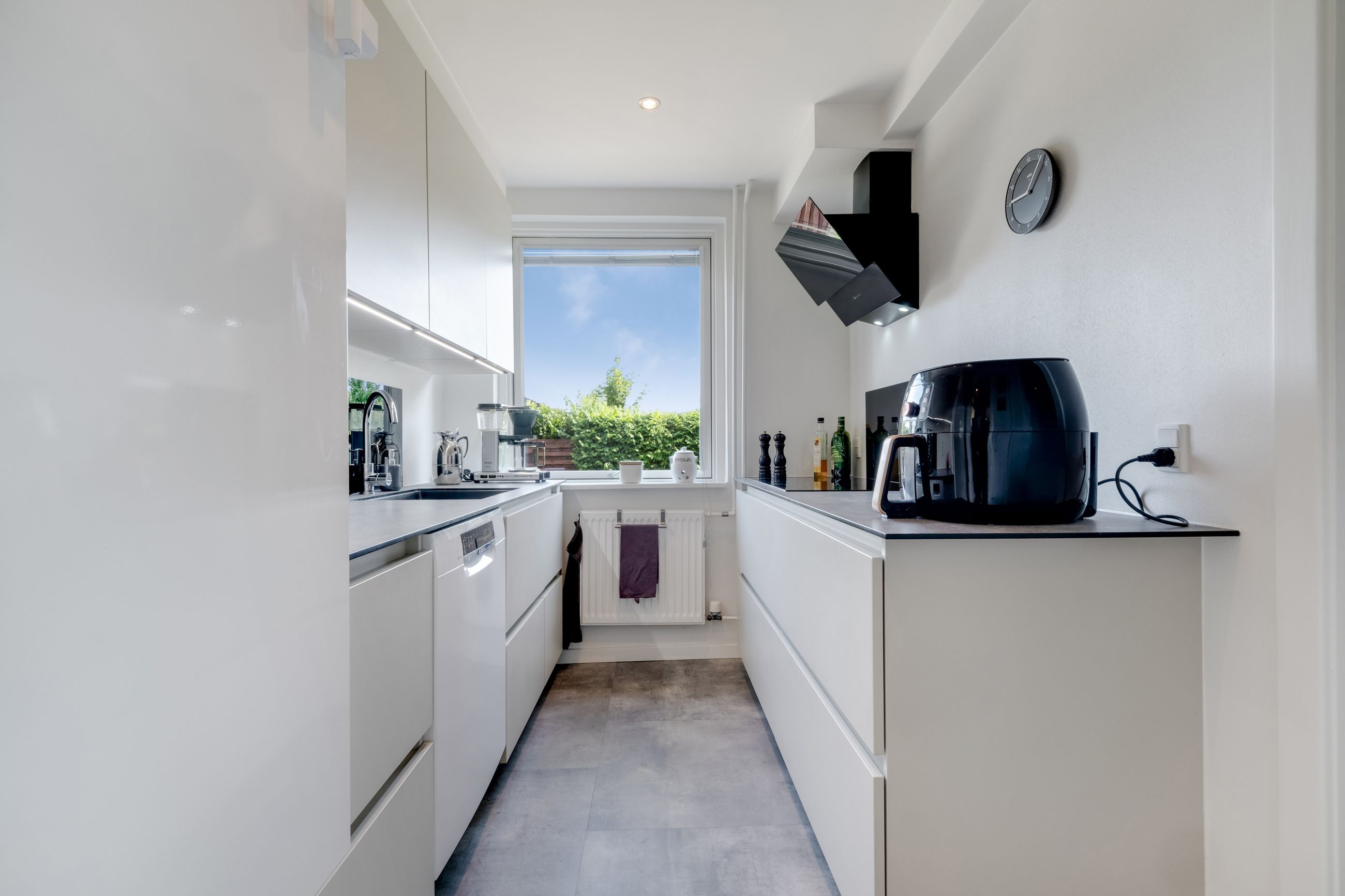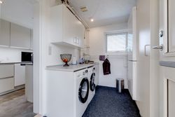 Ved indgangen er der overdække og to separate døre. Den ene leder dig ind i et praktisk bryggers med god bordplads, vaskemaskine, tørretumbler og fryser. Herfra træder du direkte ind i det lyse og moderne køkken fra det tyske mærke Rotpunkt, der byder på gode opbevaringsløsninger i form af skuffer og skabe. Fra bryggerset er der ligeledes adgang til et fint værelse.