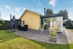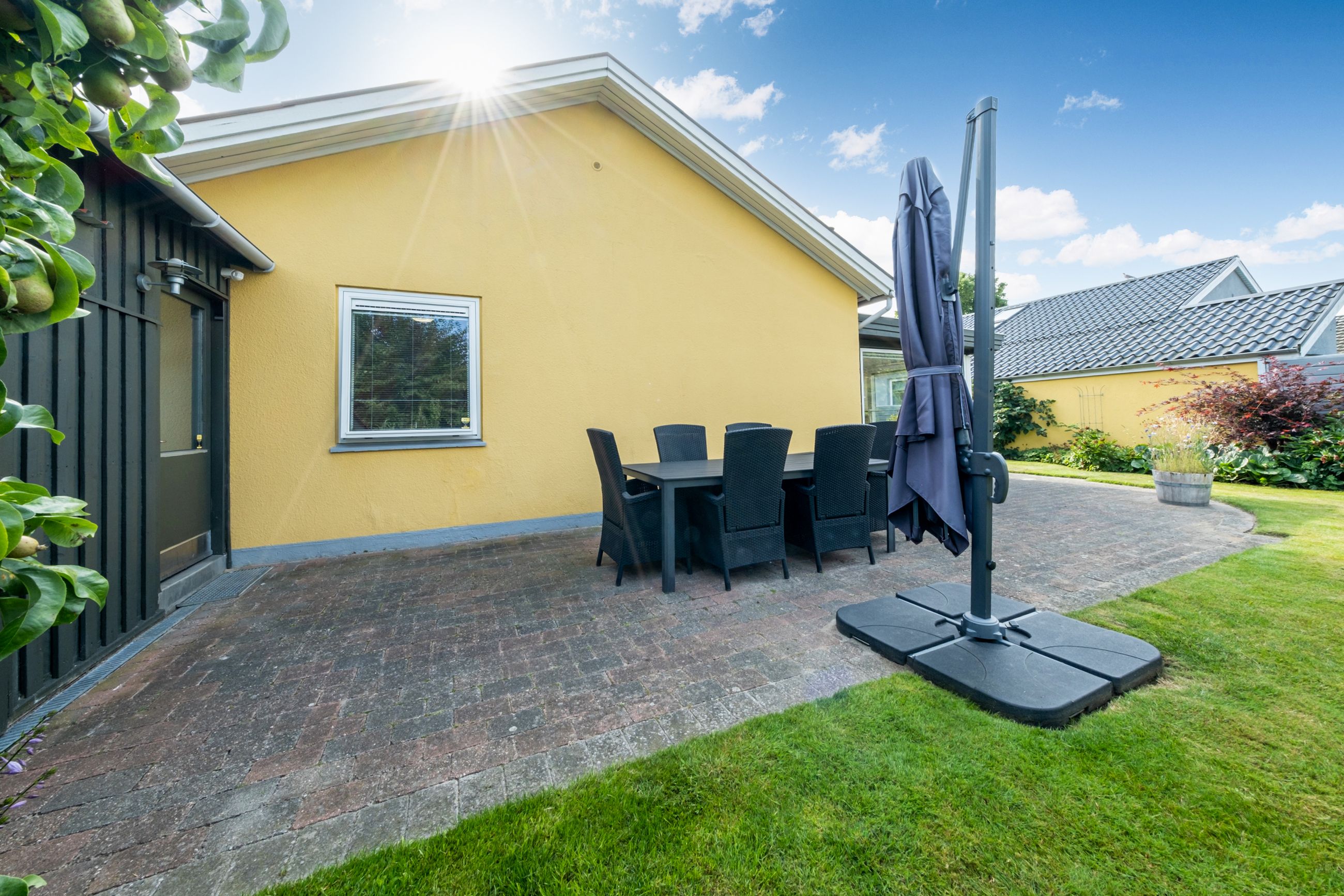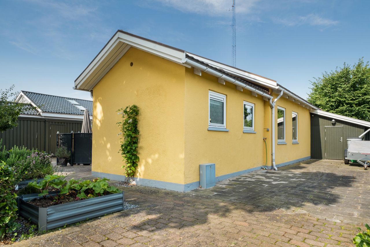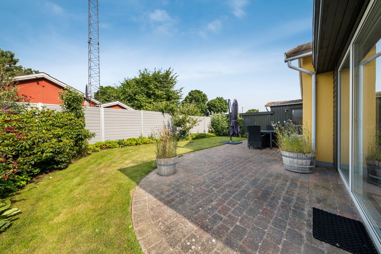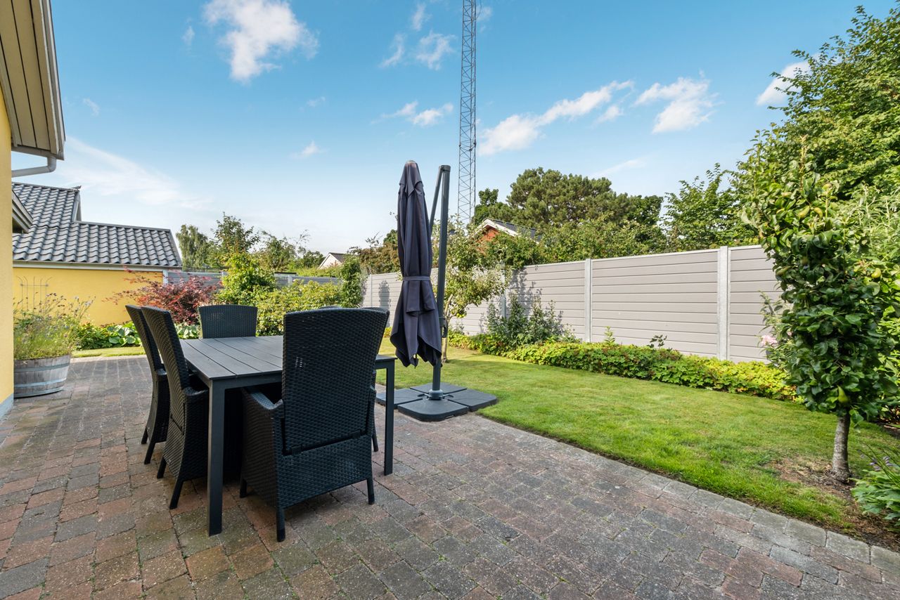 Haven er nem at holde og helt ugeneret. Den store fliseterrasse løber nærmest hele vejen rundt om huset, og der er flere steder at sidde og nyde solen. Her er en græsplæne, enkelte højbede, blomstrende buske og grønne hjørner – nok til at skabe en fredfyldt atmosfære, men ikke mere, end at det er til at overskue.