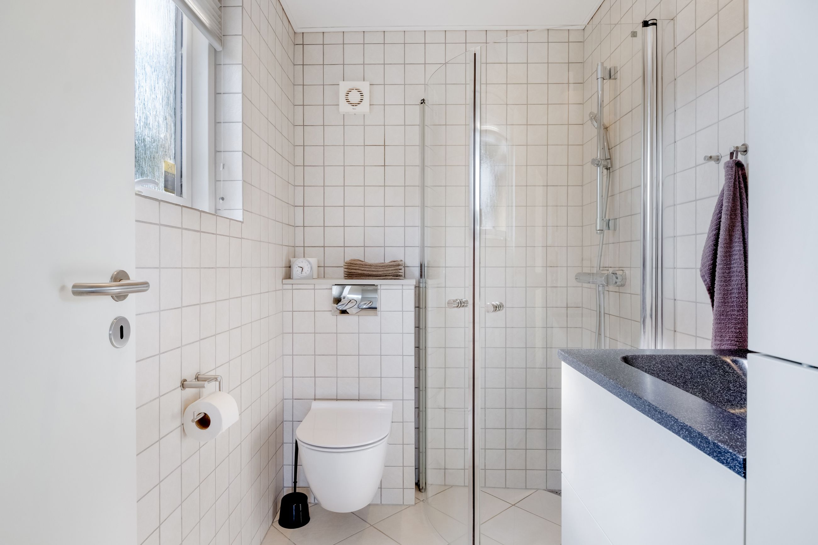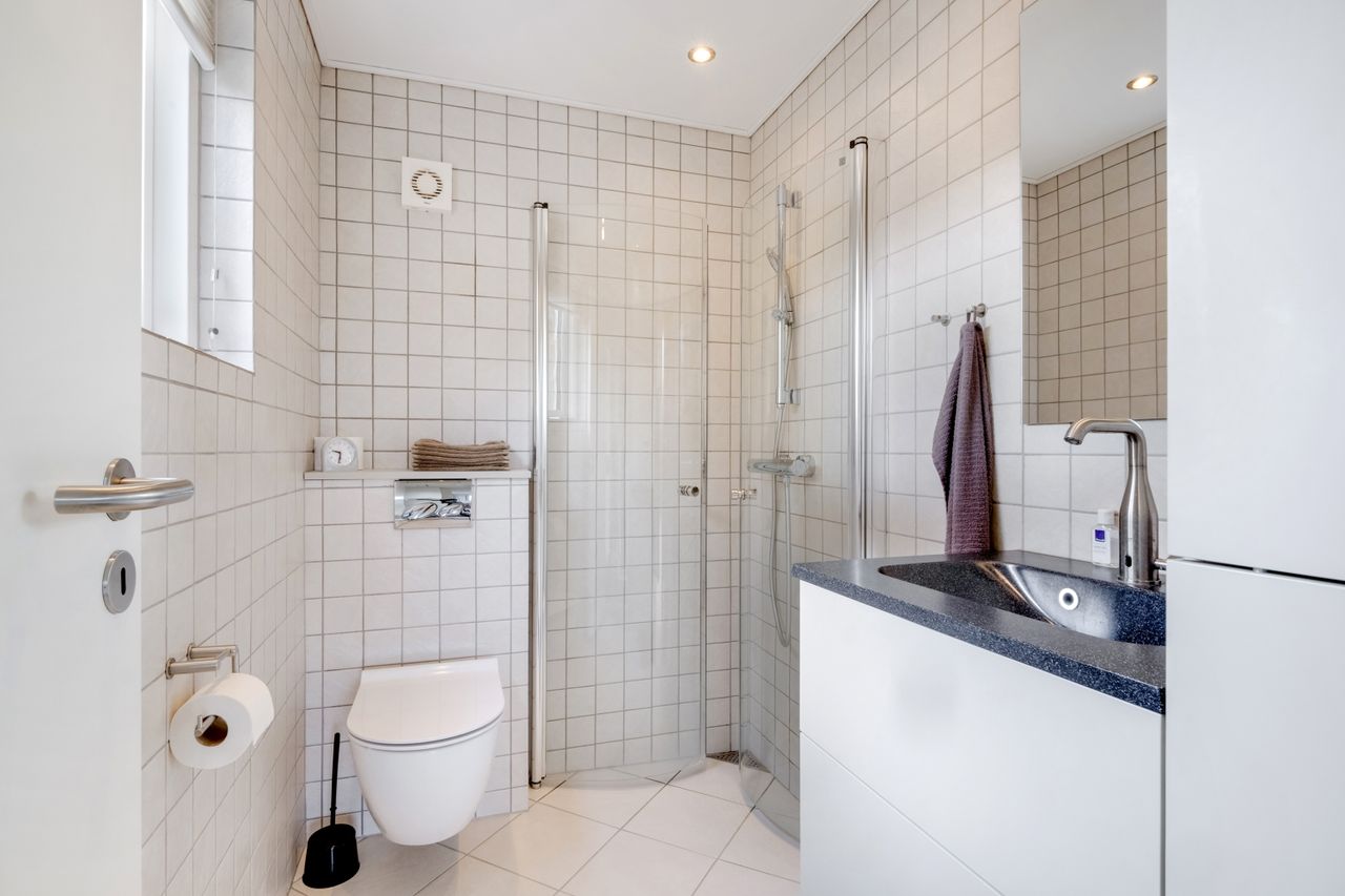 Den anden dør fører ind til entréen, hvor du straks har badeværelset til venstre. Badeværelset er pænt og funktionelt med lyse fliser, væghængt toilet, lyst vaskemøbel og bruseniche bag glasafskærmning.