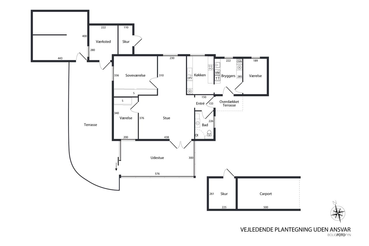 Udendørs får du mange muligheder. Her er både et værksted og flere skure – oplagt til opbevaring, værktøj og piller til brændeovenen. Her er også en carport.
