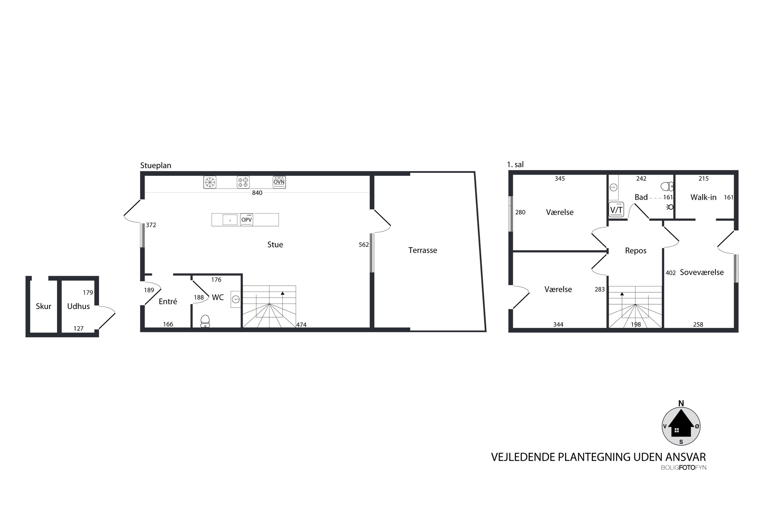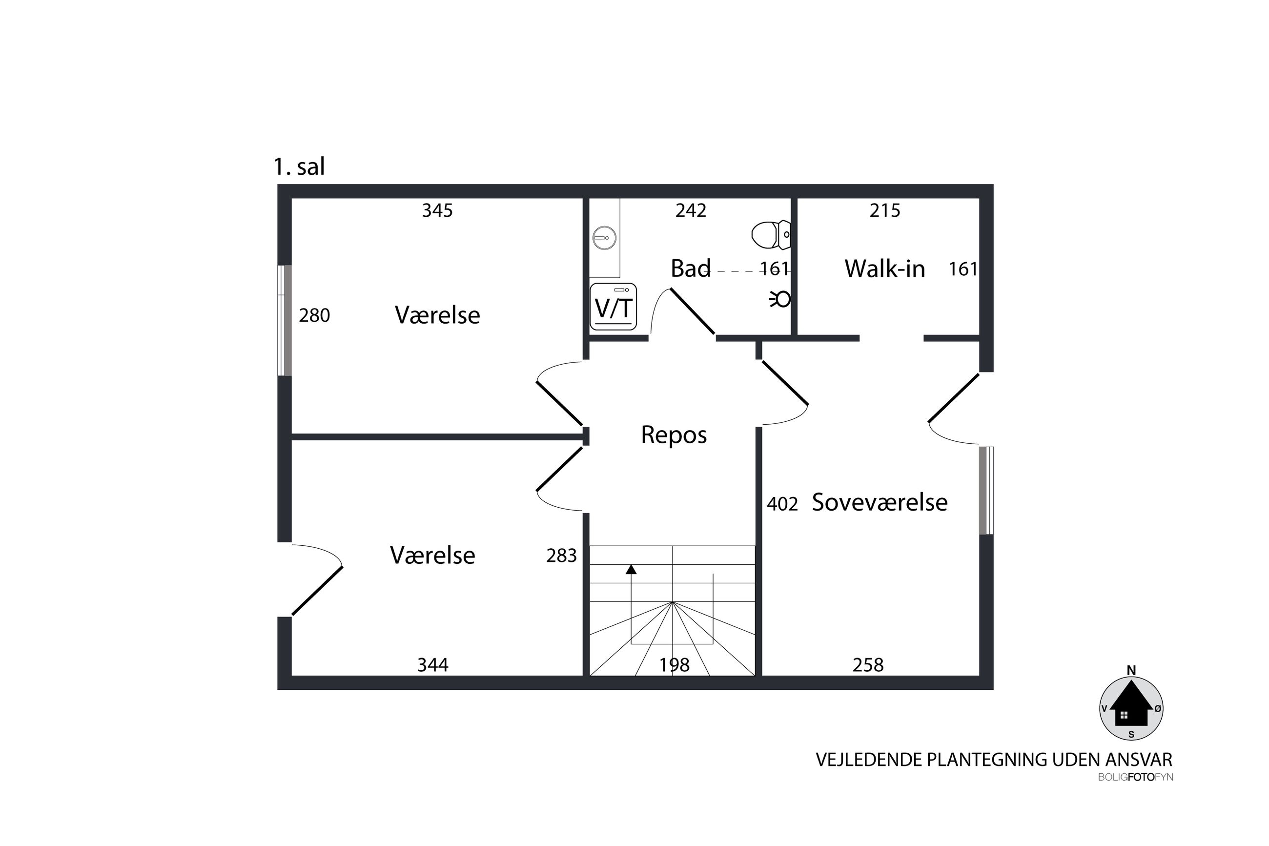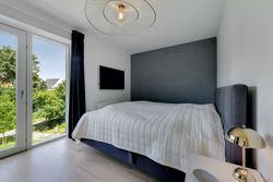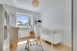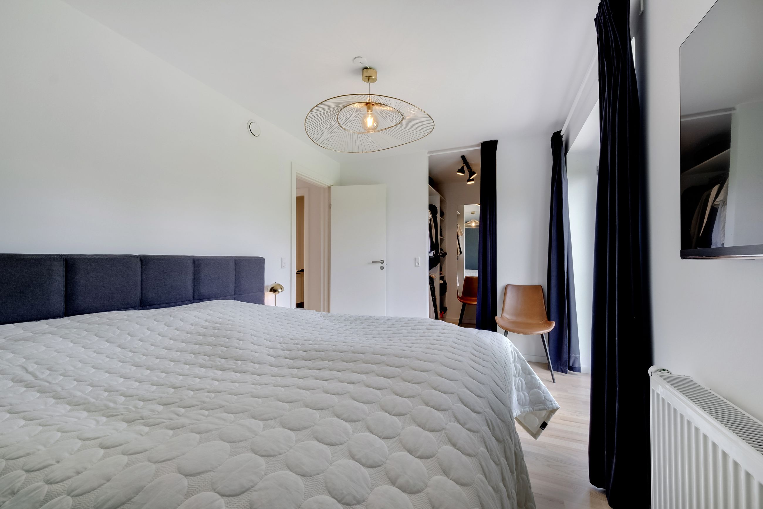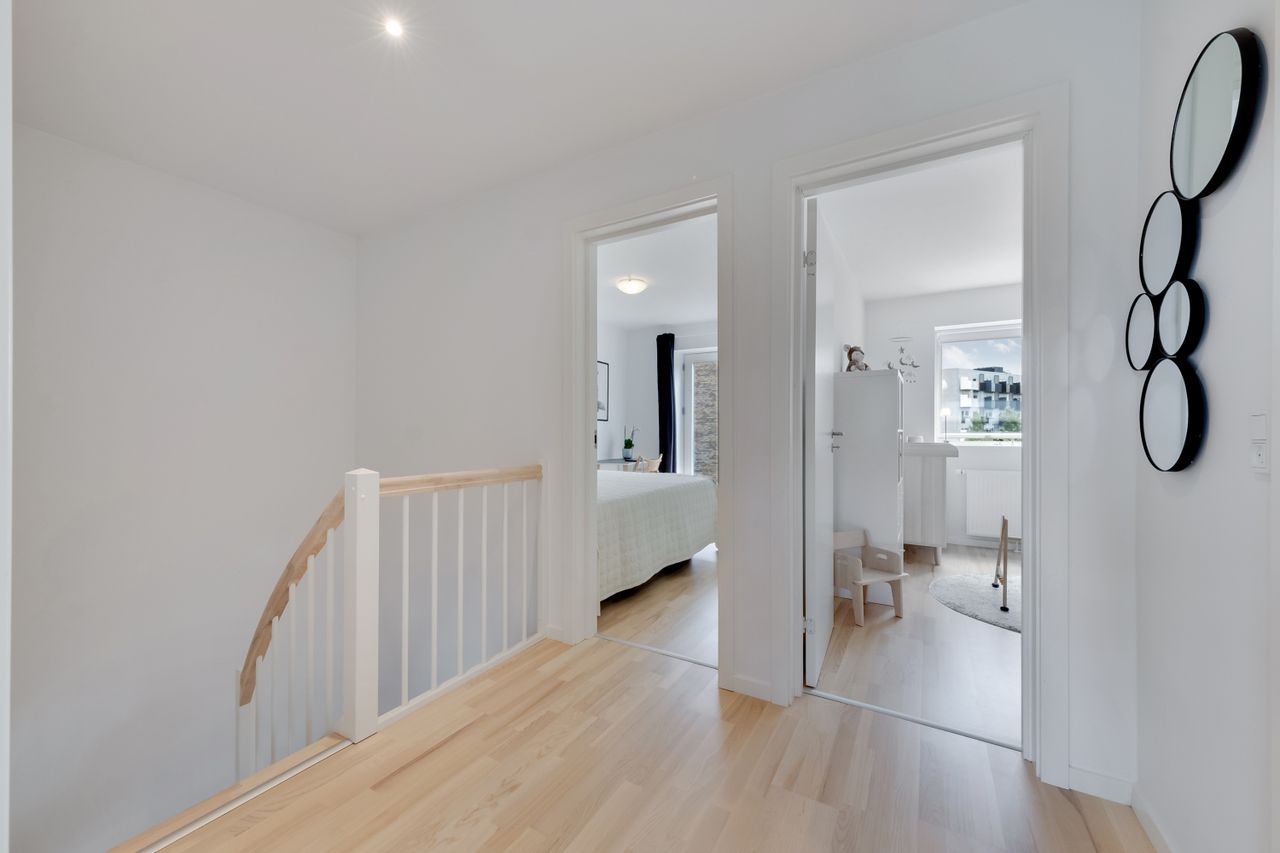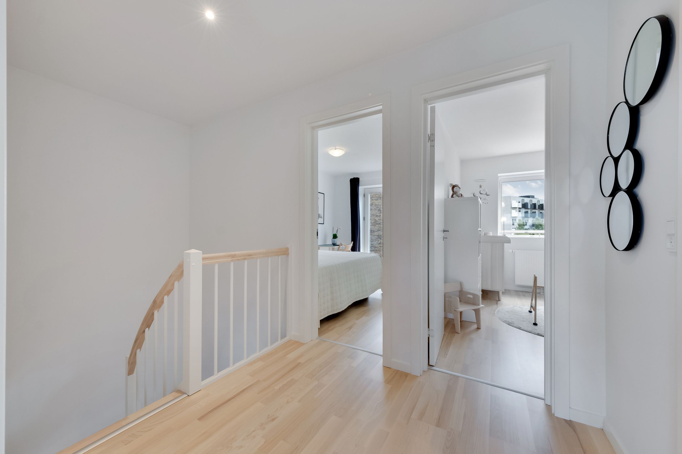 På førstesalen finder du et rummeligt repos og tre gode værelser – to med store glaspartier og franske altaner i glas. Et af værelserne har walk-in. Badeværelset er lyst og funktionelt med vaskefaciliteter, væghængt toilet og bruseniche med stilren glasafskærmning.