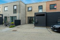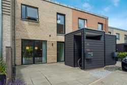 Rækkehuset er opført i 2020 og fordeler sig på to plan. Huset tilbyder, som et af de eneste huse i området, mulighed for parkering af to biler - der er sågar klargjort til opsætning af ladeboks til elbiler.