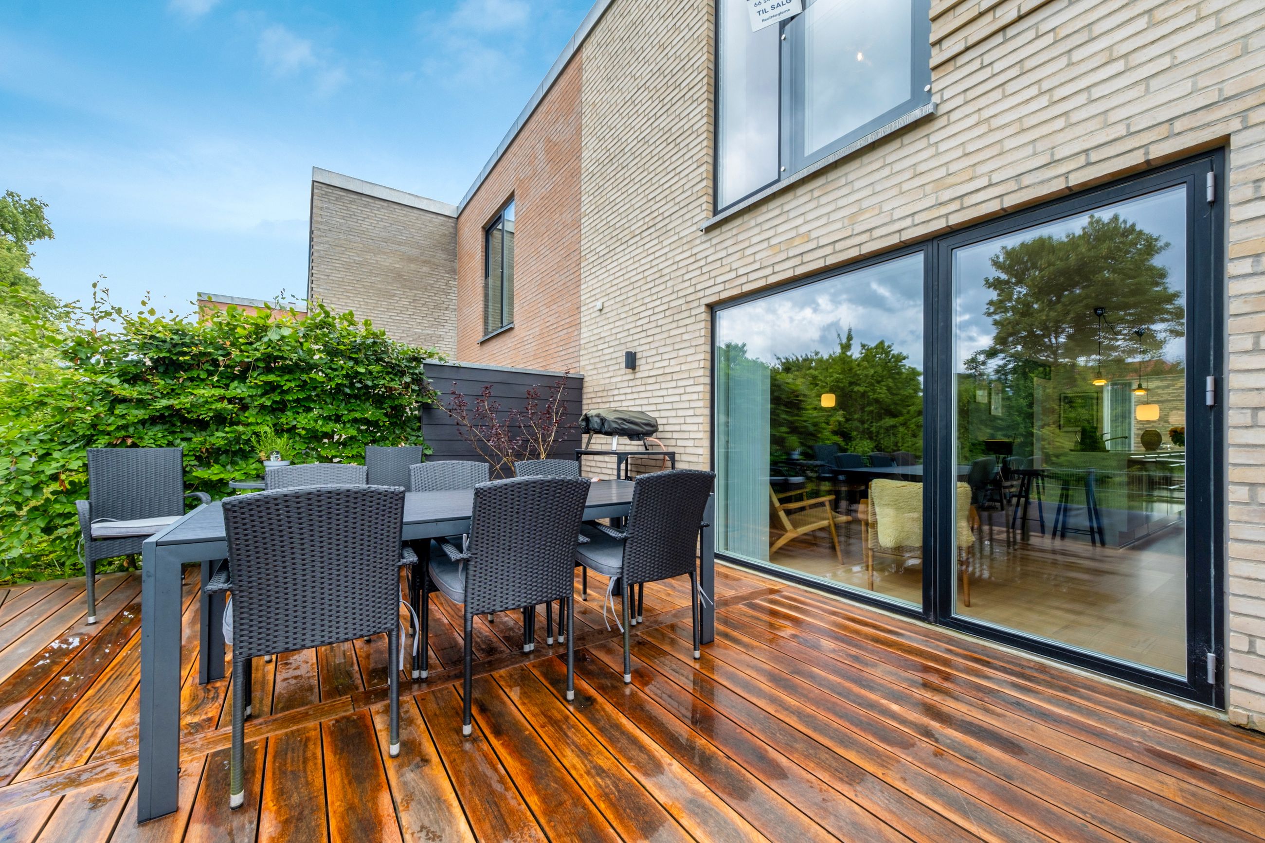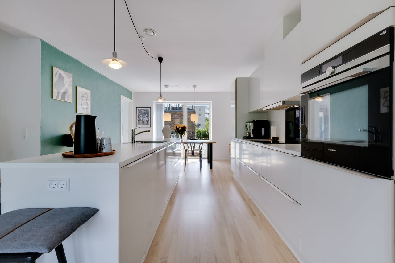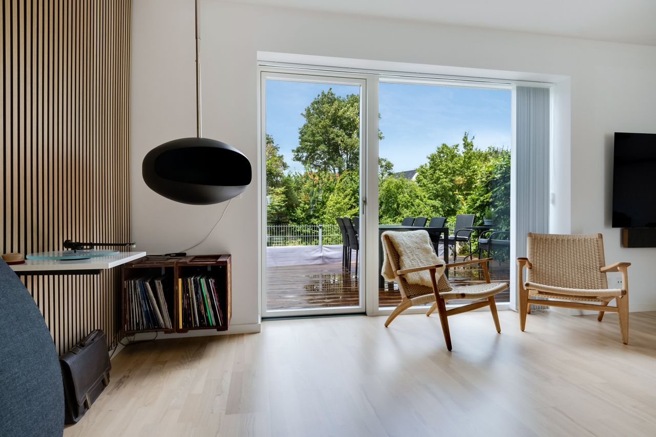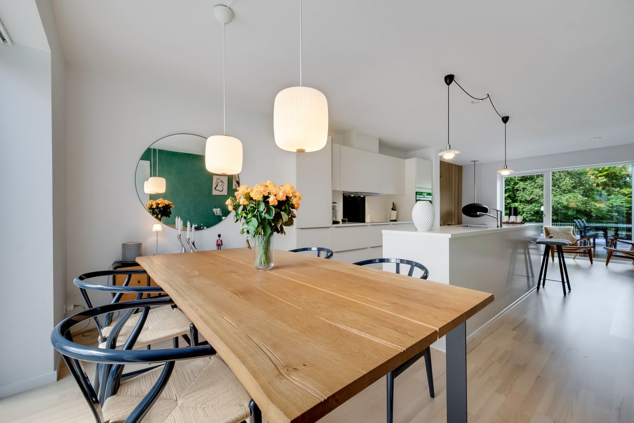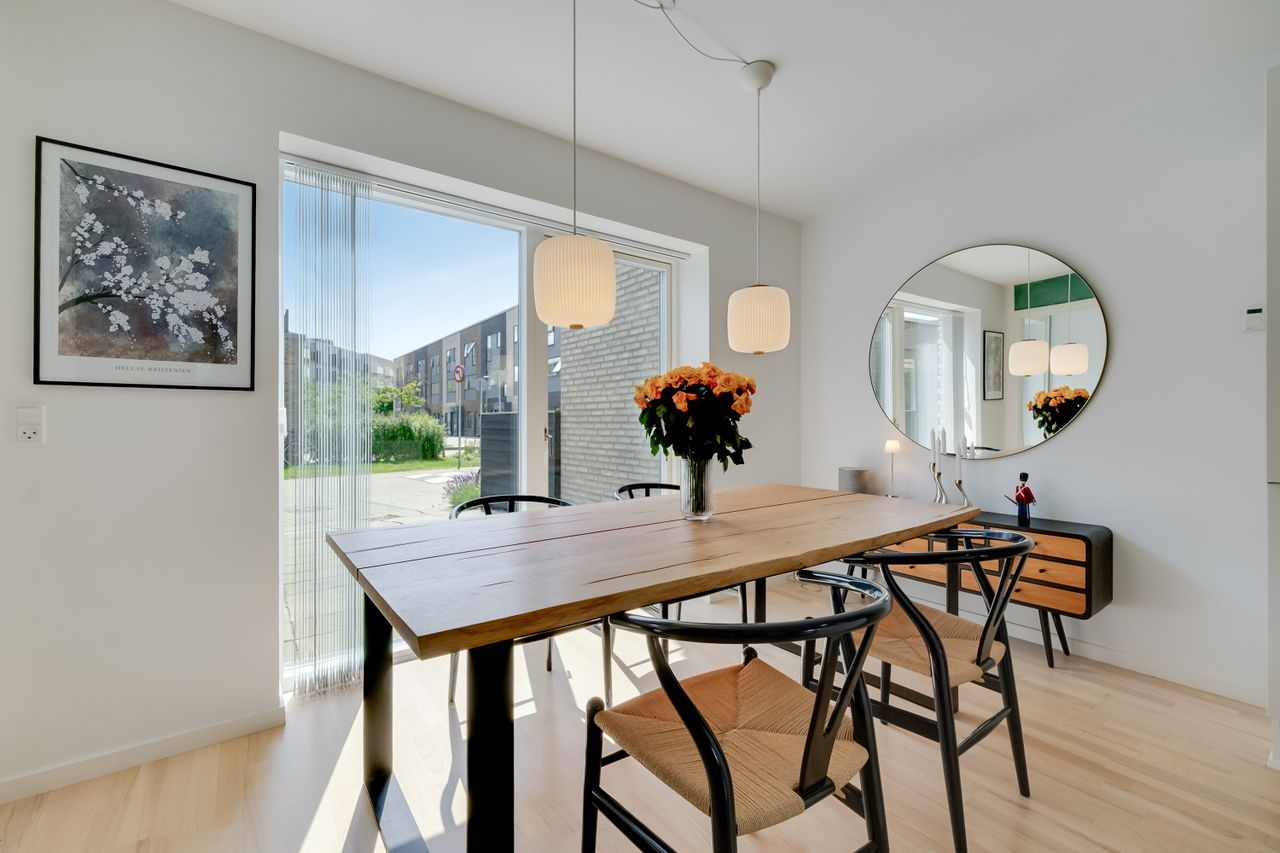 Køkken-alrummet er hjemmets hjerte, med smukt trægulv og et fantastisk lysindfald fra de store vinduespartier i begge ender. Her er god plads til både spise- og sofaafdeling. Køkkenet fra HTH står skarpt i hvidt, med ovn i god arbejdshøjde og en stor køkkenø, hvor familien kan samles – nogle på barstole med lektier, andre i gang med at snitte grøntsager. Herfra er der direkte udgang til en hævet træterrasse med udsigt til grønne områder og træer, der skifter farve med årstiderne. Denne terrasse udvider køkkenalrummet og gør det let at rykke måltider og hygge ud i det fri. Her er plads til både havemøbler, leg og afslapning – og uden en stor have at vedligeholde.