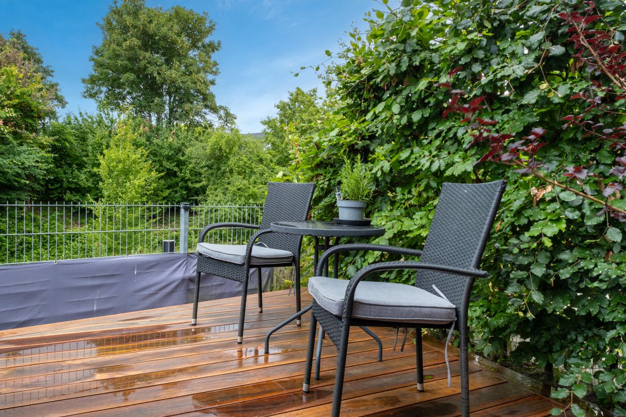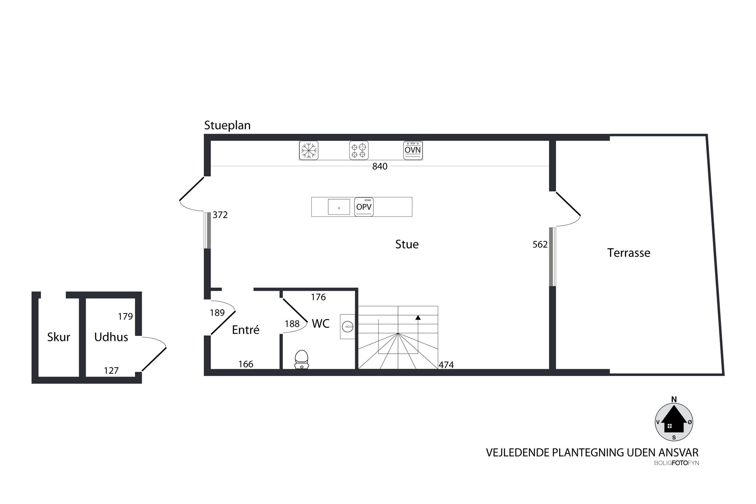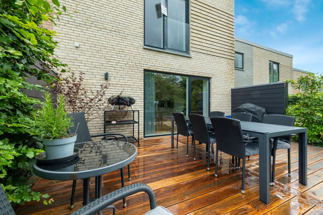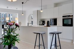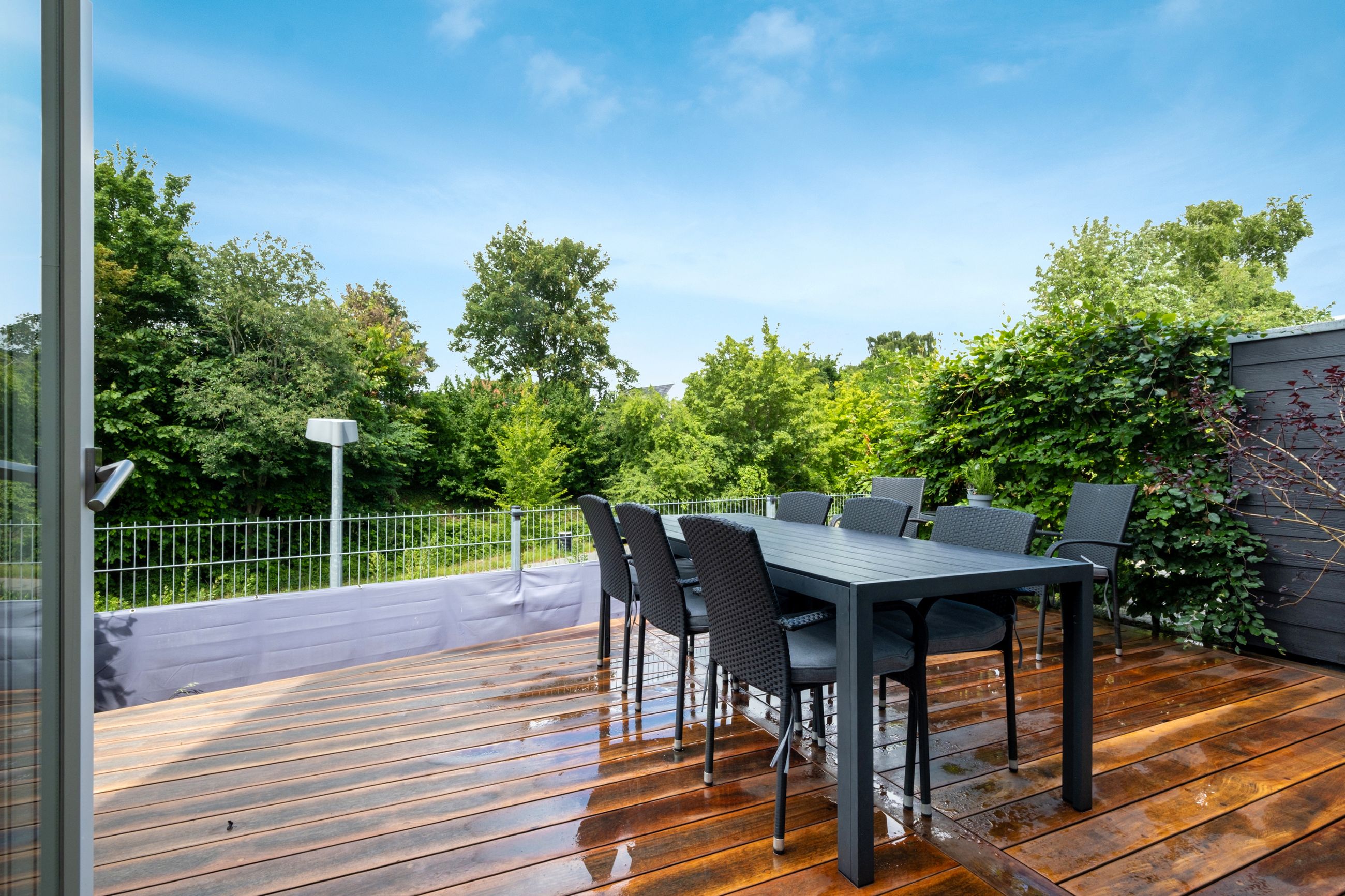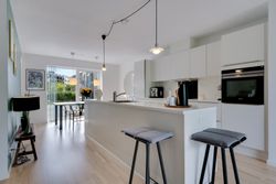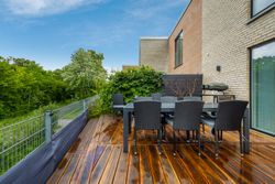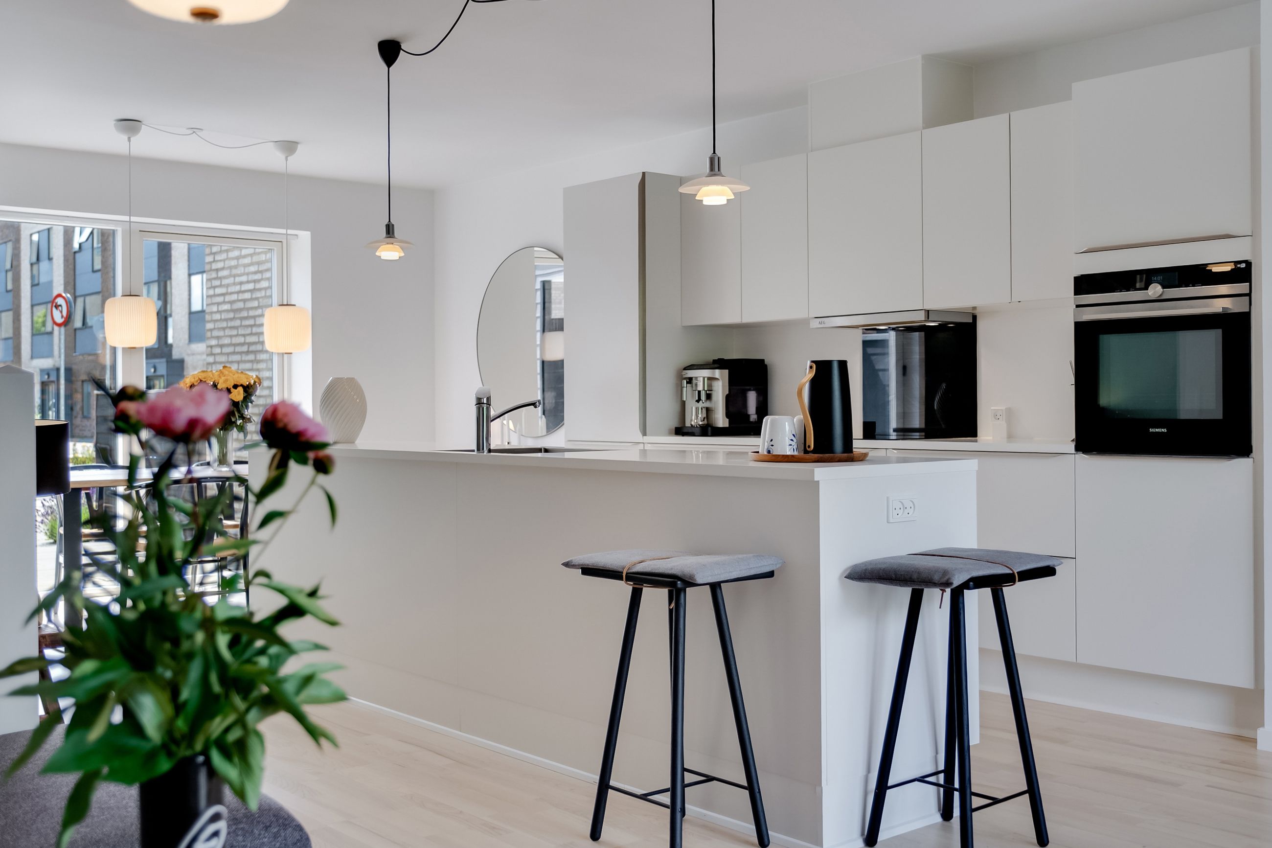 Køkken-alrummet er hjemmets hjerte, med smukt trægulv og et fantastisk lysindfald fra de store vinduespartier i begge ender. Her er god plads til både spise- og sofaafdeling. Køkkenet fra HTH står skarpt i hvidt, med ovn i god arbejdshøjde og en stor køkkenø, hvor familien kan samles – nogle på barstole med lektier, andre i gang med at snitte grøntsager. Herfra er der direkte udgang til en hævet træterrasse med udsigt til grønne områder og træer, der skifter farve med årstiderne. Denne terrasse udvider køkkenalrummet og gør det let at rykke måltider og hygge ud i det fri. Her er plads til både havemøbler, leg og afslapning – og uden en stor have at vedligeholde.