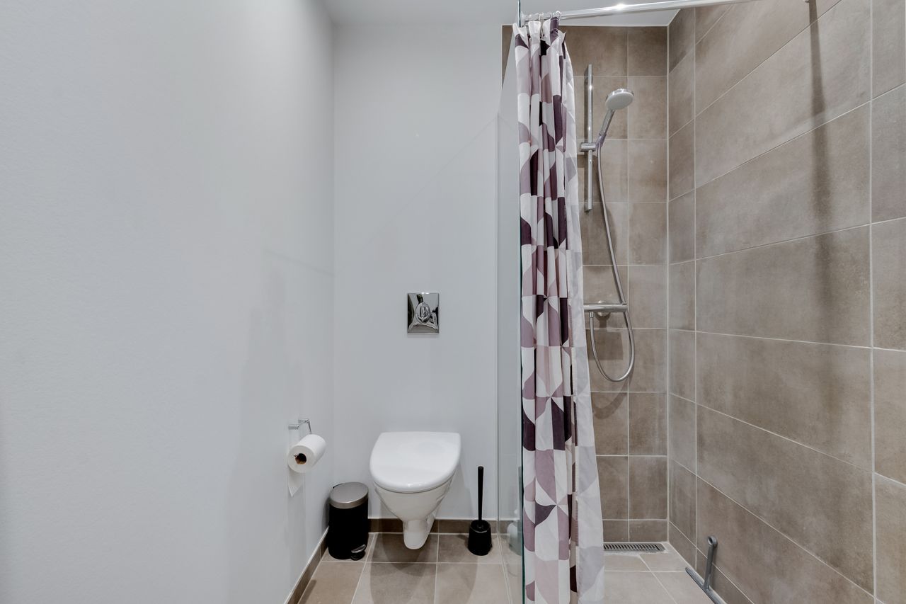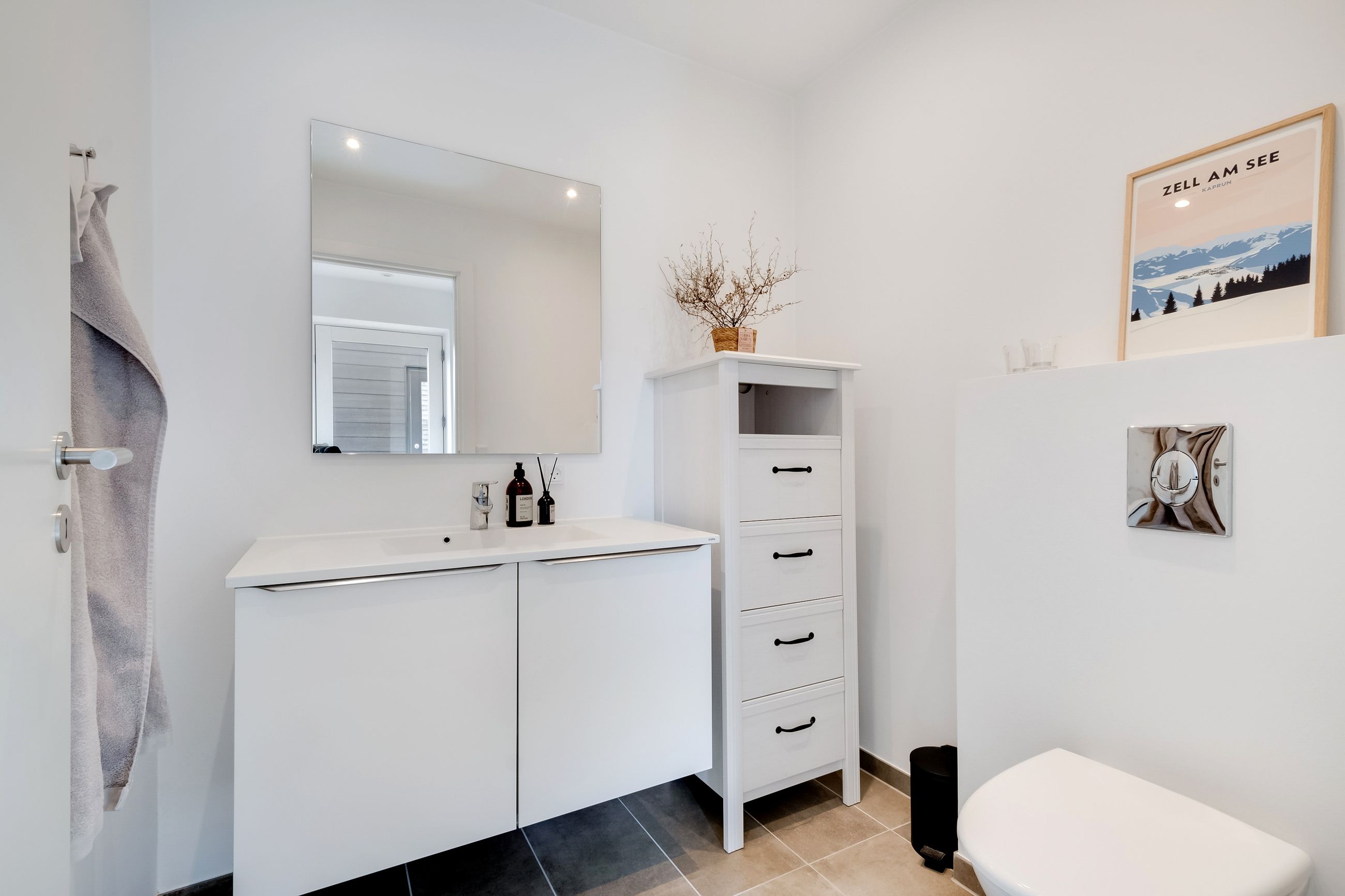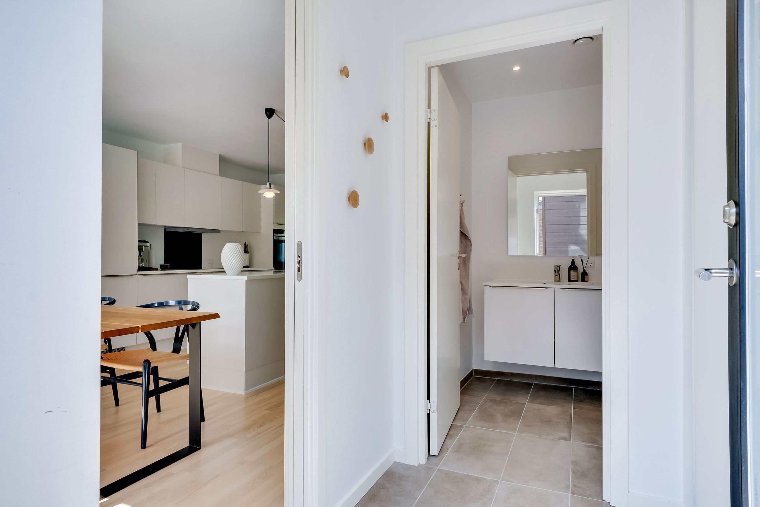 Allerede i entréen mærker du, at hjemmet er nyt og gennemtænkt. Her er smukke klinker, lyse overflader og kig direkte til alrummet. Lige fremme ligger gæstetoilettet med væghængt toilet og samme stilrene klinker – naturligvis med gulvvarme som i resten af stueetagen.
