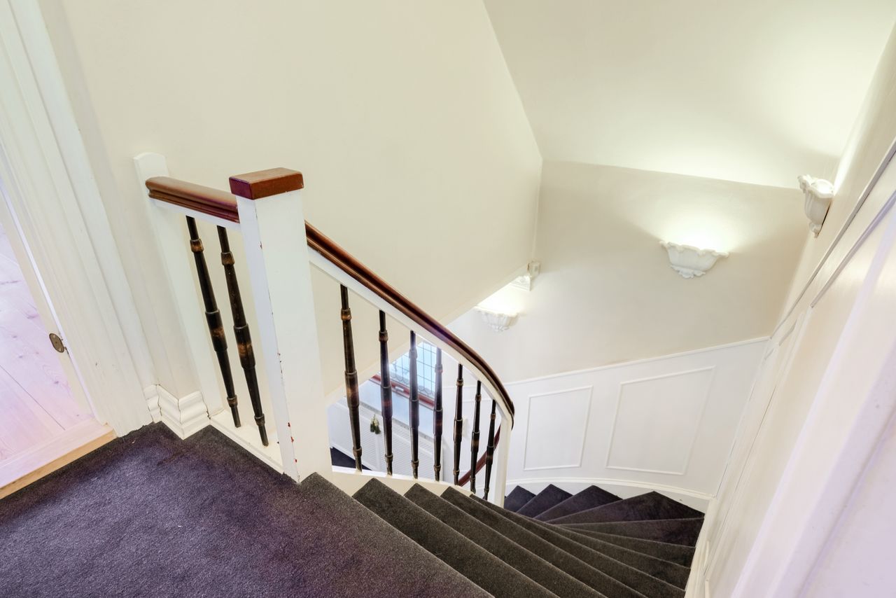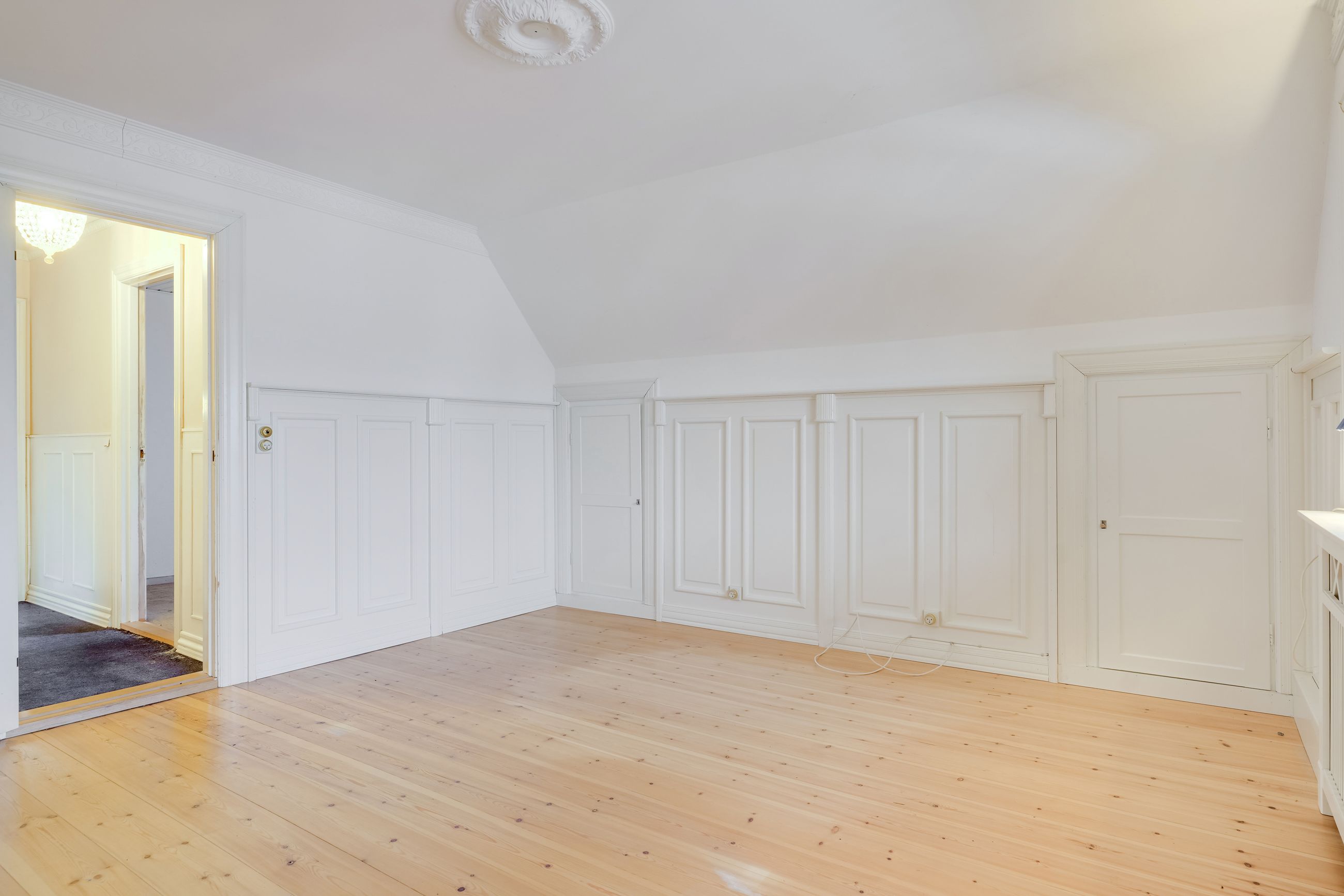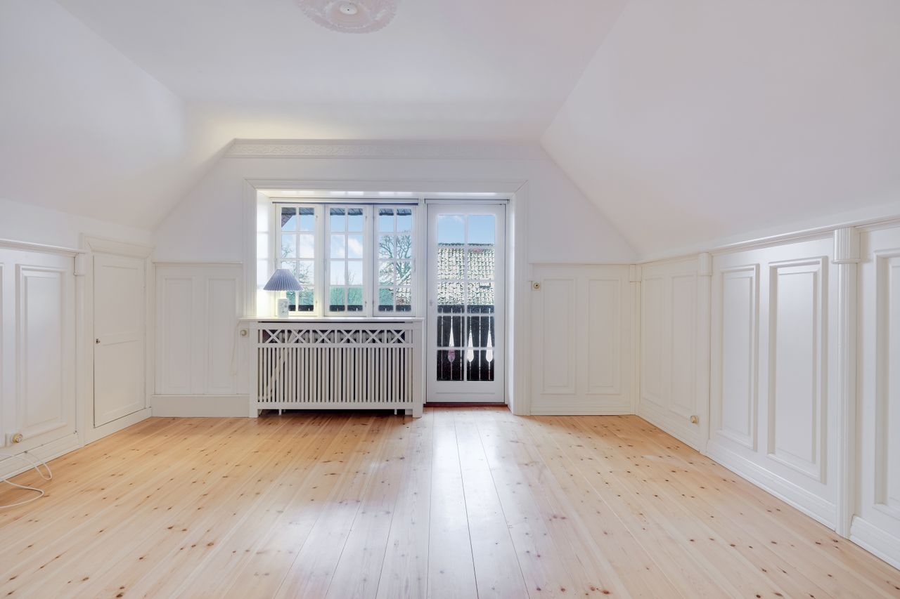 Fra entréen fører trappen både til førstesalen og til kælderen. På førstesalen finder du to gode værelser, et mindre værelse og et badeværelse med badekar. Det ene værelse har smukke plankegulve, elegante paneler og udgang til en overdækket altan.