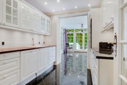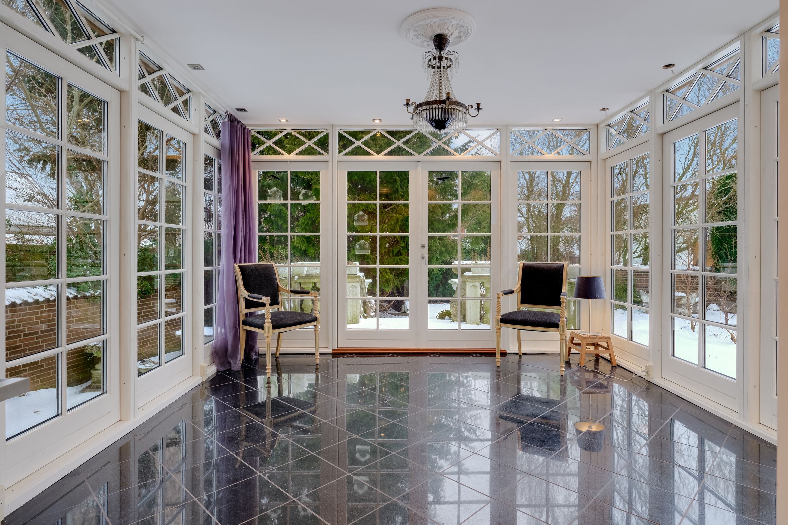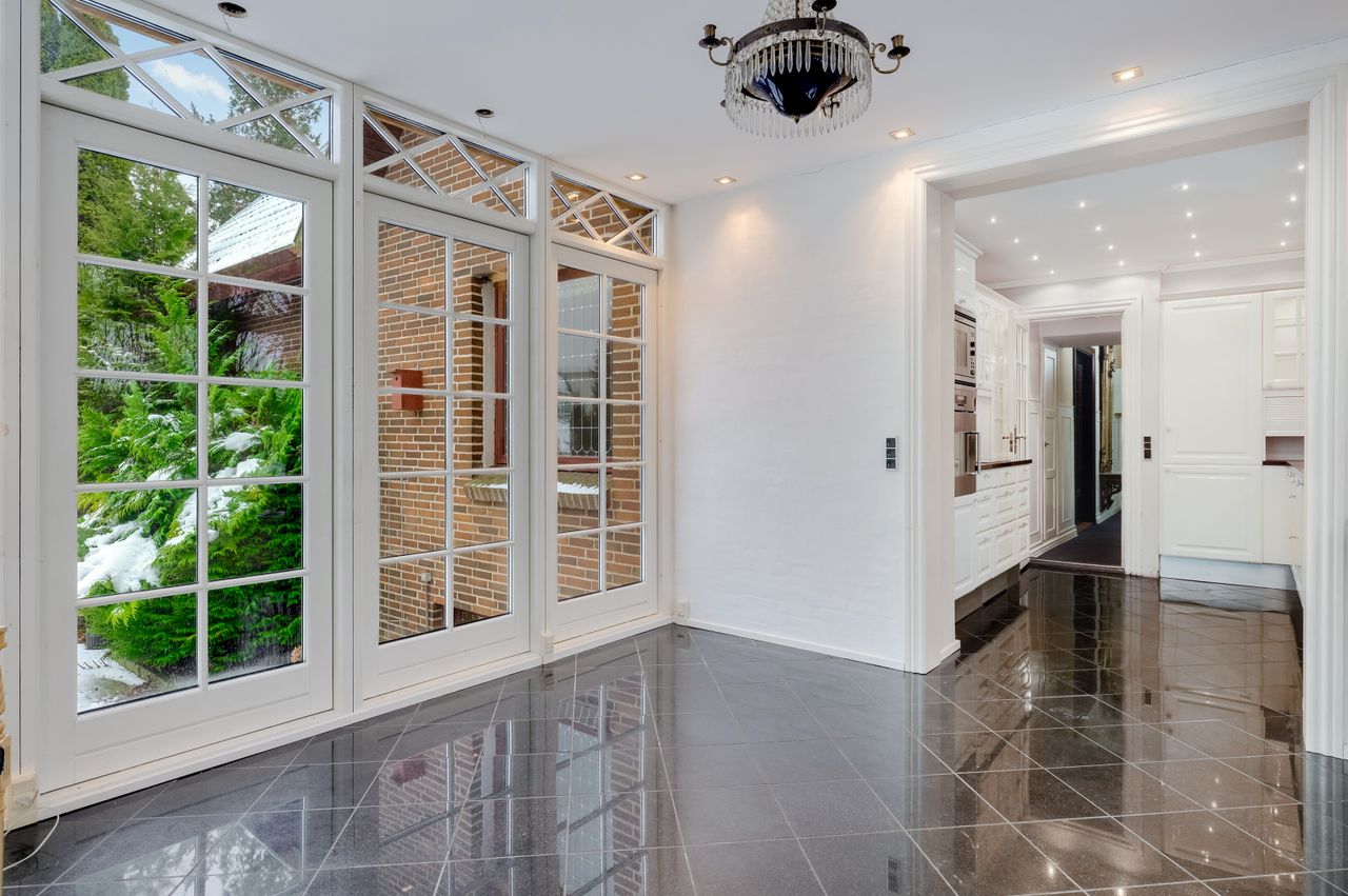 Udestuen er et helt særligt rum, der imponerer med sit blanke, sorte granitgulv og sprossede gulv-til-loft-vinduer hele vejen rundt. Her kan du nyde udsigten til haven året rundt, følge årstidernes skiften og nyde synes af børnene, der leger udenfor - uanset vejret.