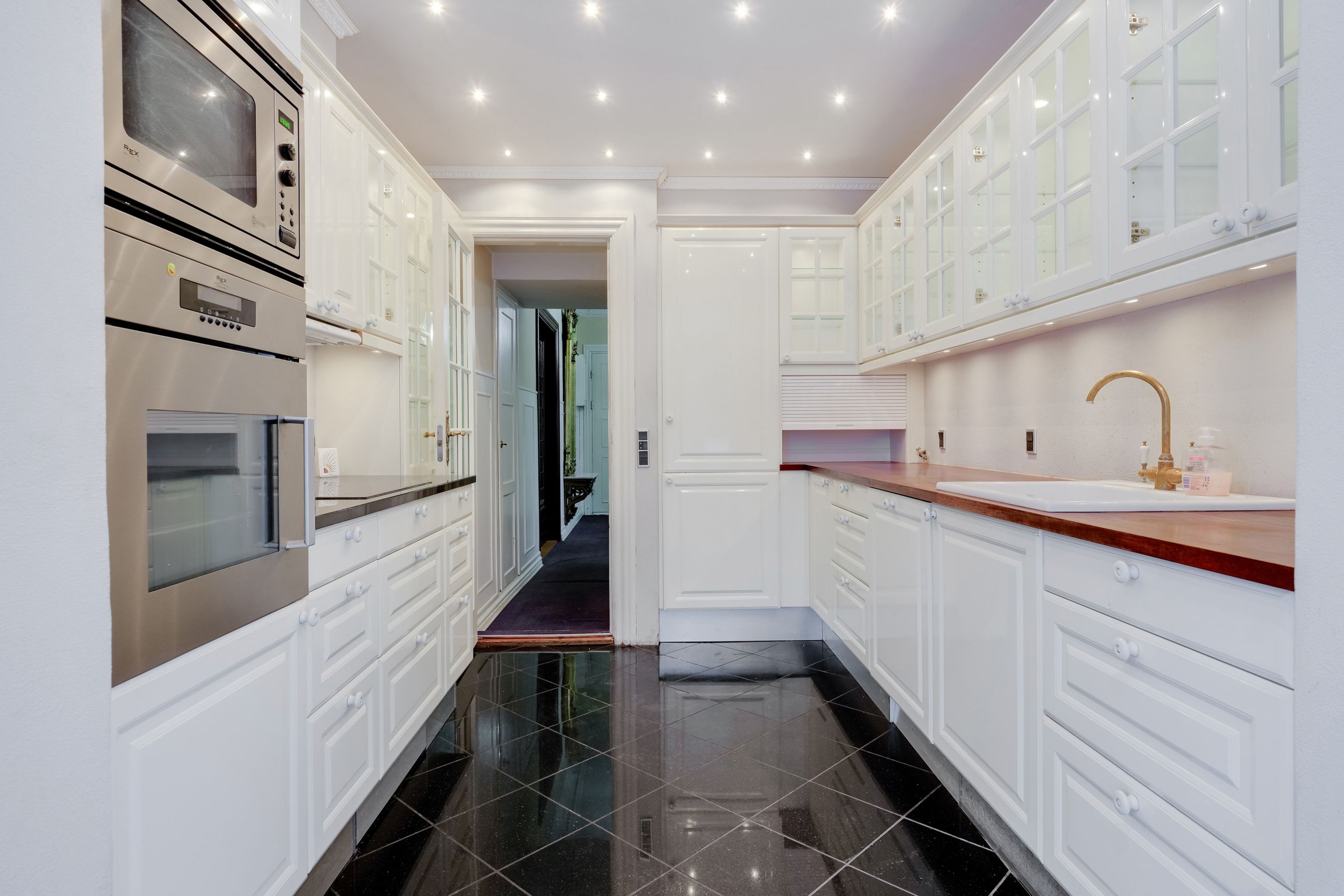 I stueplan finder du hjemmets leverum med to store stuer en suite, køkken samt en imponerende udestue i ballroom-stil. I stuerne ligger et smukt Hørning sildebensparket i en varm, rødlig nuance, der spiller flot sammen med dørenes farver. De to stuer har et dejligt lysindfald og giver mange indretningsmuligheder. Du kan bevare de store opholdsrum med plads til flere hyggelige zoner - eksempelvis sofaarrangement, hjemmebiograf eller legeområde til børnene. Alternativt kan den ene ende af stuen indrettes som ekstra værelse, ligesom der er mulighed for at åbne op mod køkkenet og skabe et moderne og sammenhængende køkken-alrum.