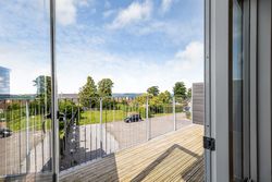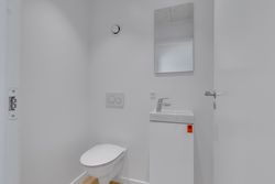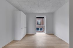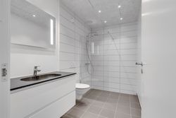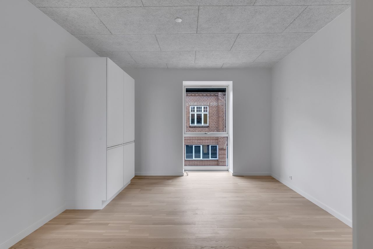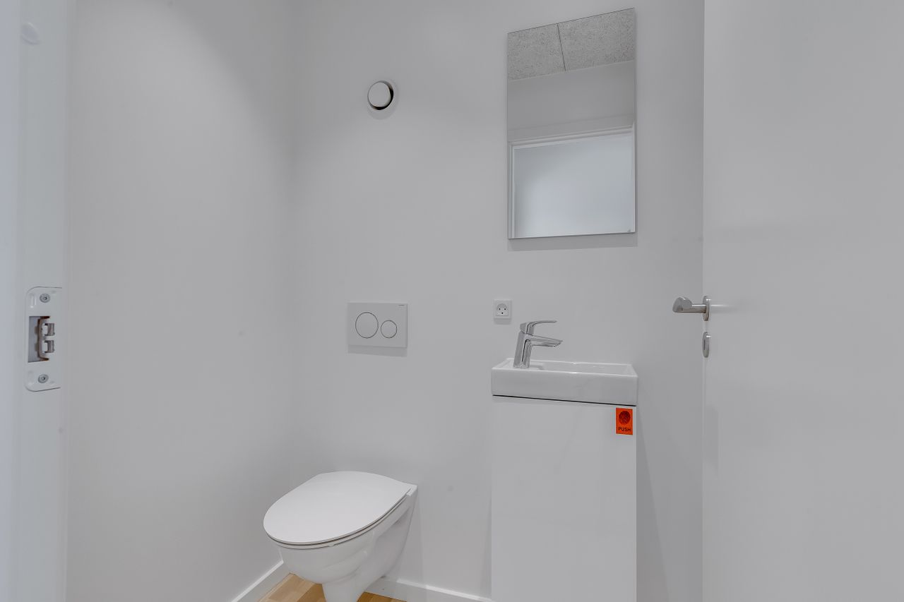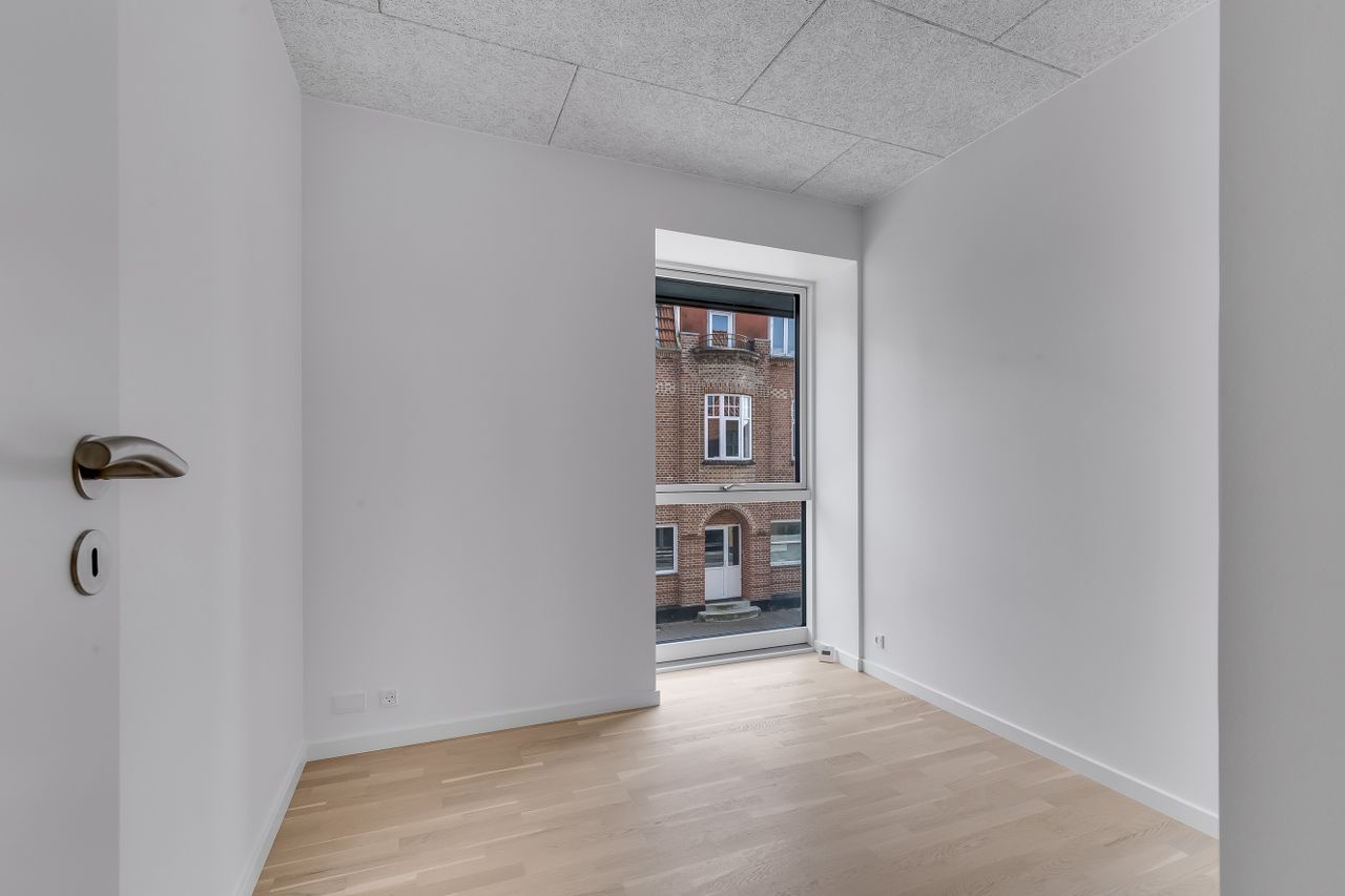 Lejligheden byder på to indretningsvenlige værelser med fuld gulvvarme, akustiklofter og store vinduespartier. Masterafdelingen har eget badeværelse med elegant flisevalg, væghængt toilet og svævende skuffemoduler i samme design som køkkenet. Et ekstra gæstetoilet sikrer komfort til hverdag og gæstebesøg.