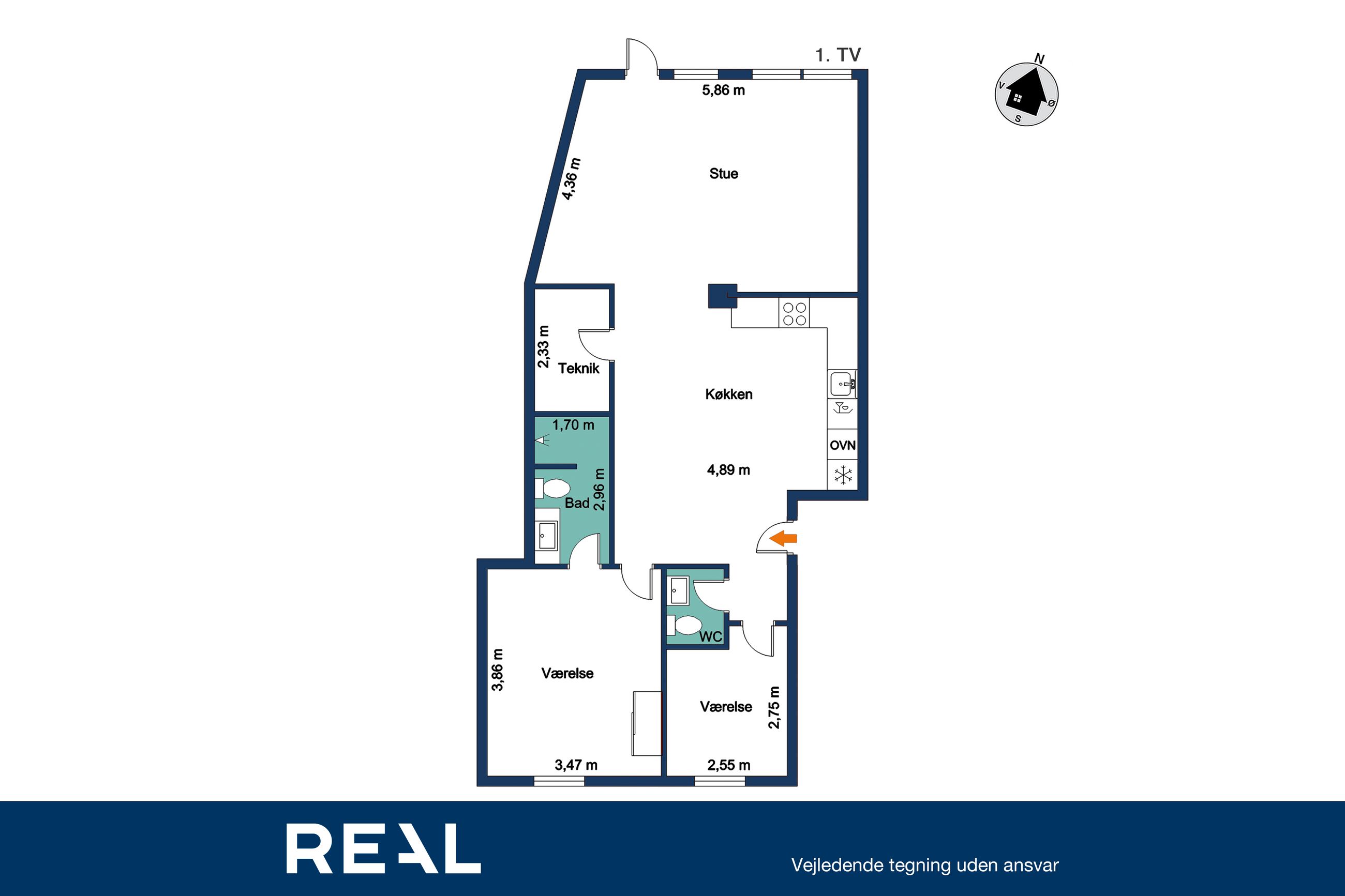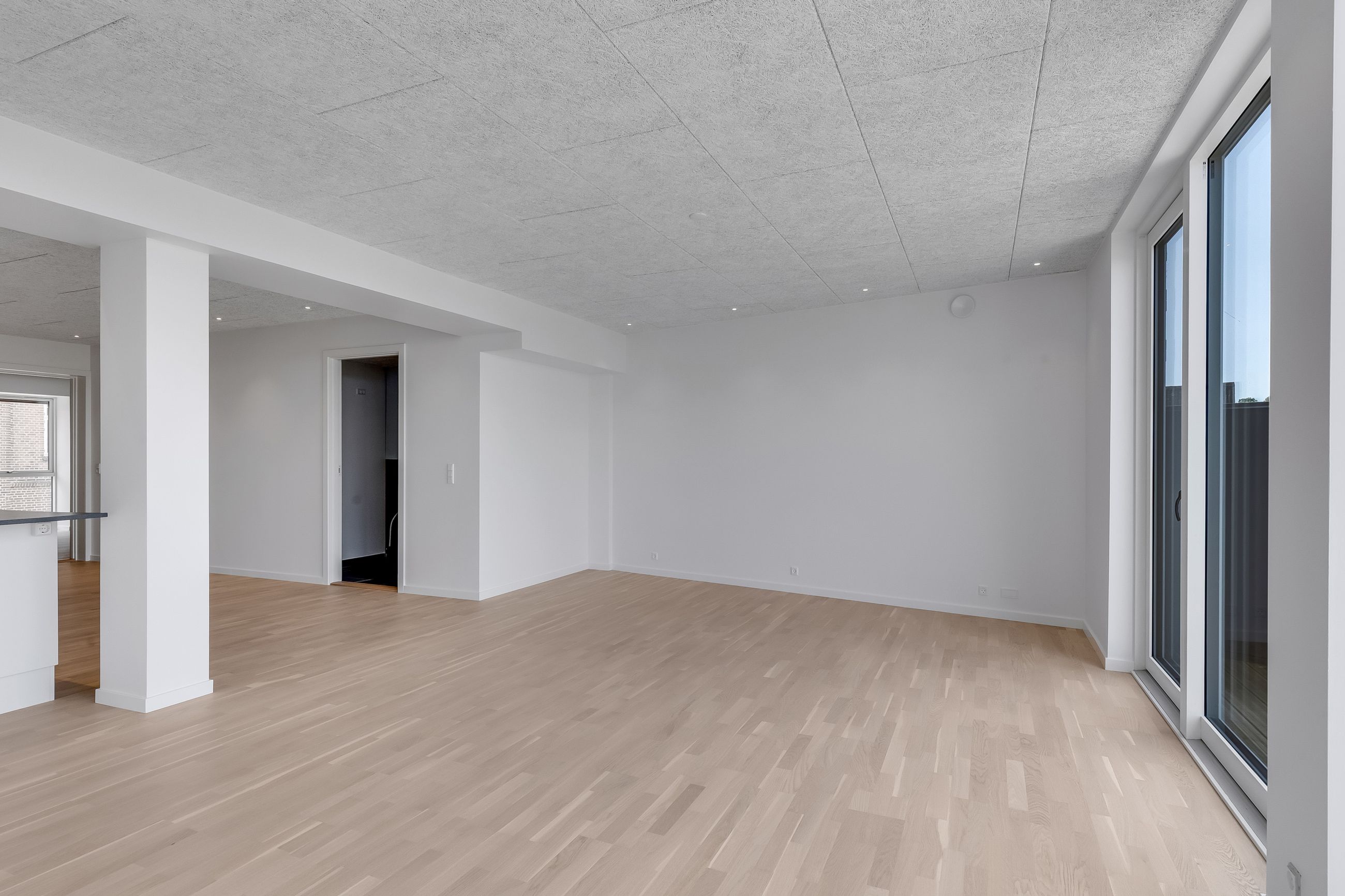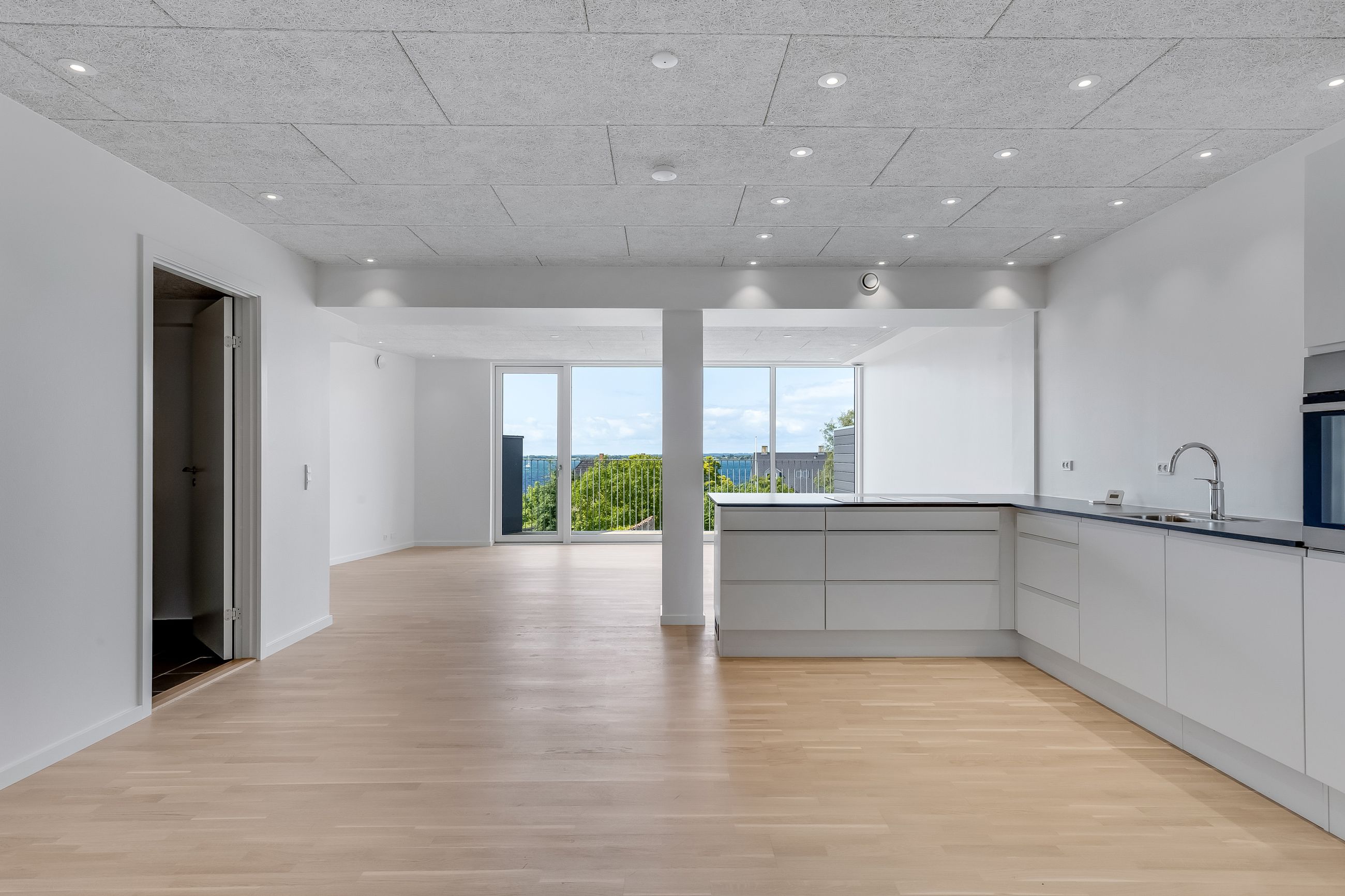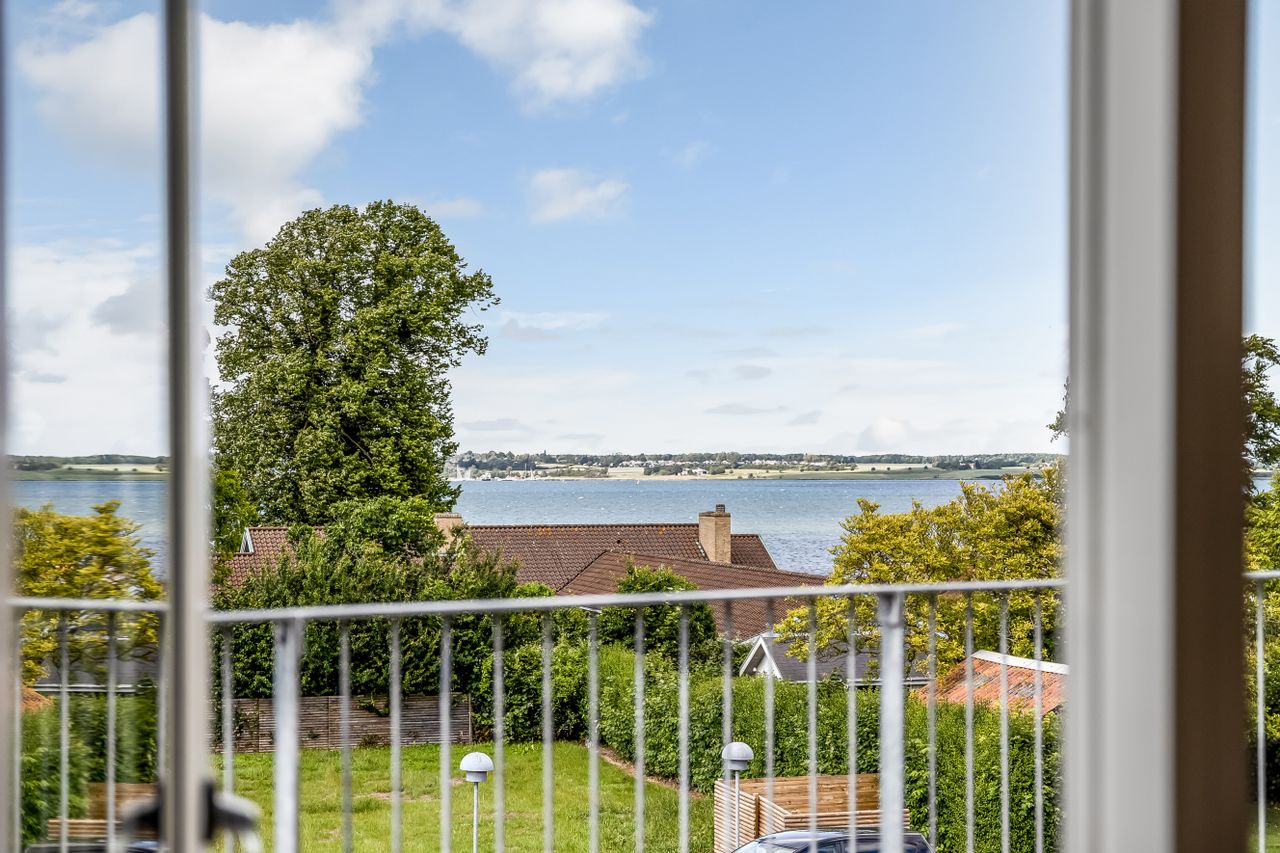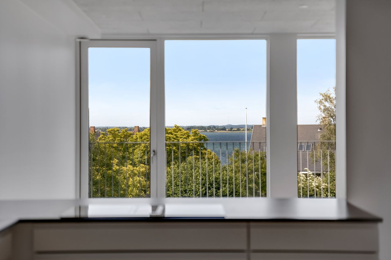 Lejligheden åbner sig op i et stort, lyst køkken-alrum med sydvestvendte vinduespartier, der inviterer dagslyset helt ind. Herfra er der adgang til altanen – din private udkigspost over Grønsund og Bogø, hvor du kan følge sejlene glide forbi, mens stilheden sænker sig over havet.