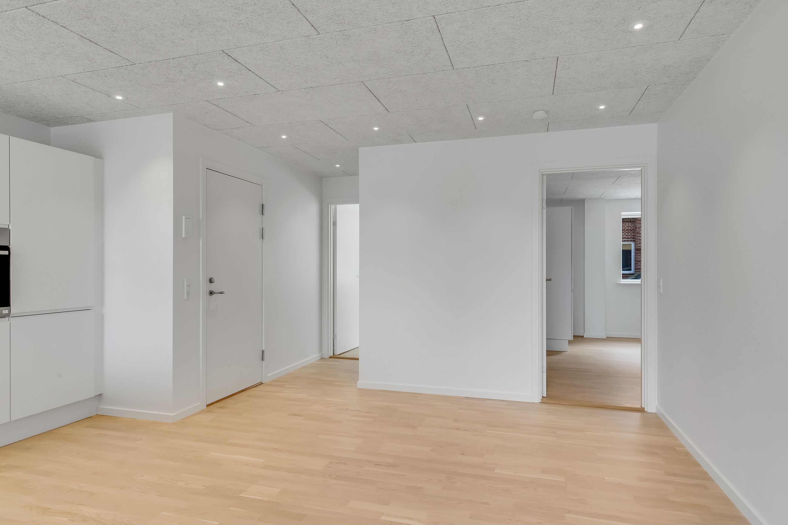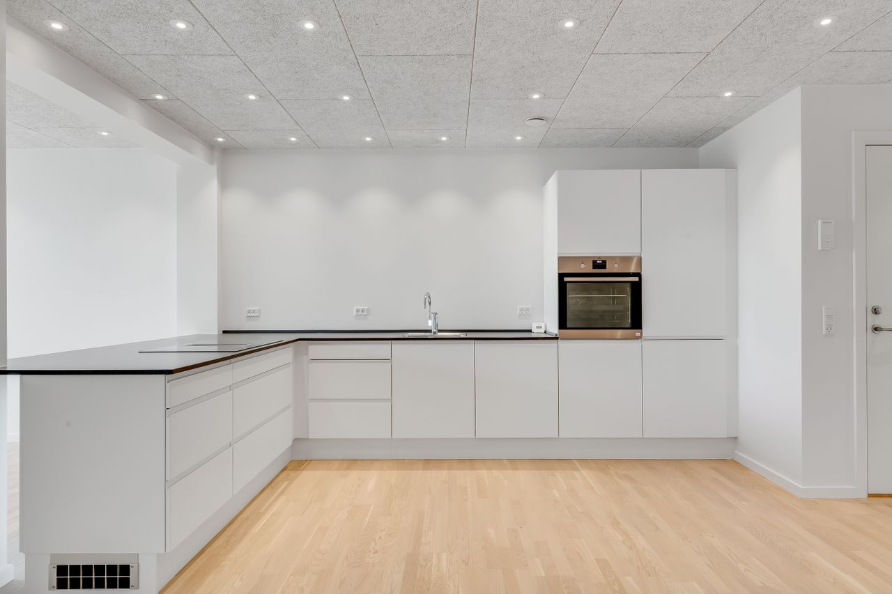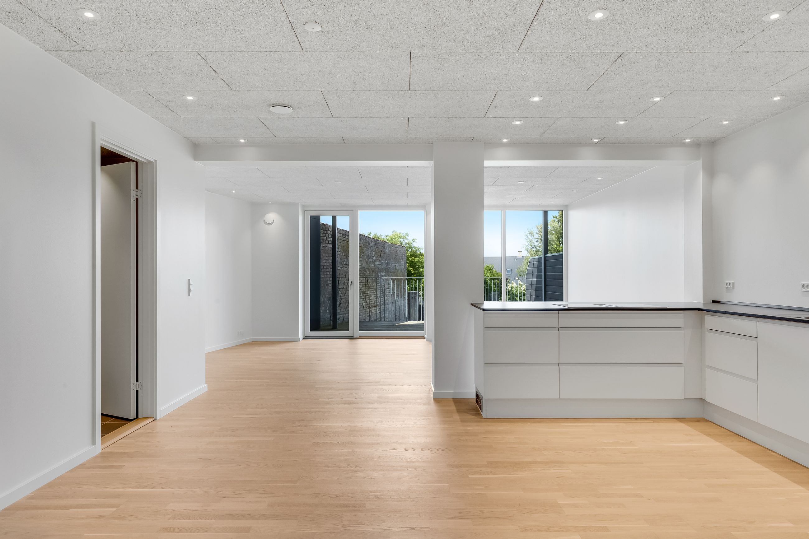Du træder direkte ind i hjemmets centrale akse: et åbent stue-/køkkenalrum, hvor gulv-til-loft vinduer indrammer horisonten mellem Grønsund og himlen. De lyse gulve leder lyset blødt gennem hele lejligheden og videre ud på terrassen, hvor roen sænker sig, mens du nyder den frie udsigt over det grønne område.