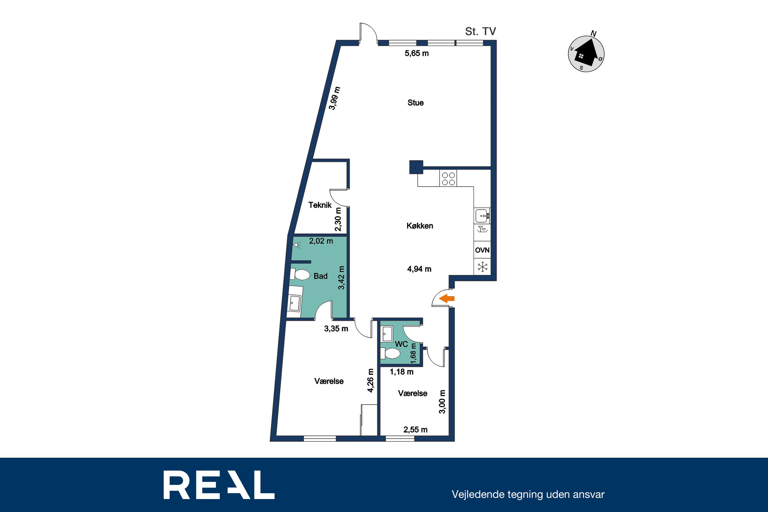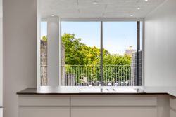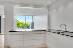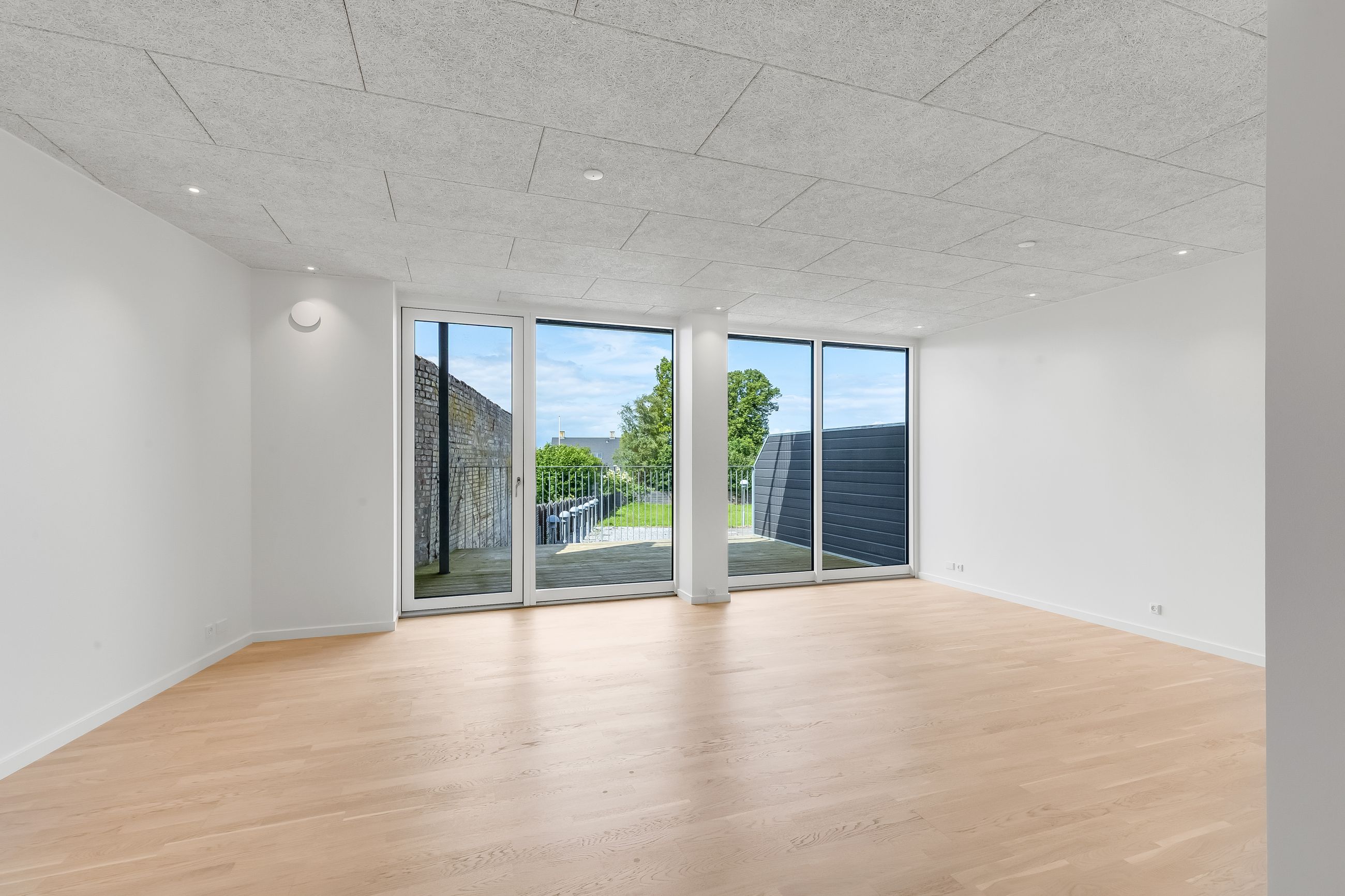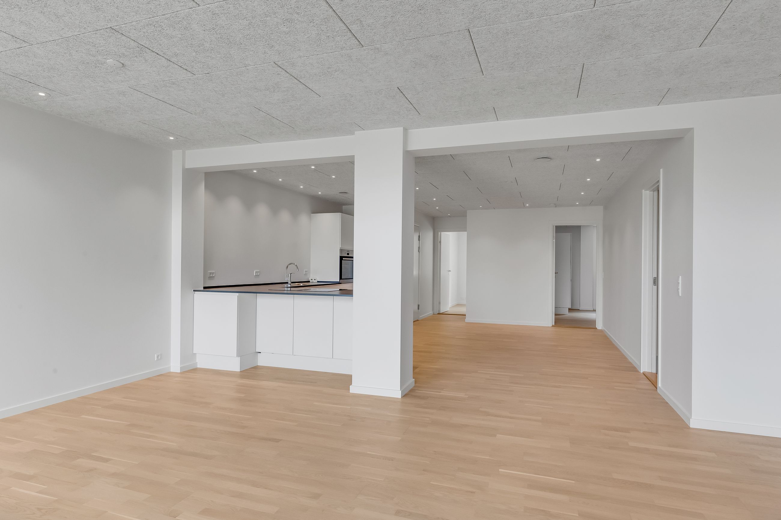 Du træder direkte ind i hjemmets centrale akse: et åbent stue-/køkkenalrum, hvor gulv-til-loft vinduer indrammer horisonten mellem Grønsund og himlen. De lyse gulve leder lyset blødt gennem hele lejligheden og videre ud på terrassen, hvor roen sænker sig, mens du nyder den frie udsigt over det grønne område.