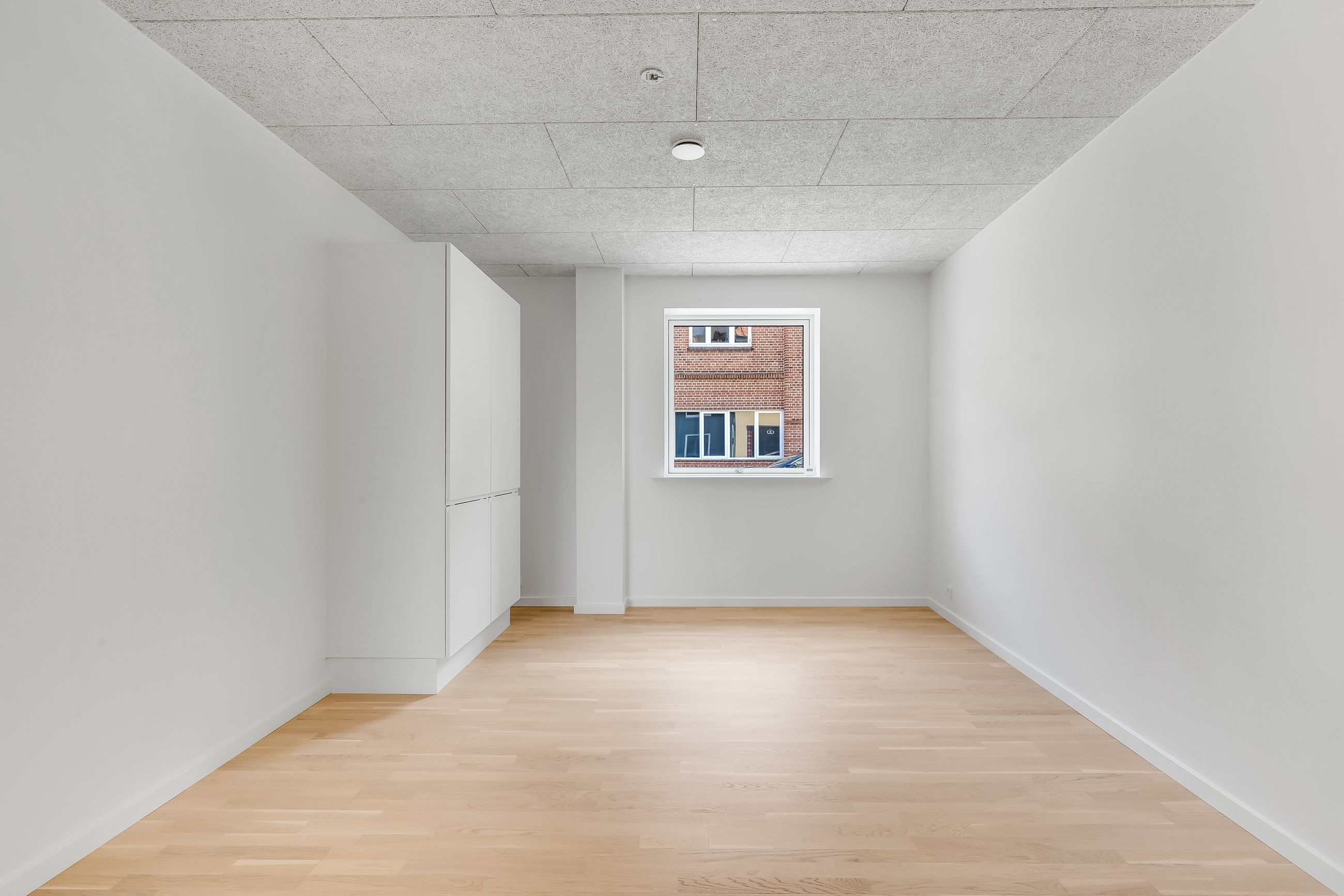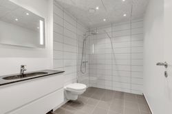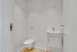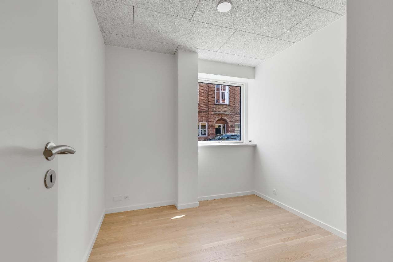 Planløsningen byder på to værelser – begge med smukke vinduespartier, gulvvarme og akustiklofter med forberedt ambient belysning. Masterafdelingen har eget badeværelse med lækre fliser, væghængt toilet og svævende skuffemoduler i samme designlinje som køkkenet. Et ekstra toilet sikrer, at både gæster og teenagere har deres egen komfortzone. Derudover findes et praktisk teknik-/opbevaringsrum – ideelt til støvsugeren og rengøringsartiklerne.