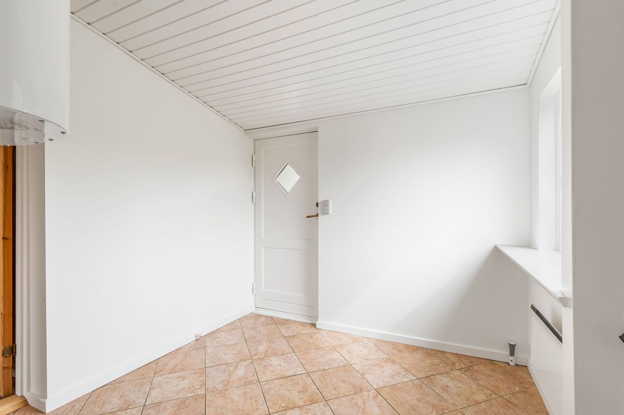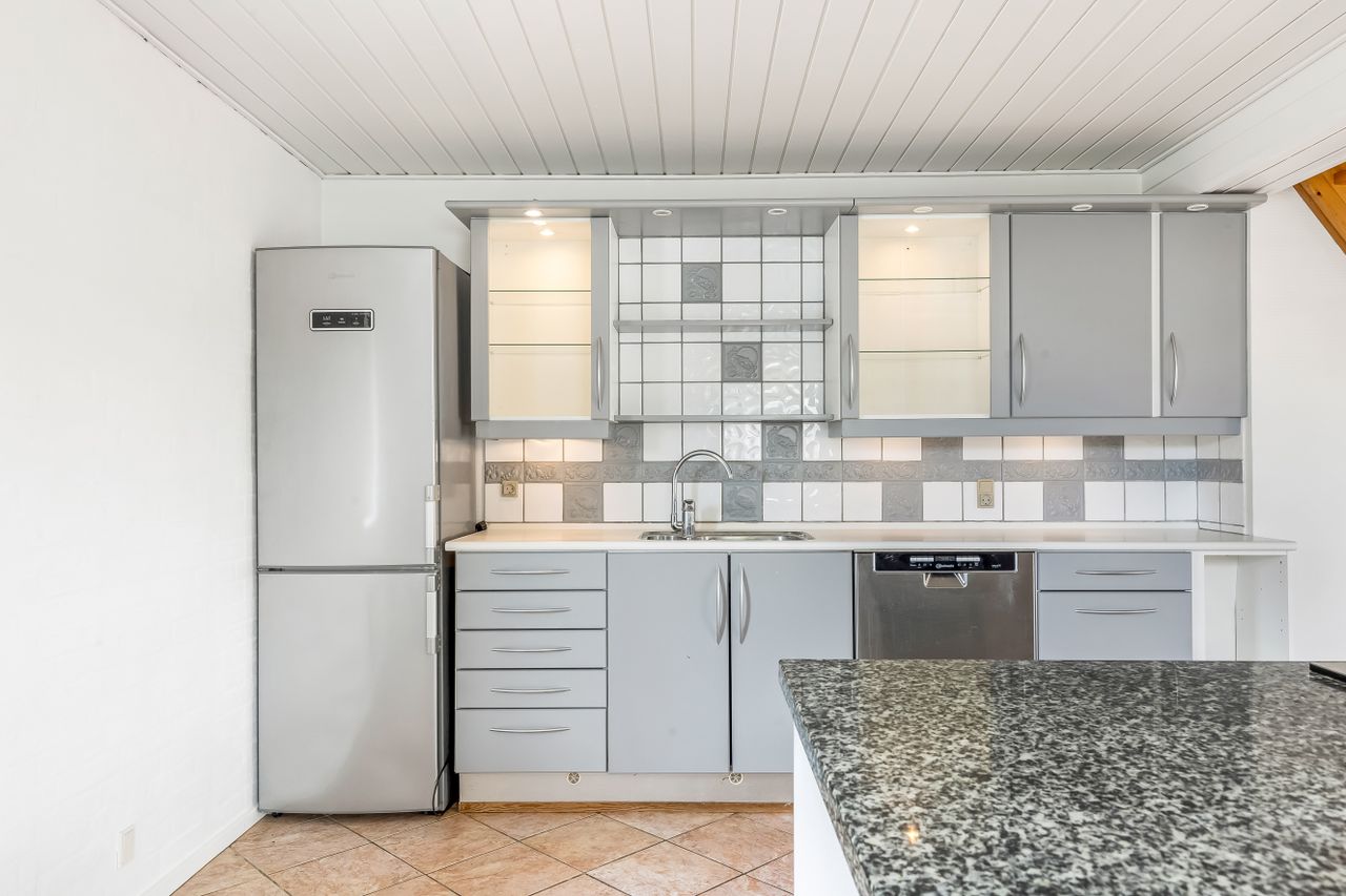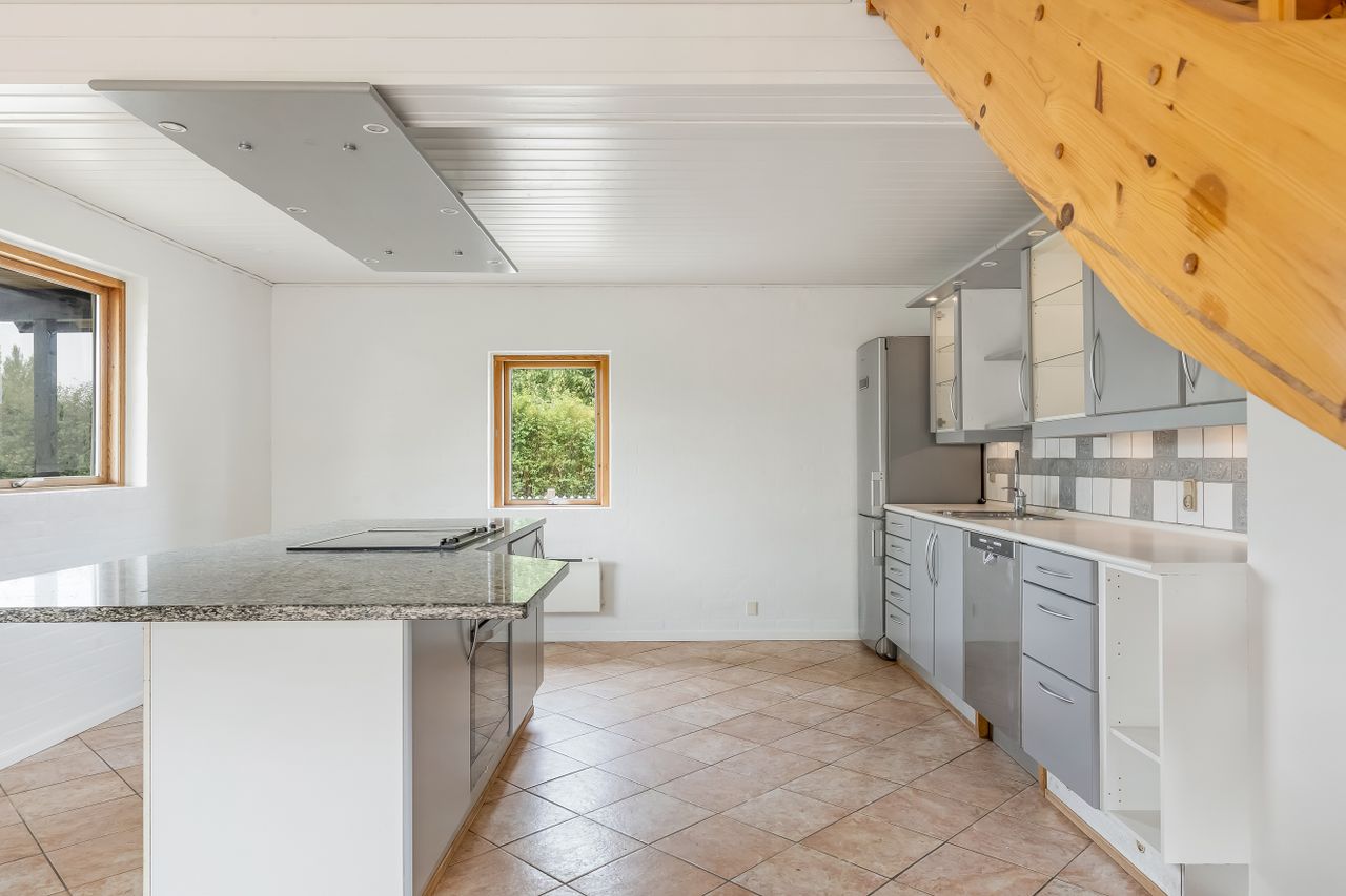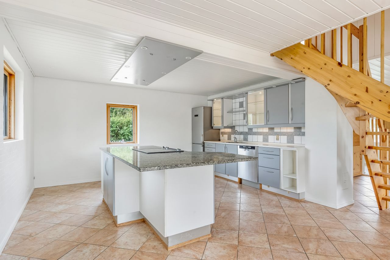 I træder ind til et lyst køkken-alrum som husets naturlige samlingspunkt. Her er en stor ø med god arbejdsplads og fin plads til lektier, madlavning og gæster i samme ombæring. Alrummet ligger i åben forbindelse med opholdsstuen, så I får et dejligt, sammenhængende opholdsrum med udgang til den overdækkede terrasse – perfekt til grill året rundt og lange sommeraftener i læ.