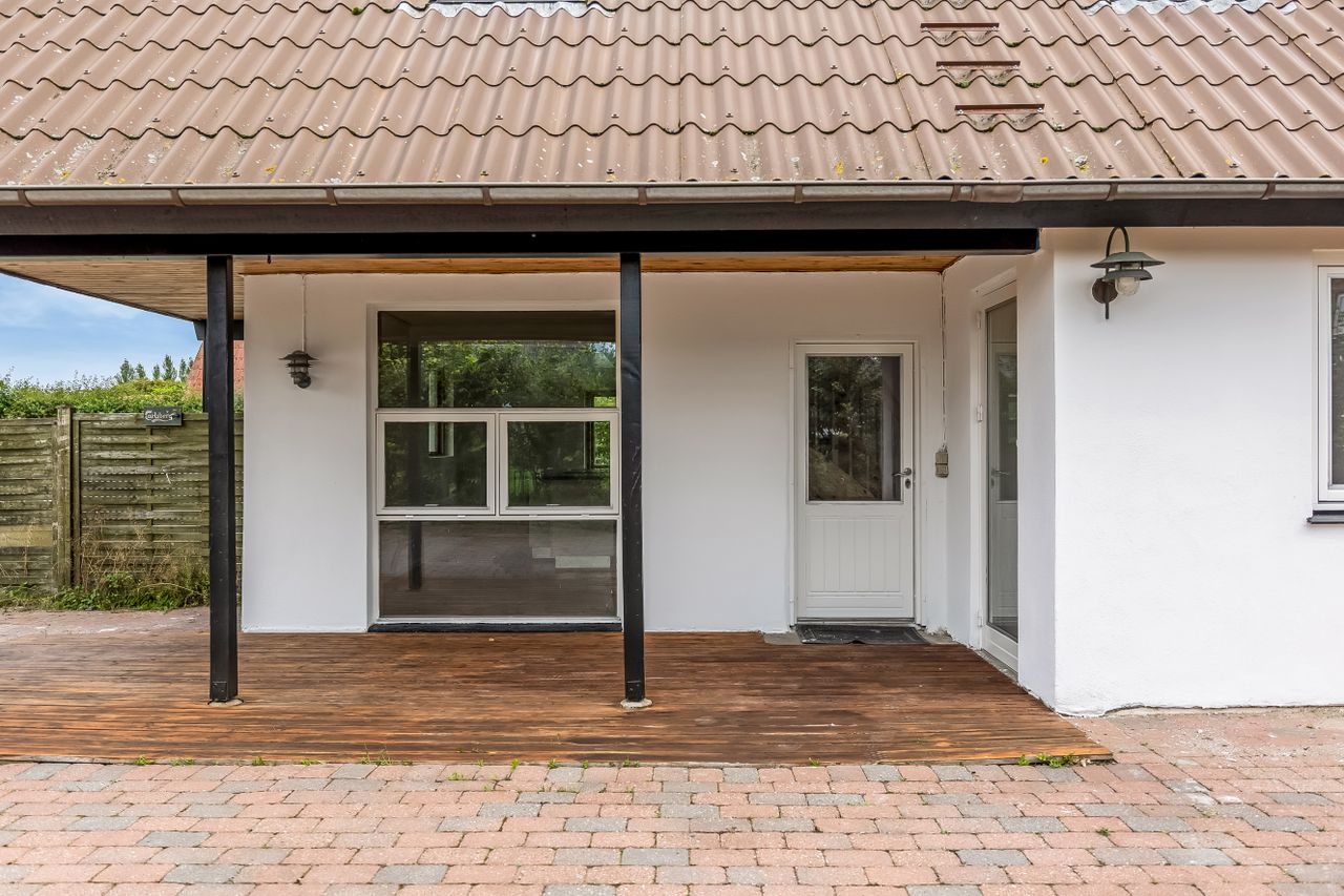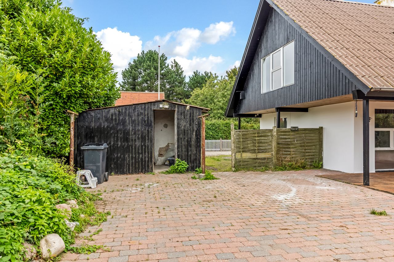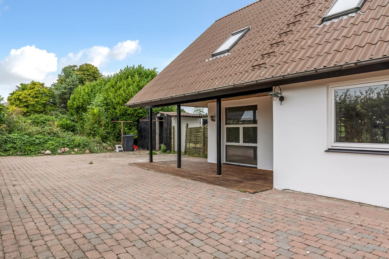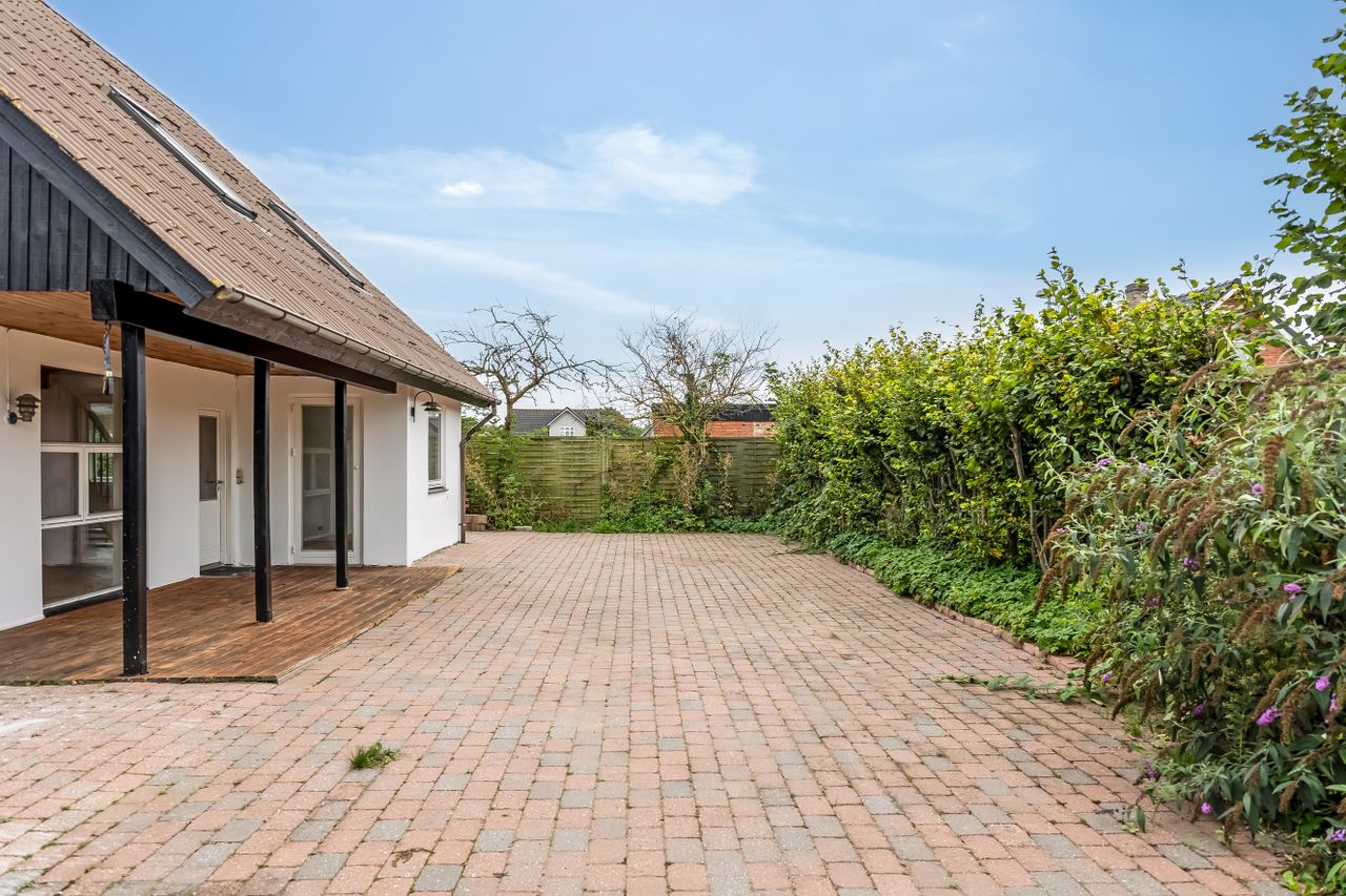 Stor, flisebelagt gårdsplads med masser af parkering til biler, cykler og trailer. Langs facaden ligger den overdækkede terrasse, der forlænger sæsonen, og de overskuelige udearealer giver jer mere fritid og mindre havearbejde. Der er også lille udhus til alt det praktiske.