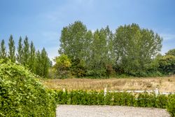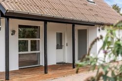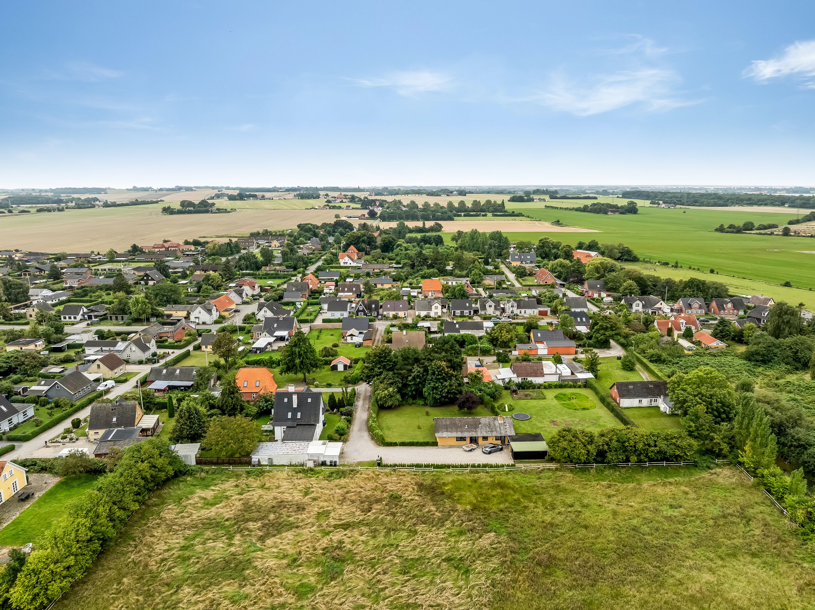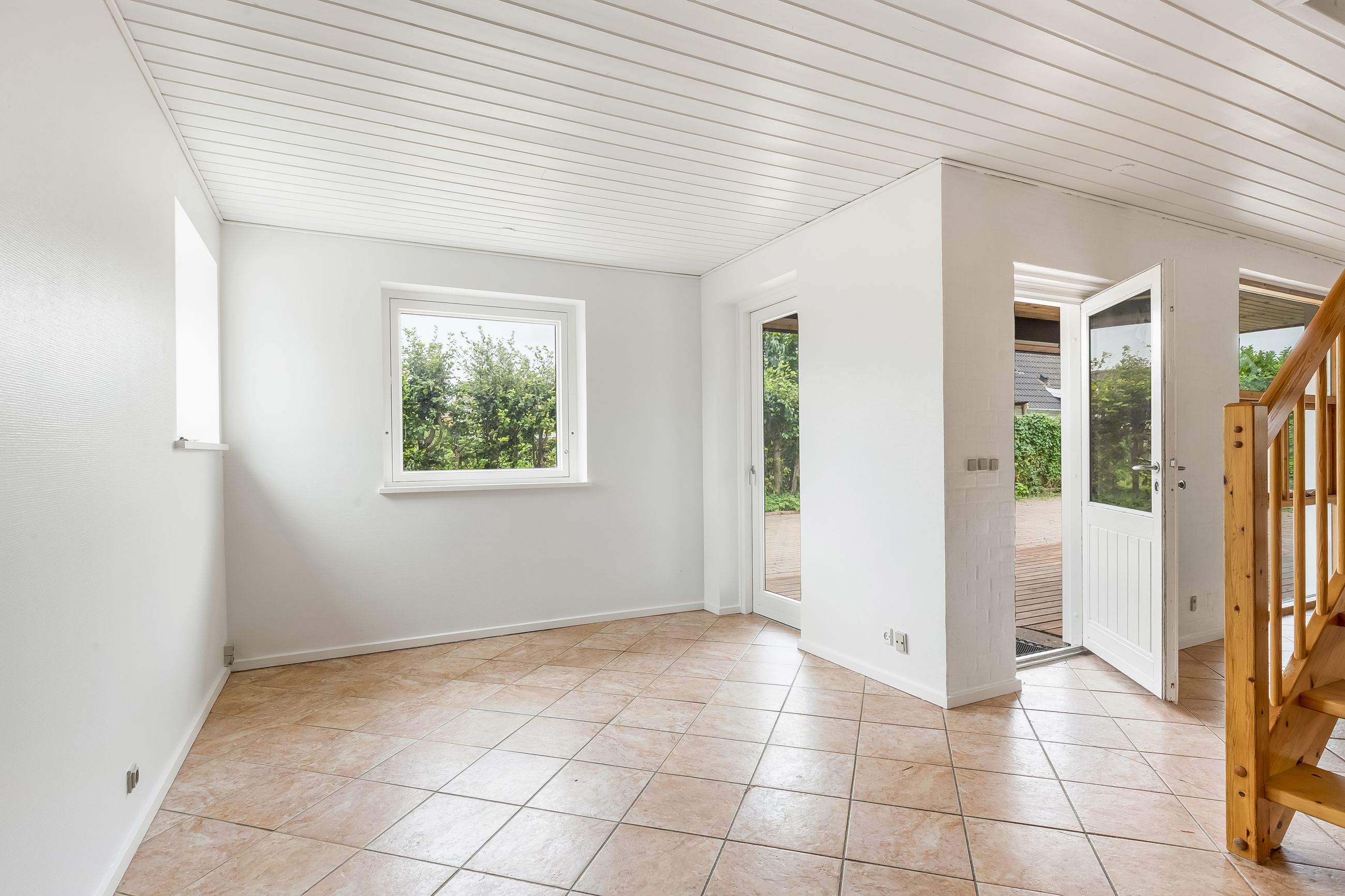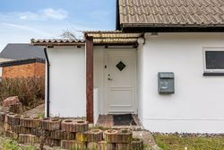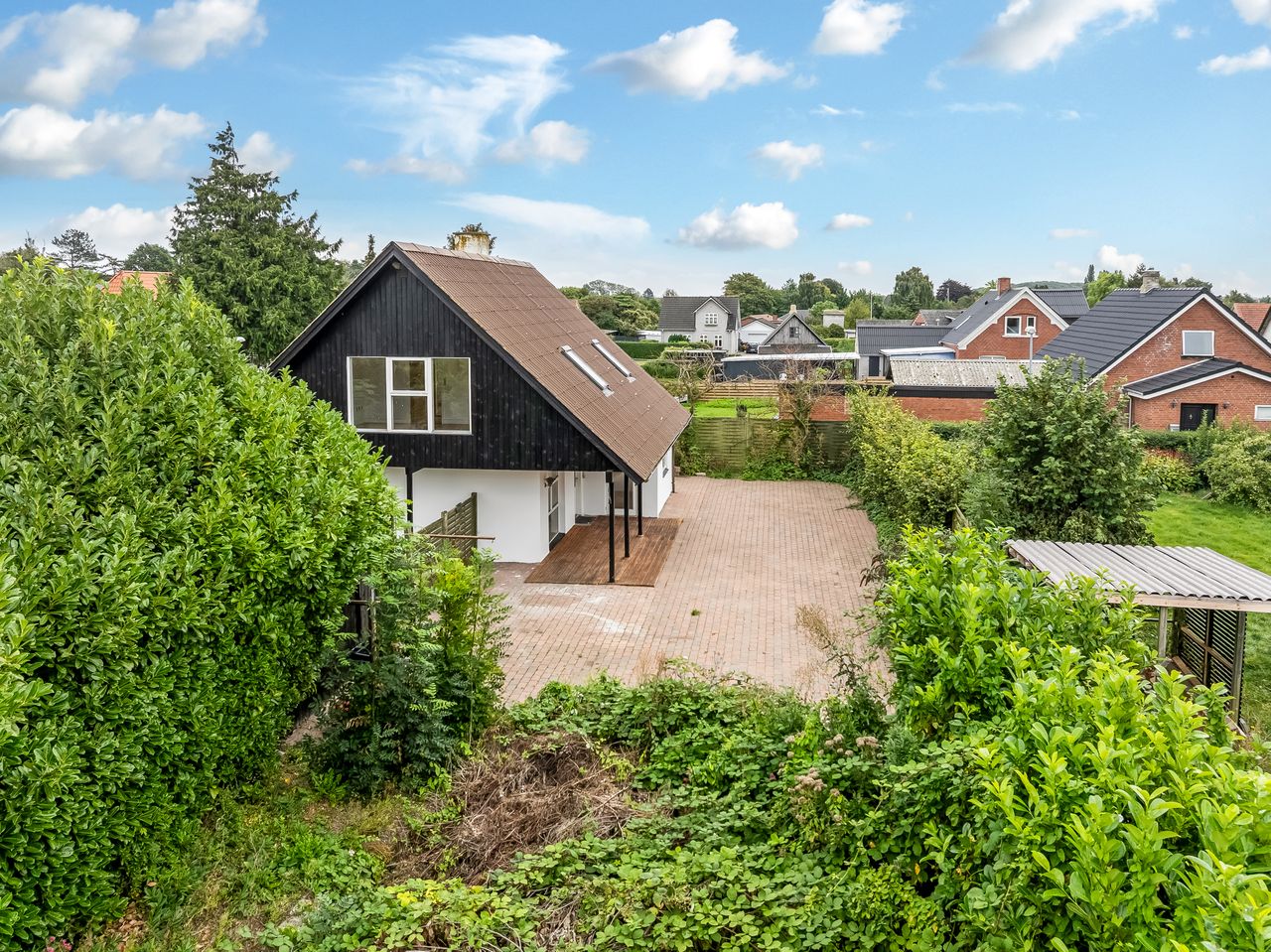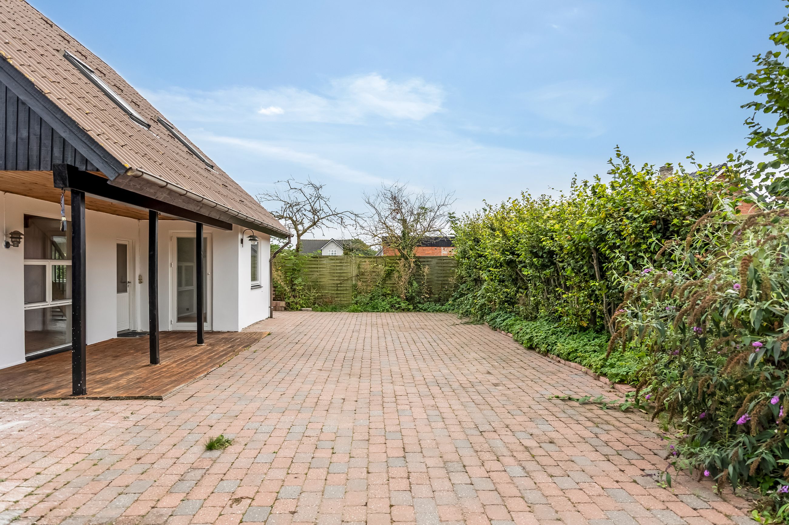 Stor, flisebelagt gårdsplads med masser af parkering til biler, cykler og trailer. Langs facaden ligger den overdækkede terrasse, der forlænger sæsonen, og de overskuelige udearealer giver jer mere fritid og mindre havearbejde. Der er også lille udhus til alt det praktiske.