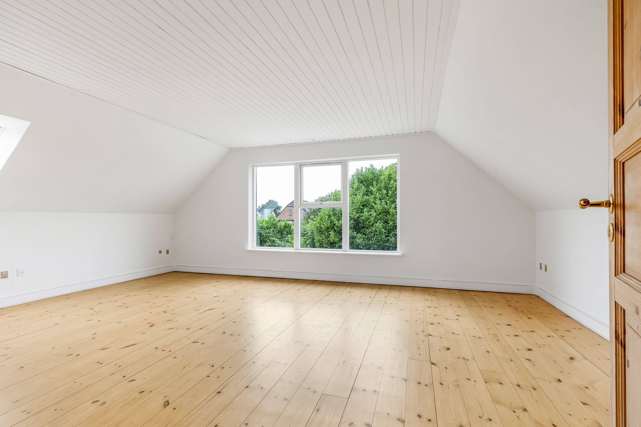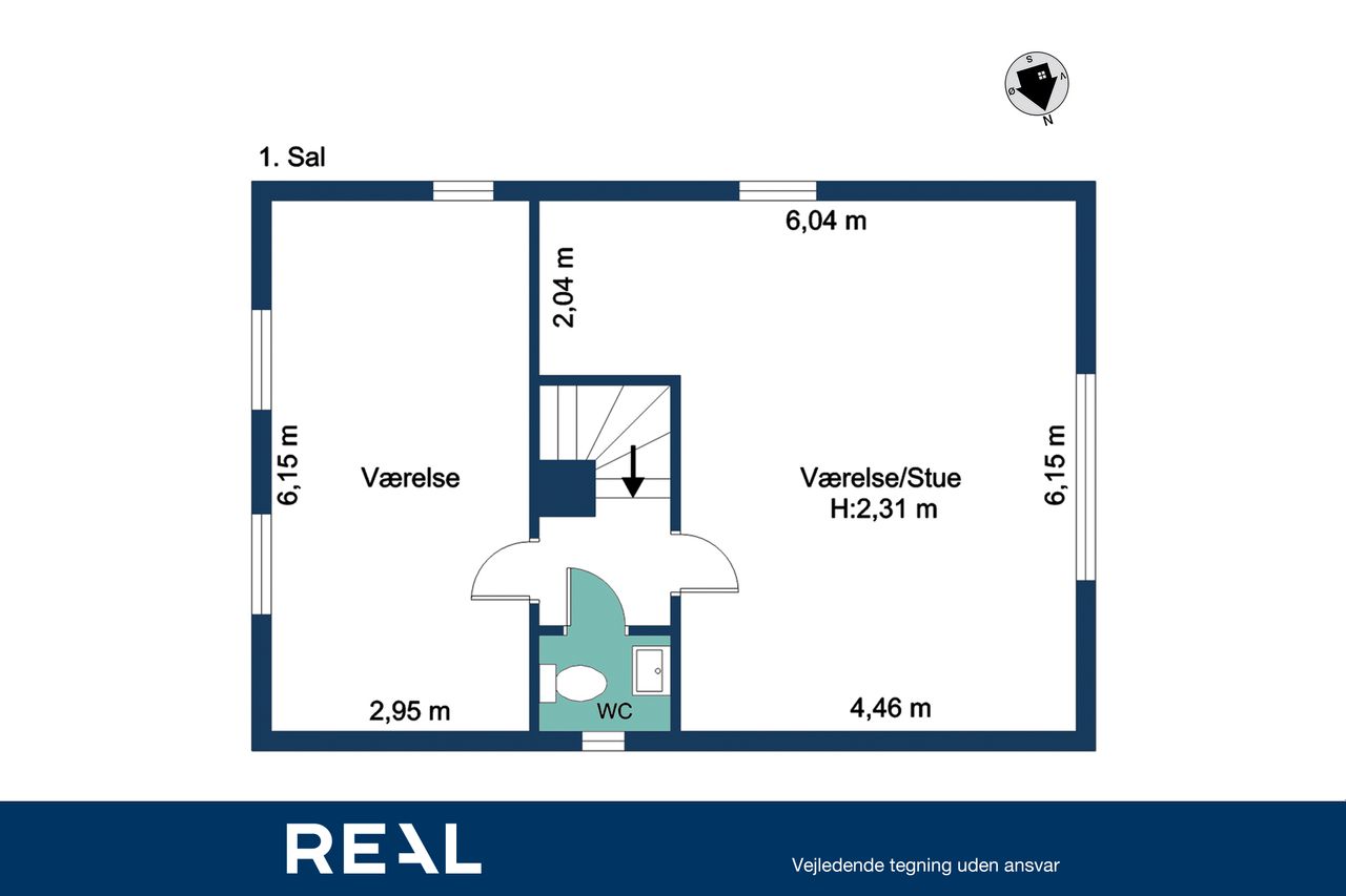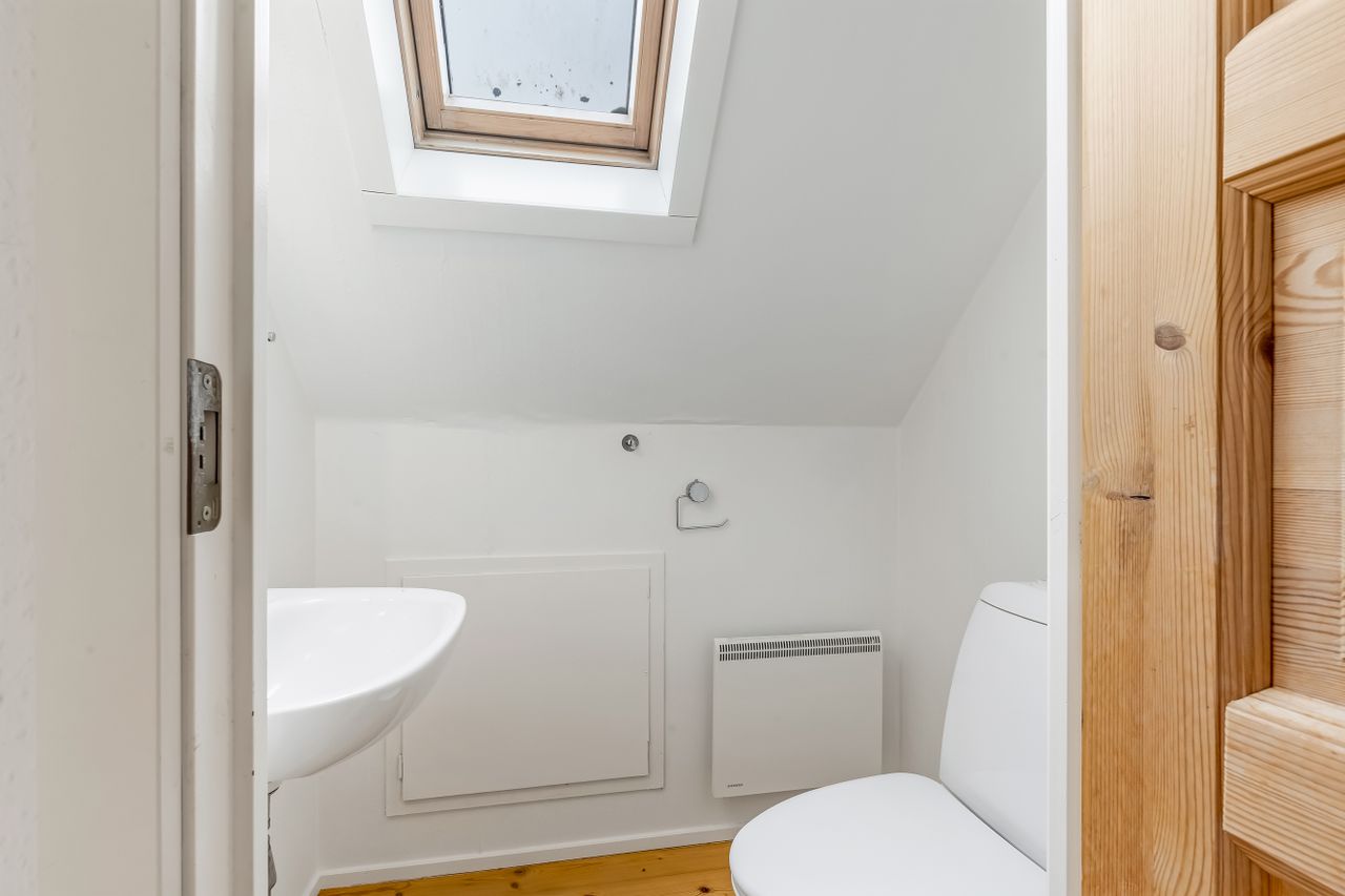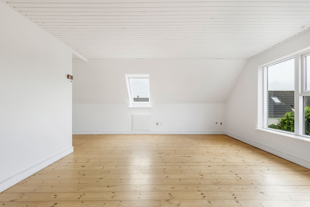 Førstesalen byder på to meget store rum – oplagte som forældreafdeling, børneværelser, hjemmekontor eller tv-stue – plus et lille gæste-WC. Har I brug for flere værelser, er der gode muligheder for at opdele et af de store rum.