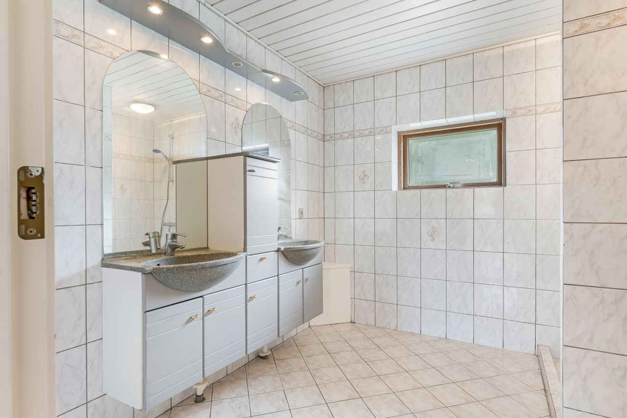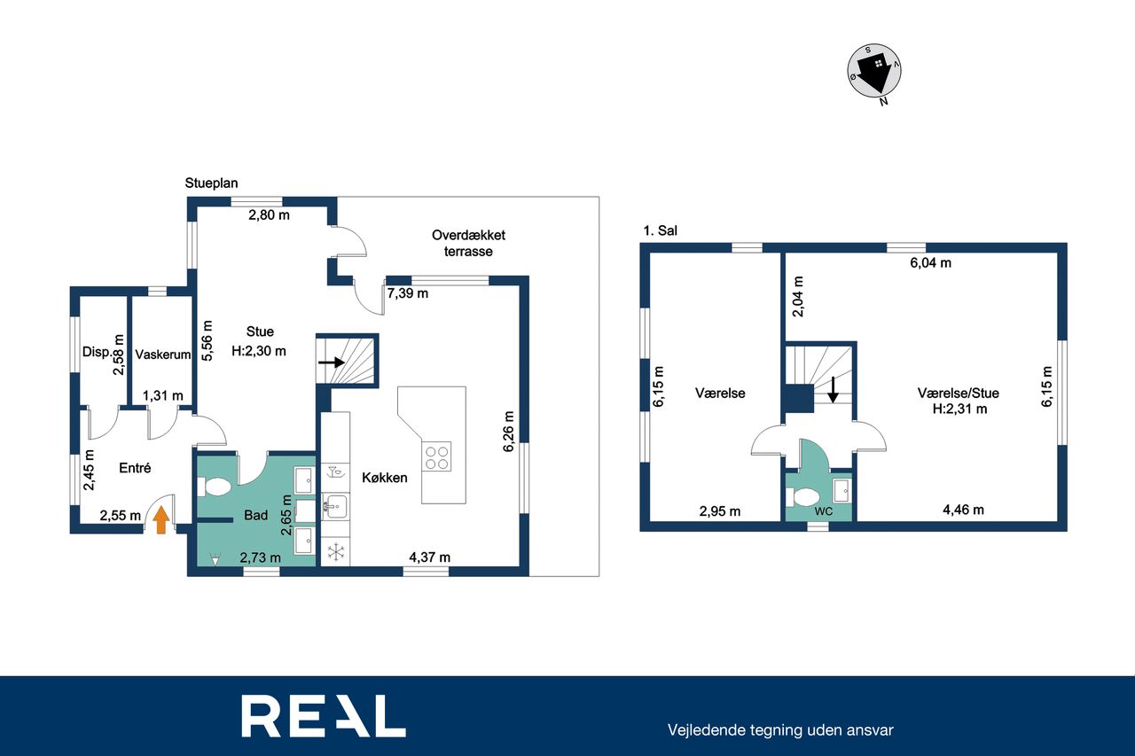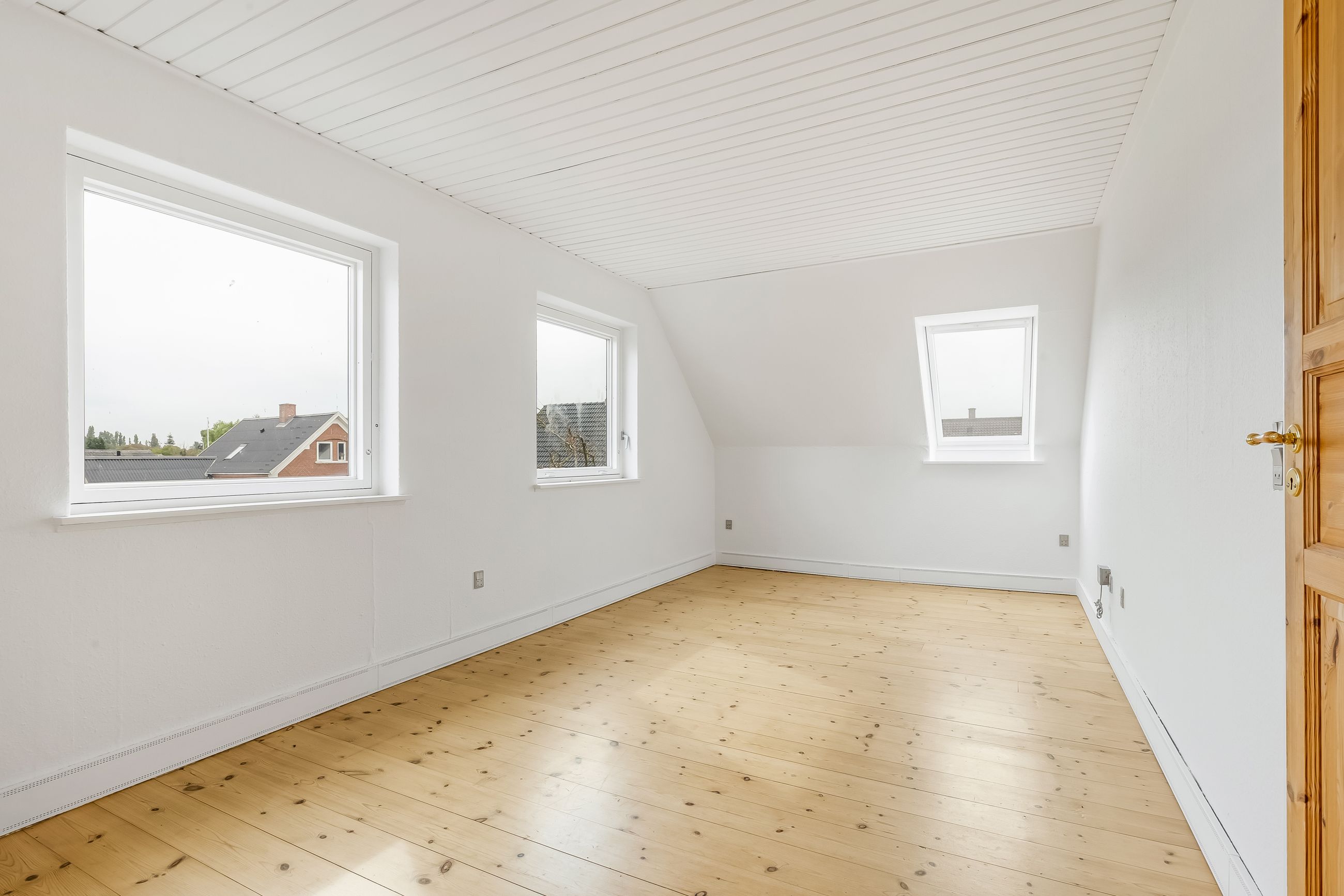 Førstesalen byder på to meget store rum – oplagte som forældreafdeling, børneværelser, hjemmekontor eller tv-stue – plus et lille gæste-WC. Har I brug for flere værelser, er der gode muligheder for at opdele et af de store rum.