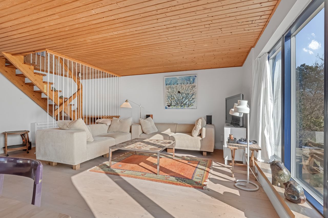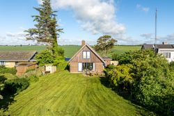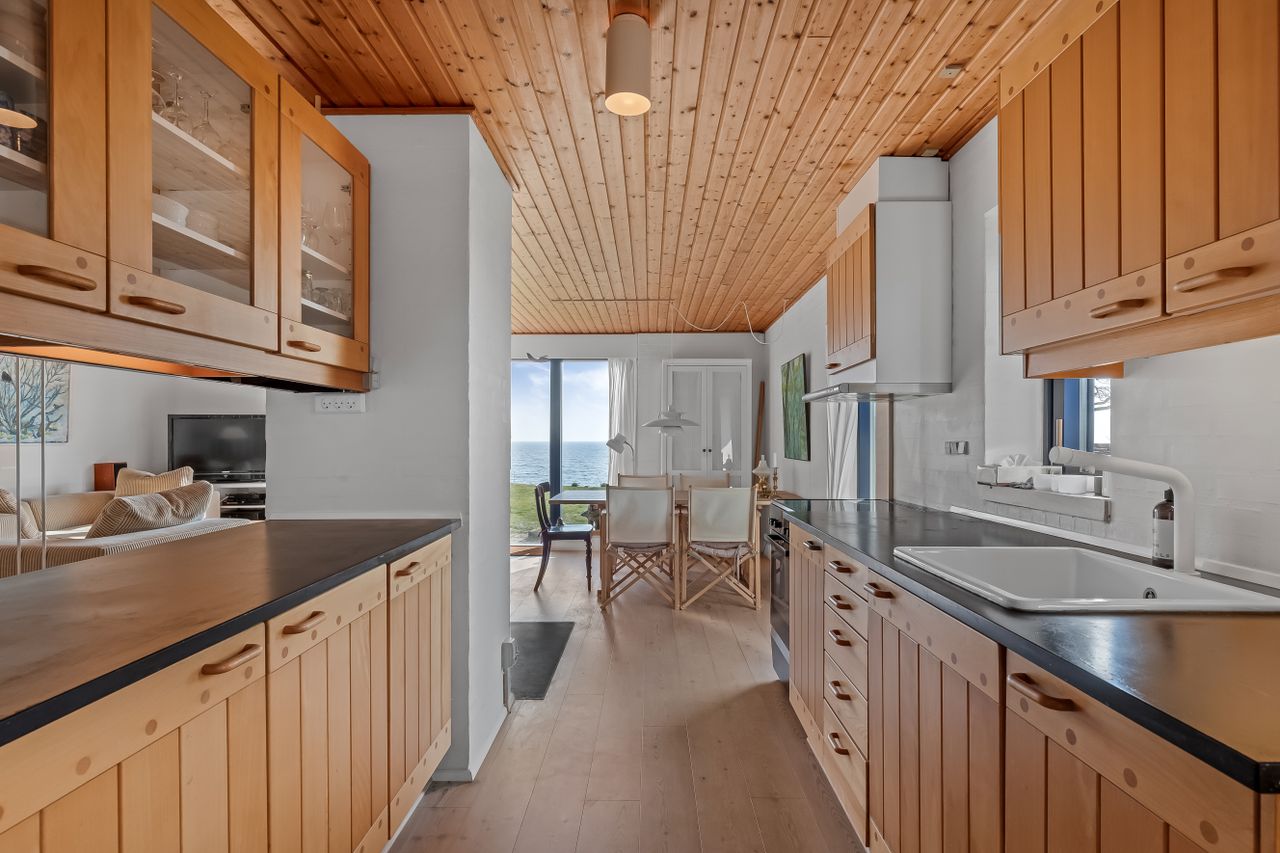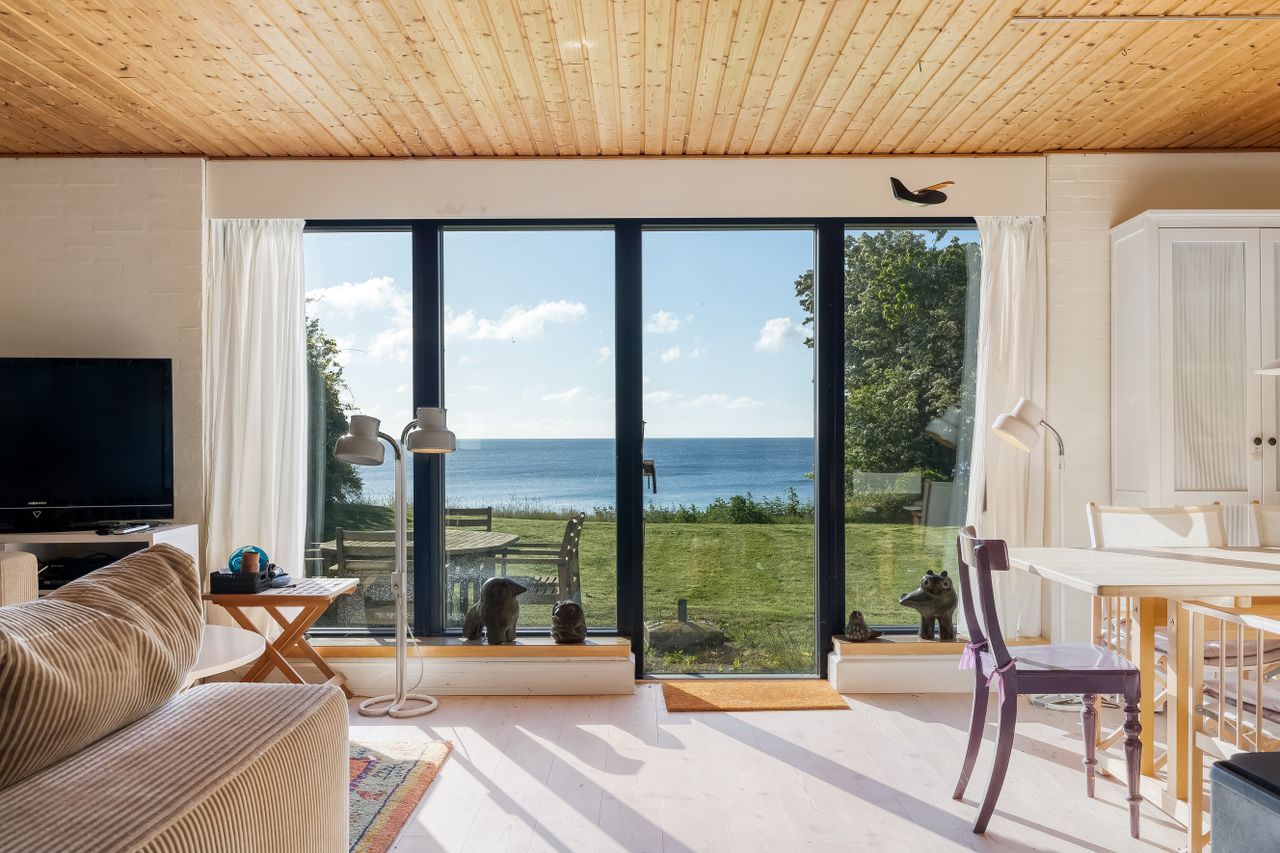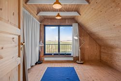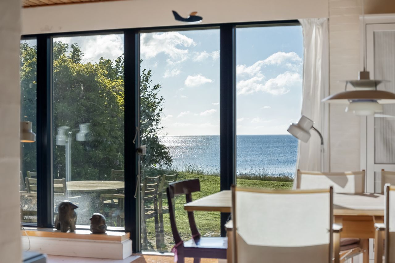 Sommerhuset stue/alrum imponerer med store vinduespartier der lader den spektakulære havudsigt strømme uhindret ind. Her er alt åbent og køkken, spiseplads og sofahygge kan nydes i samme rum. I stueplan er der desuden et rummeligt badeværelse, bryggers og et hyggeligt kontor, som let kan omdannes til endnu et værelse. På husets første sal findes to charmerende værelser, hvoraf det ene soveværelse tilbyder en enestående udsigt over havet og det andet over de ny såede marker. Og så er her også et toilet med vask, til dem der sætter pris på det.