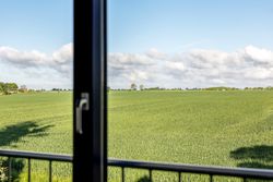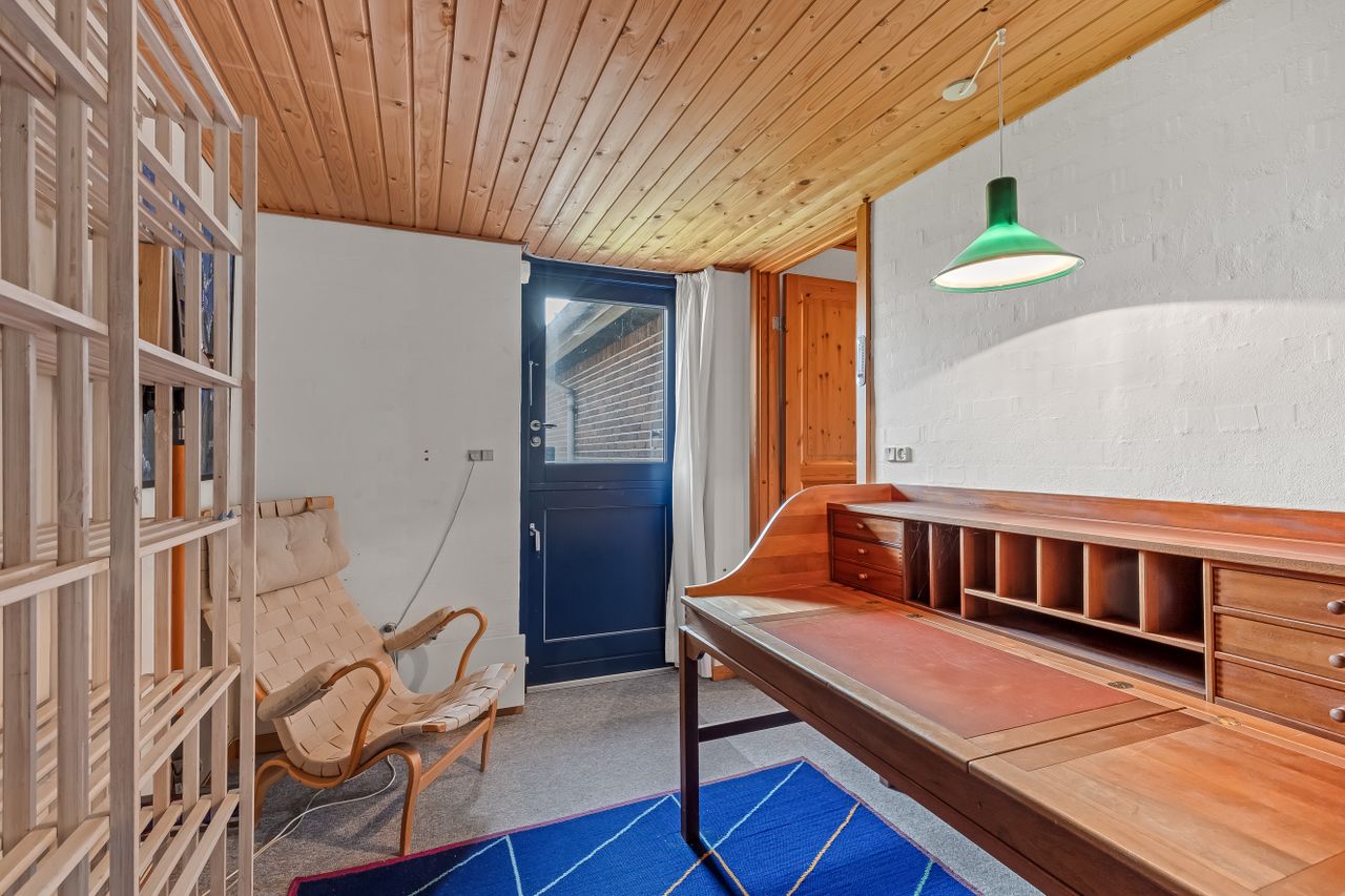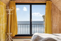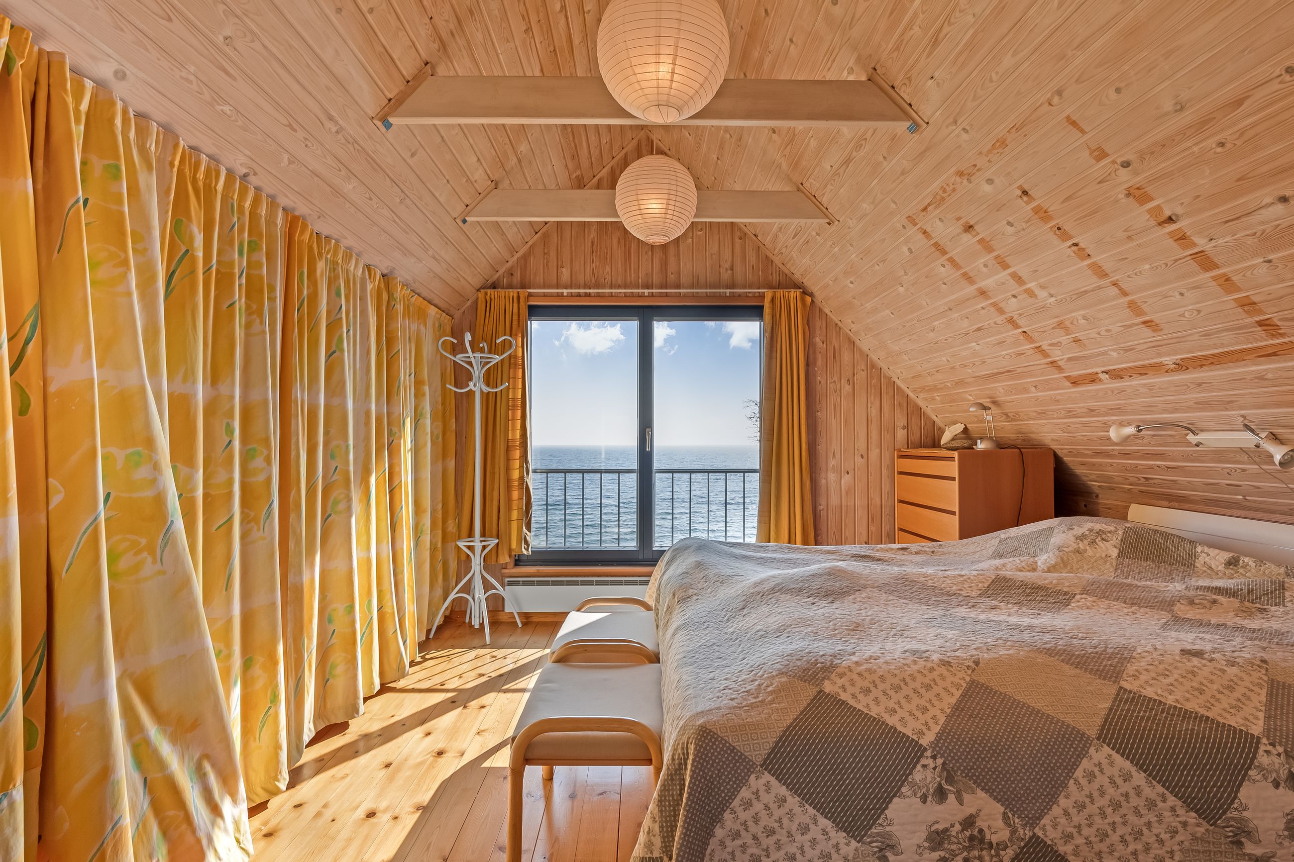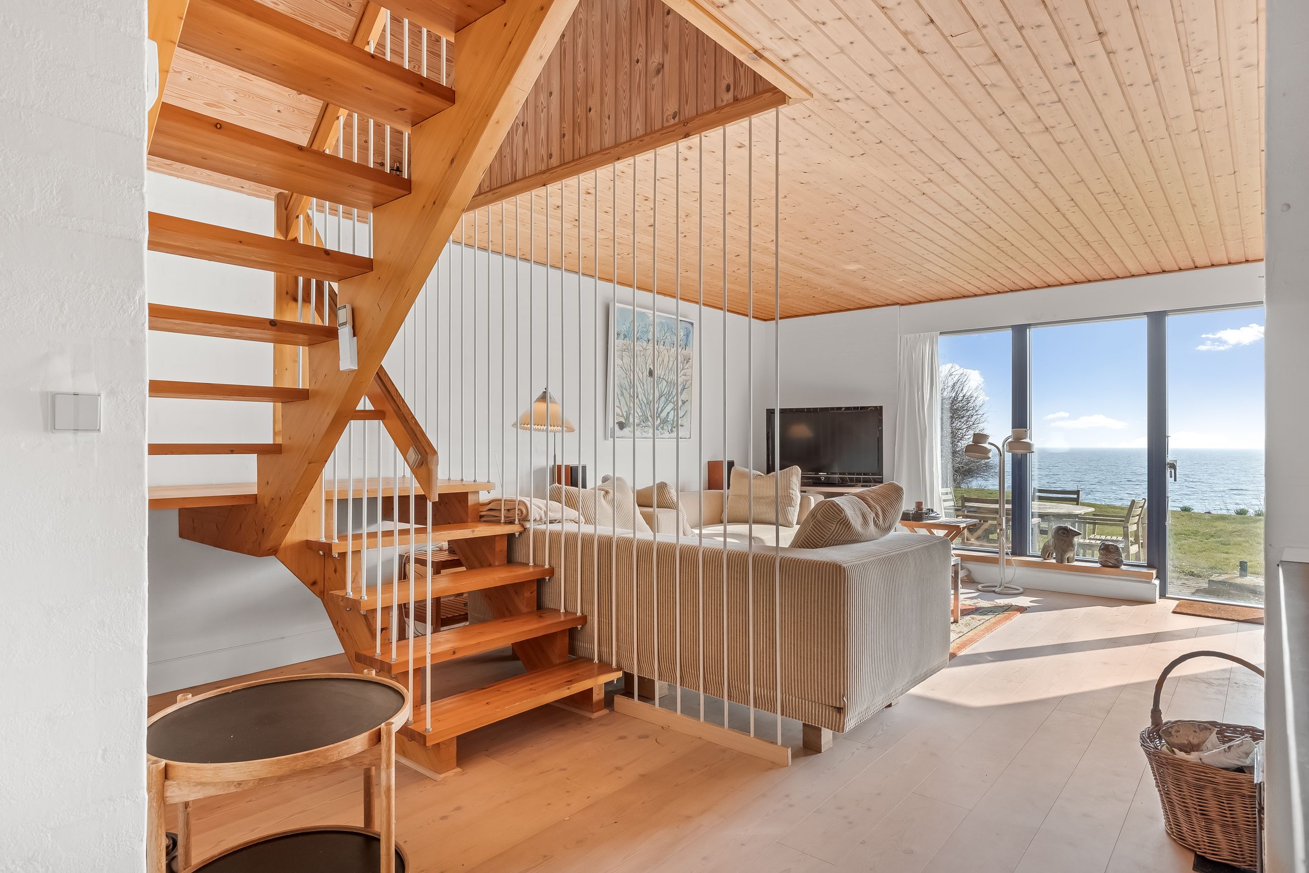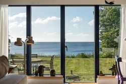 Sommerhuset stue/alrum imponerer med store vinduespartier der lader den spektakulære havudsigt strømme uhindret ind. Her er alt åbent og køkken, spiseplads og sofahygge kan nydes i samme rum. I stueplan er der desuden et rummeligt badeværelse, bryggers og et hyggeligt kontor, som let kan omdannes til endnu et værelse. På husets første sal findes to charmerende værelser, hvoraf det ene soveværelse tilbyder en enestående udsigt over havet og det andet over de ny såede marker. Og så er her også et toilet med vask, til dem der sætter pris på det.