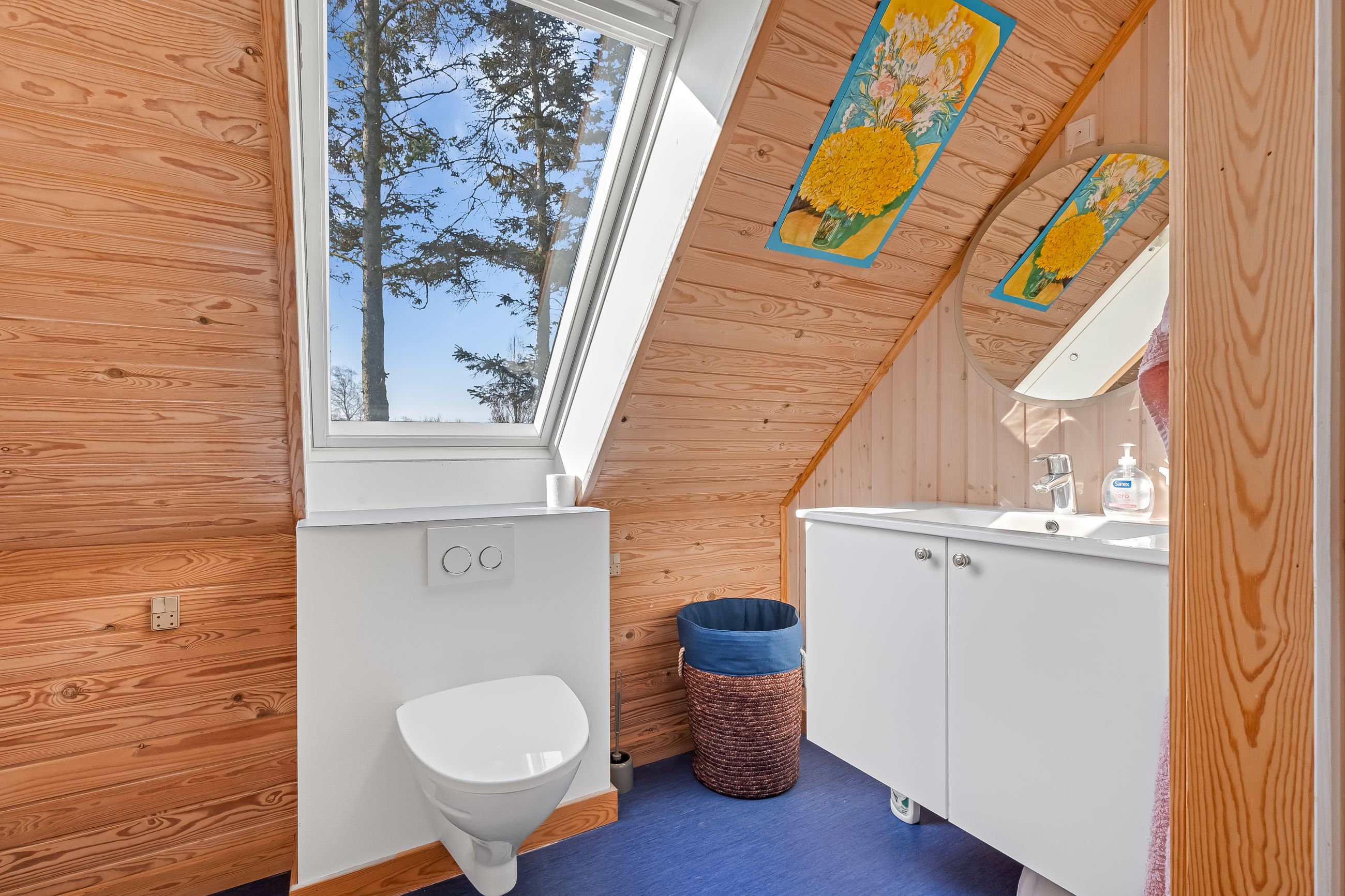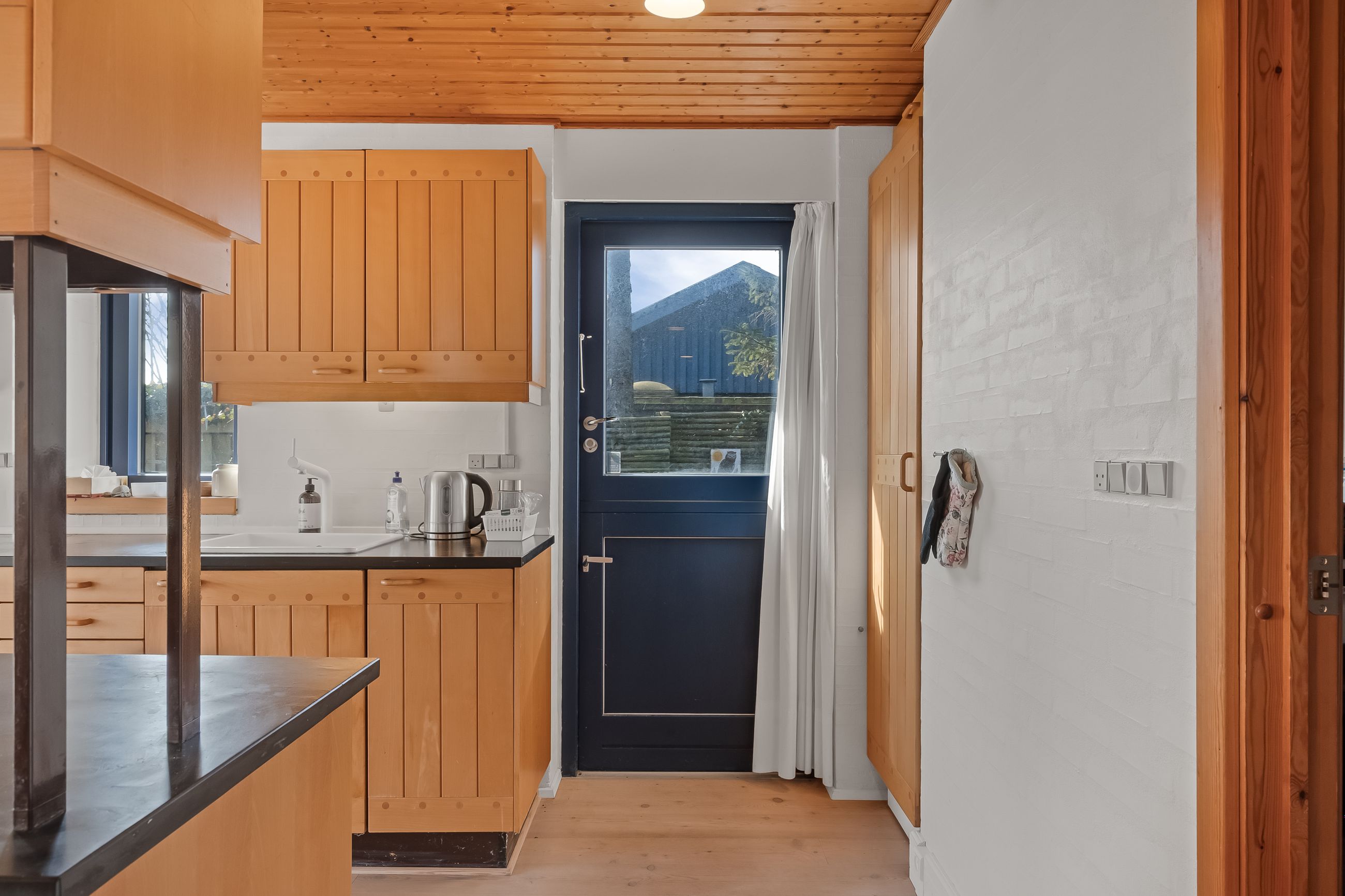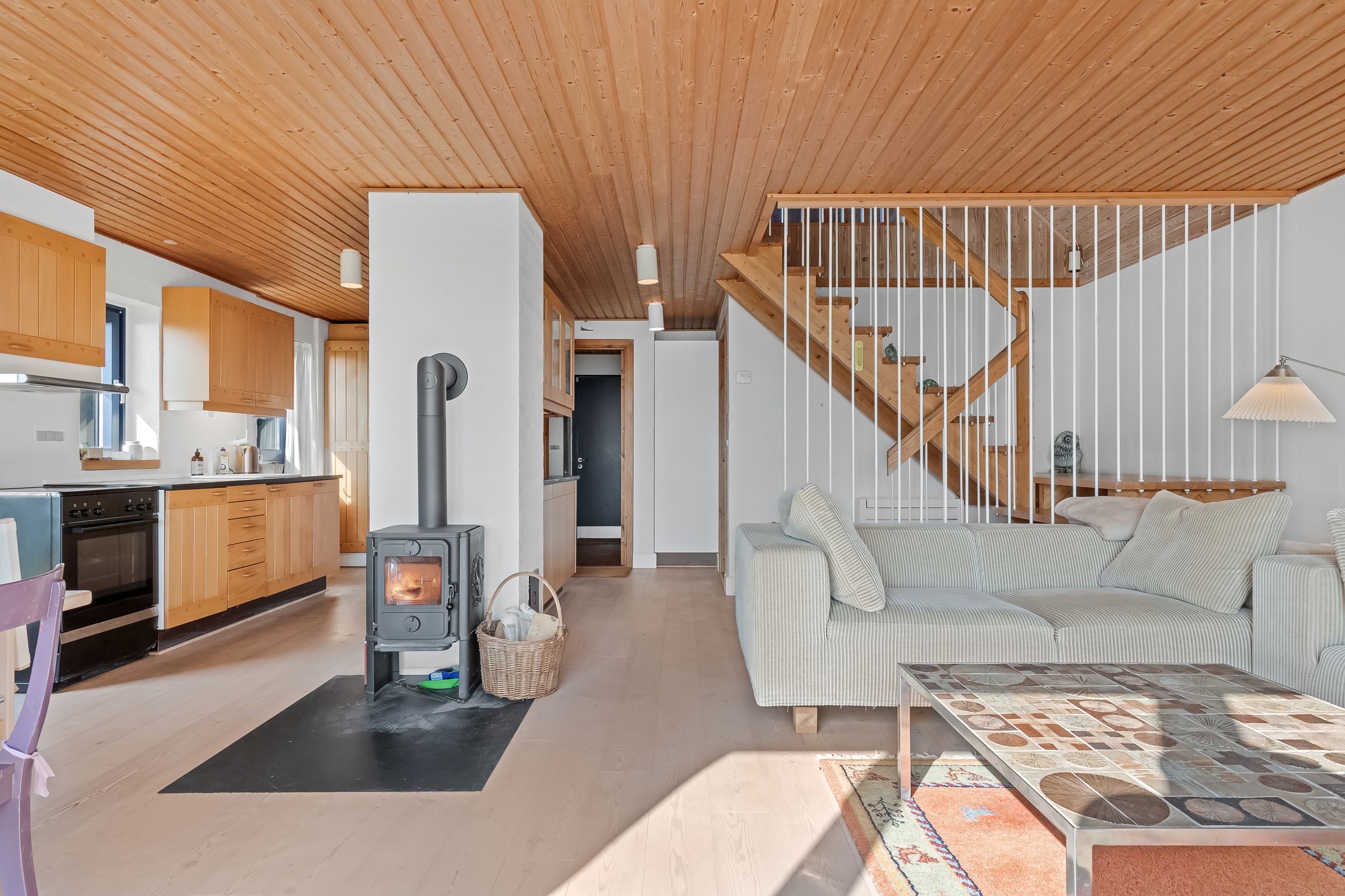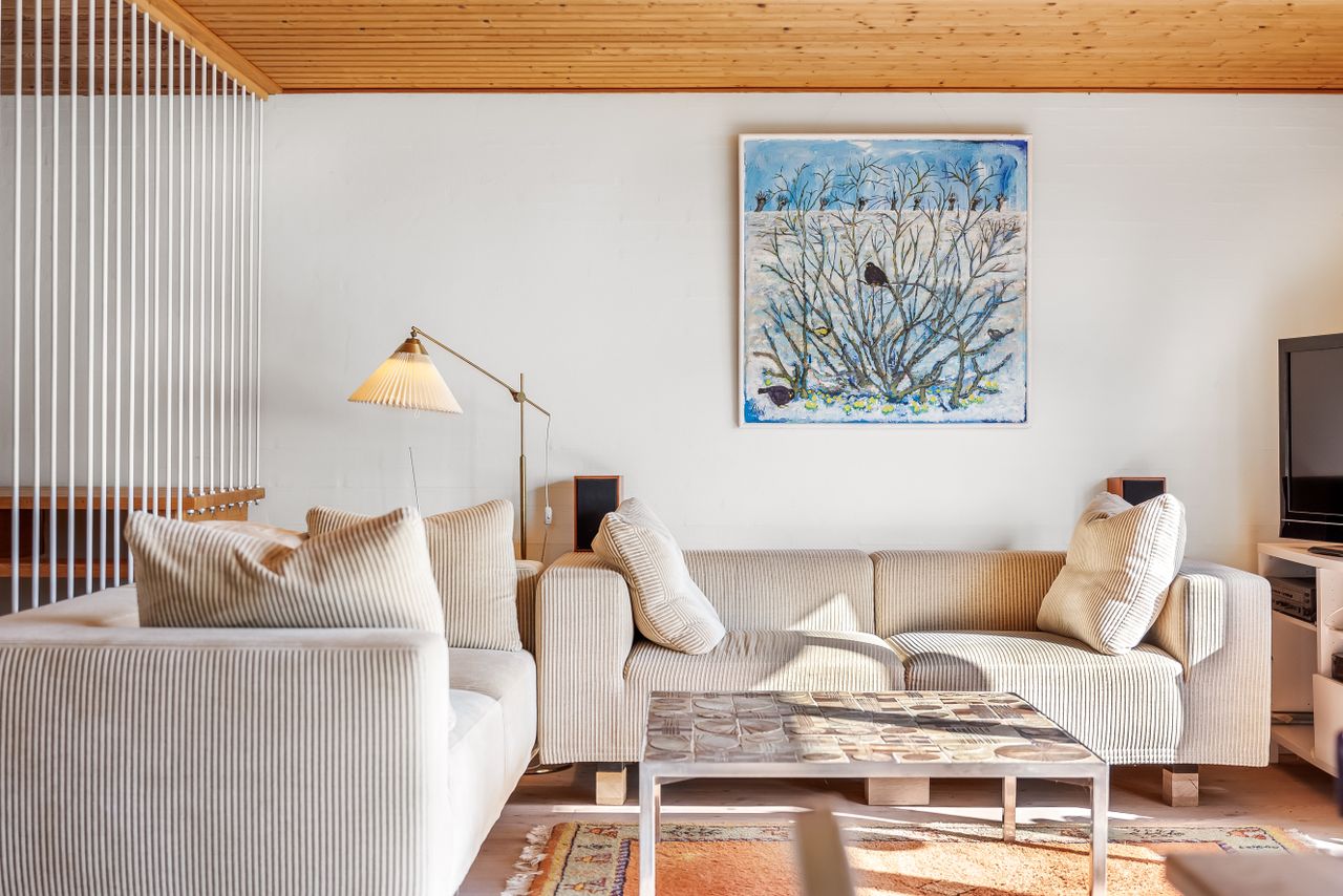 Sommerhuset stue/alrum imponerer med store vinduespartier der lader den spektakulære havudsigt strømme uhindret ind. Her er alt åbent og køkken, spiseplads og sofahygge kan nydes i samme rum. I stueplan er der desuden et rummeligt badeværelse, bryggers og et hyggeligt kontor, som let kan omdannes til endnu et værelse. På husets første sal findes to charmerende værelser, hvoraf det ene soveværelse tilbyder en enestående udsigt over havet og det andet over de ny såede marker. Og så er her også et toilet med vask, til dem der sætter pris på det.