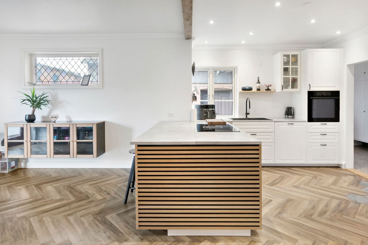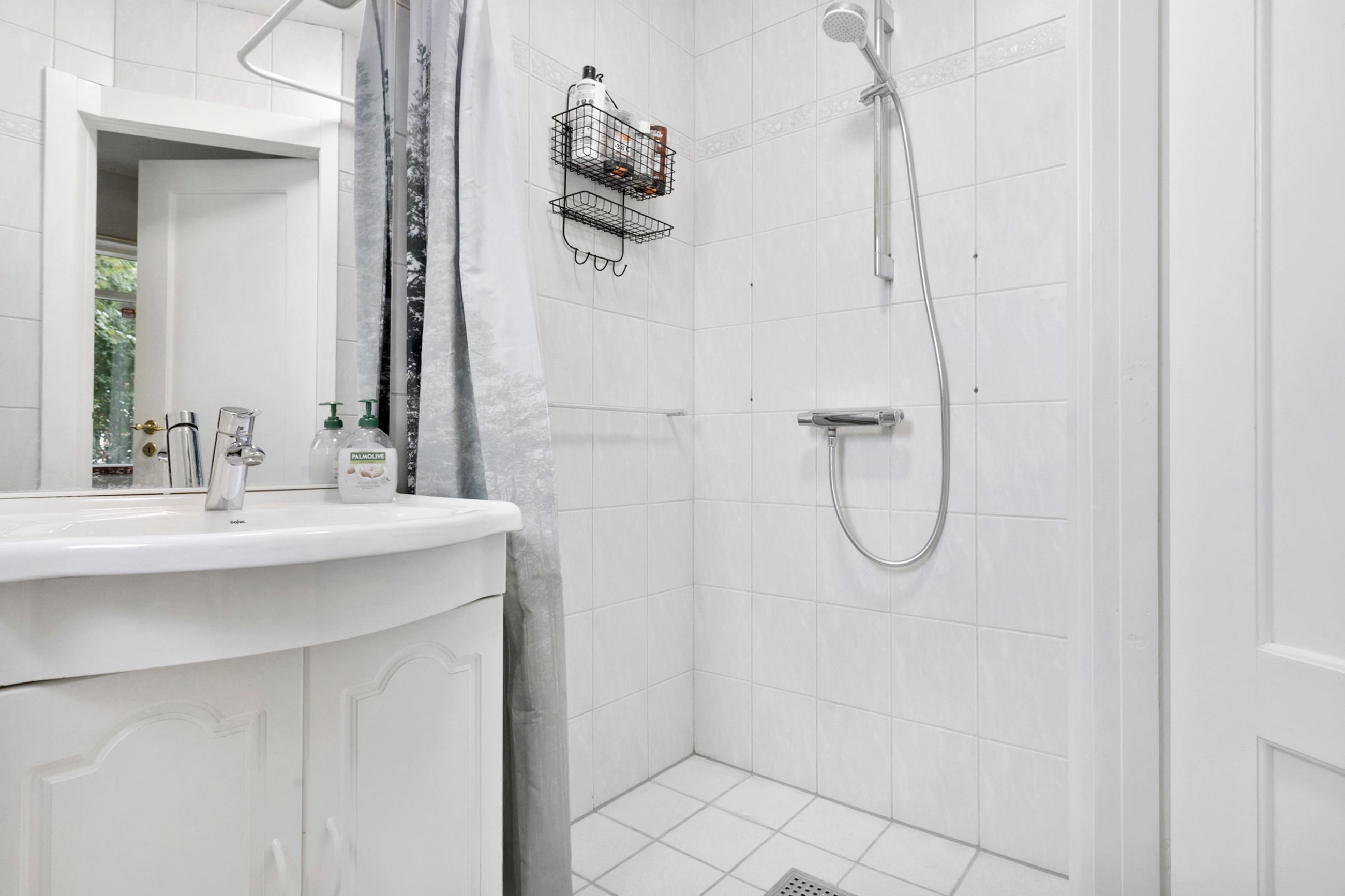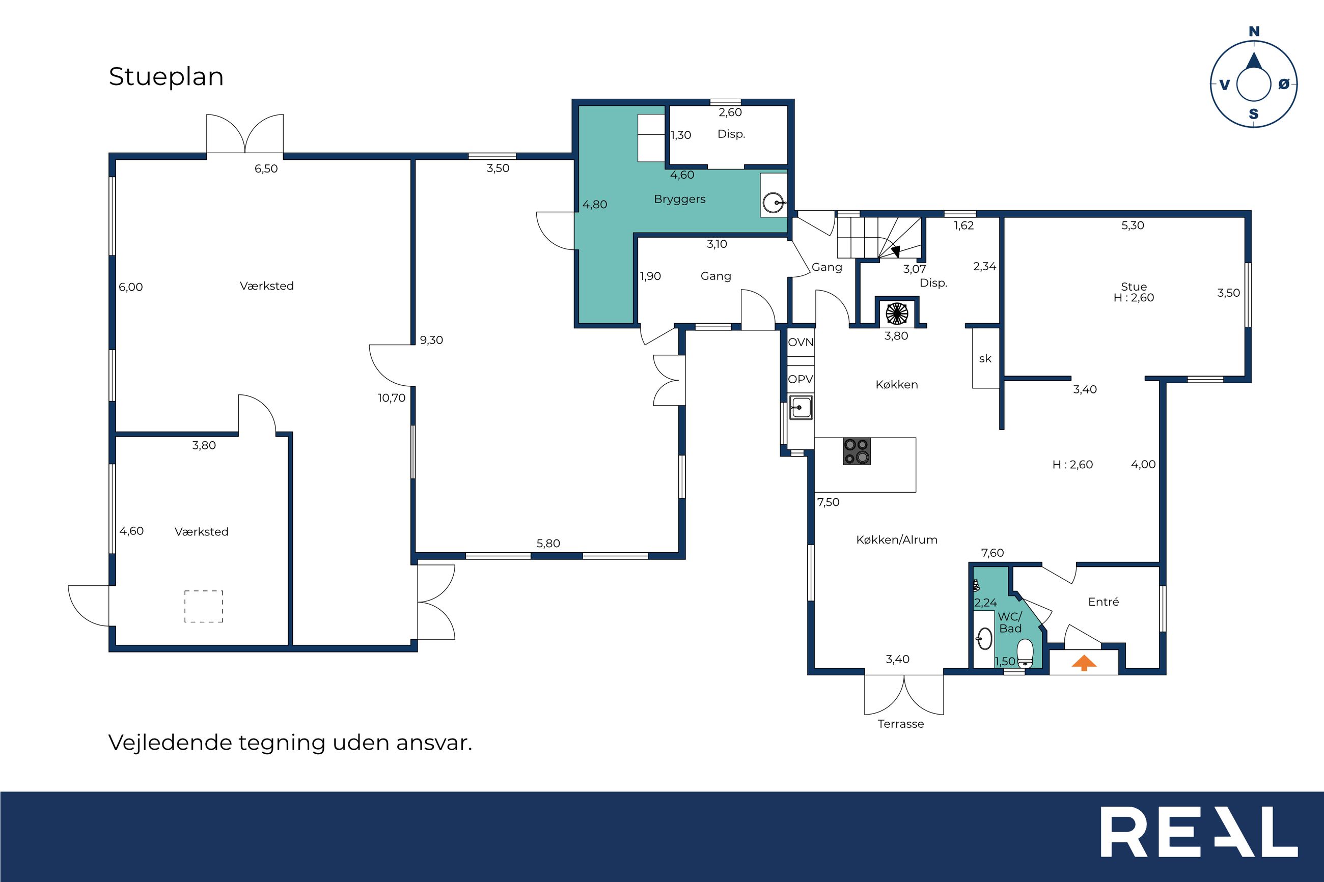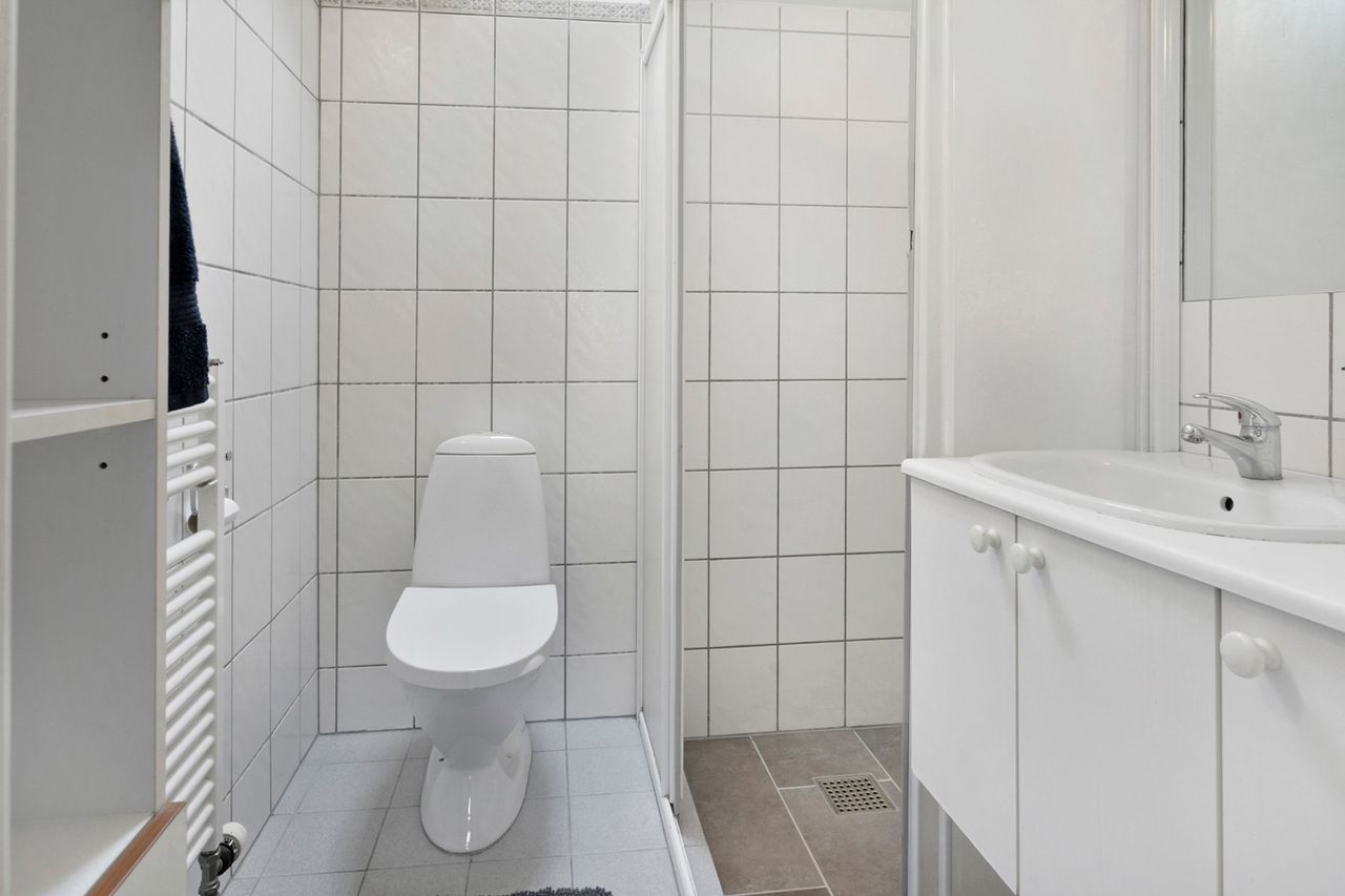 En gang/bryggers-zone samler vask og opbevaring og forbinder boligen med disp.-rum og det store værkstedsafsnit. Det er her, hverdagen bliver nem: ind med sportstasker, barnevogn, værktøj – ud igen, uden at slæbe det gennem stuen.