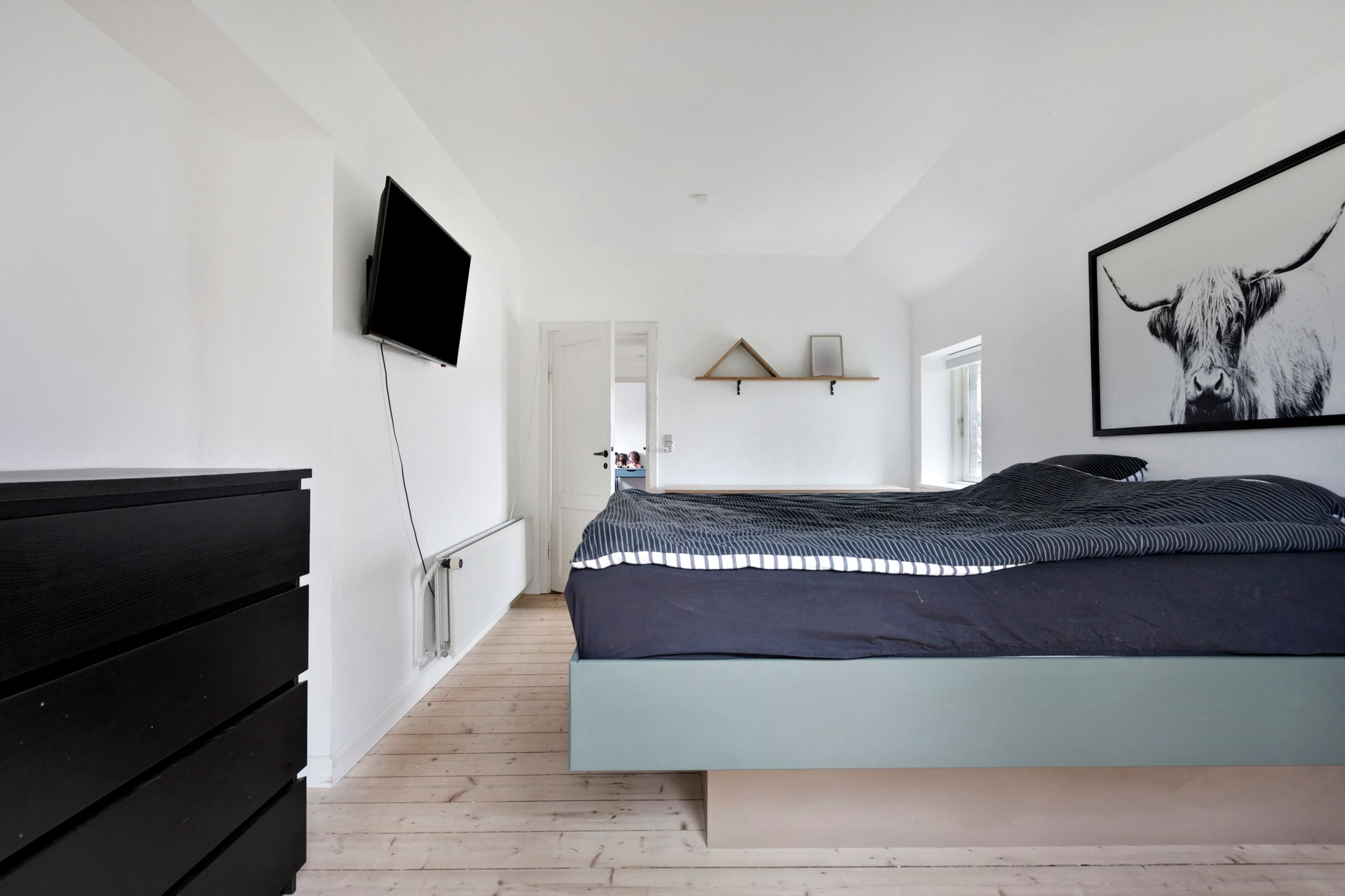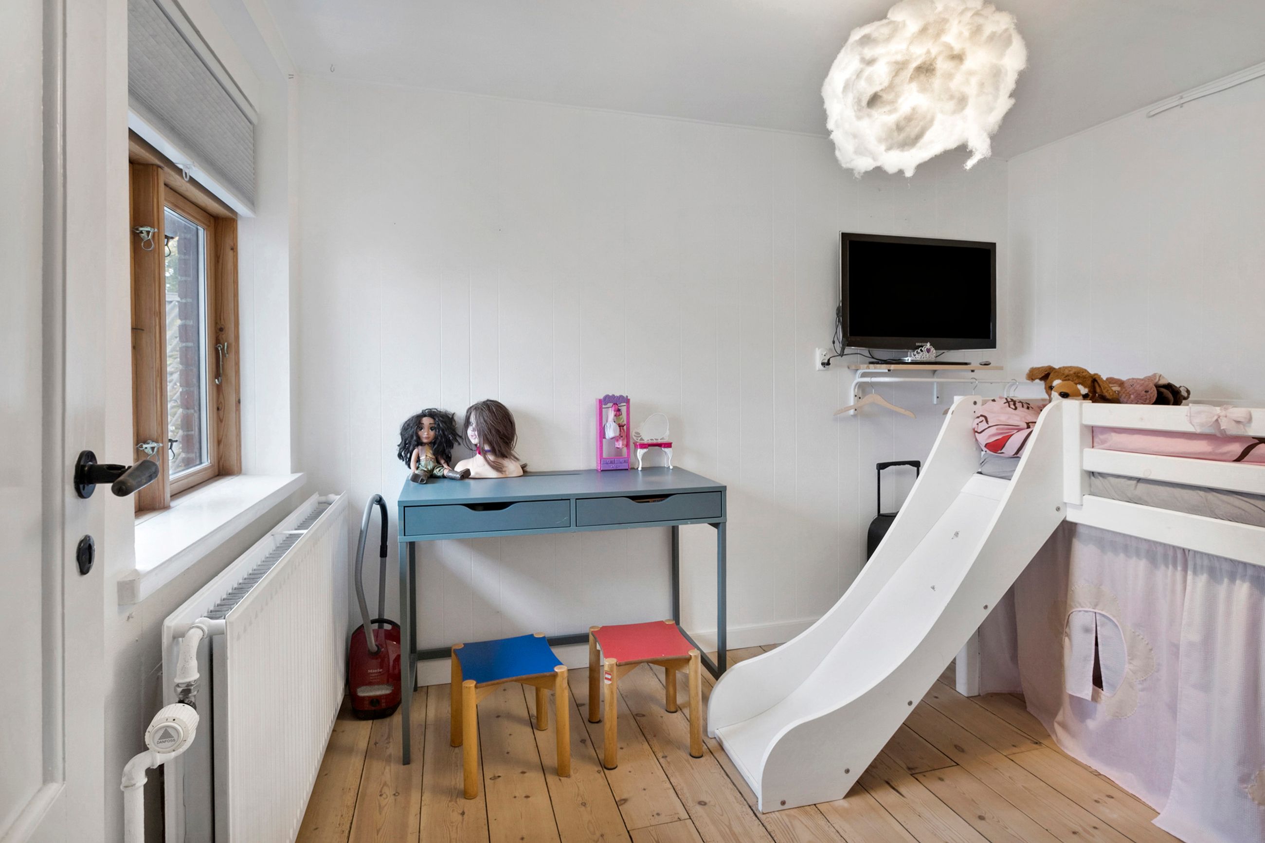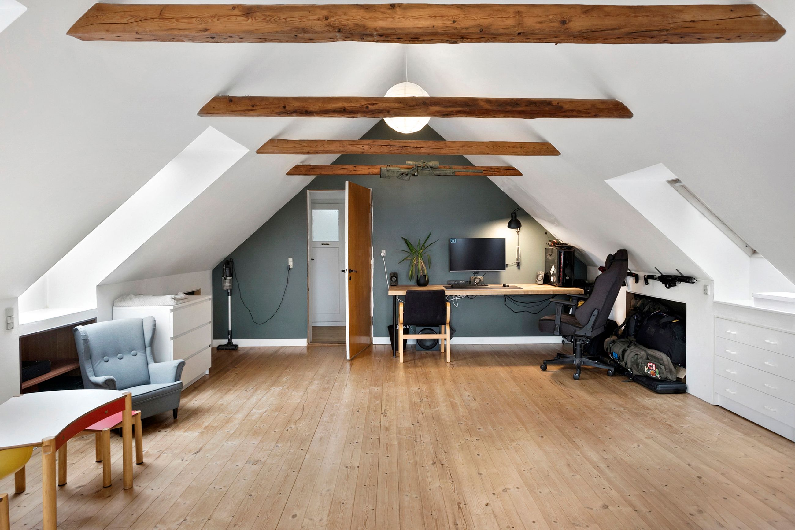 På 1. salen er der 3 gode værelser eller det ene kan bruges som stort multirum med synlige bjælker og masser af gulvplads til leg, gaming, kontor eller hobby – og let at opdele i et ekstra værelse, hvis behovet opstår. Etagen har eget WC, så morgenlogistikken kører uden kø.