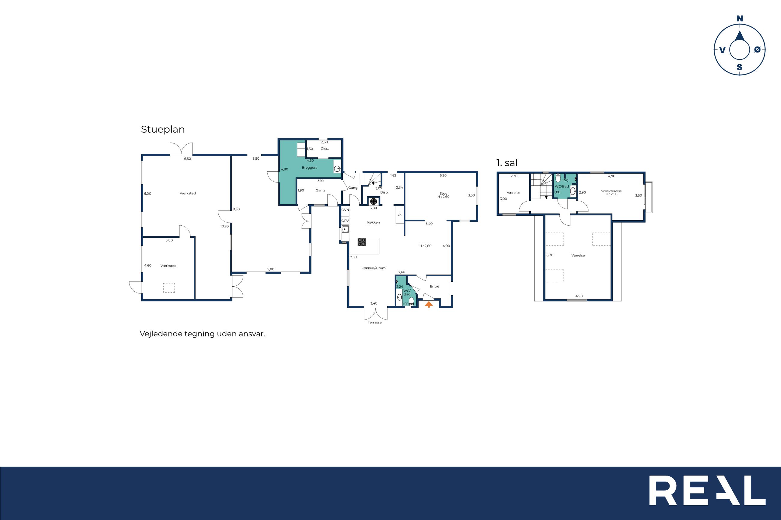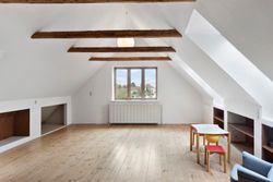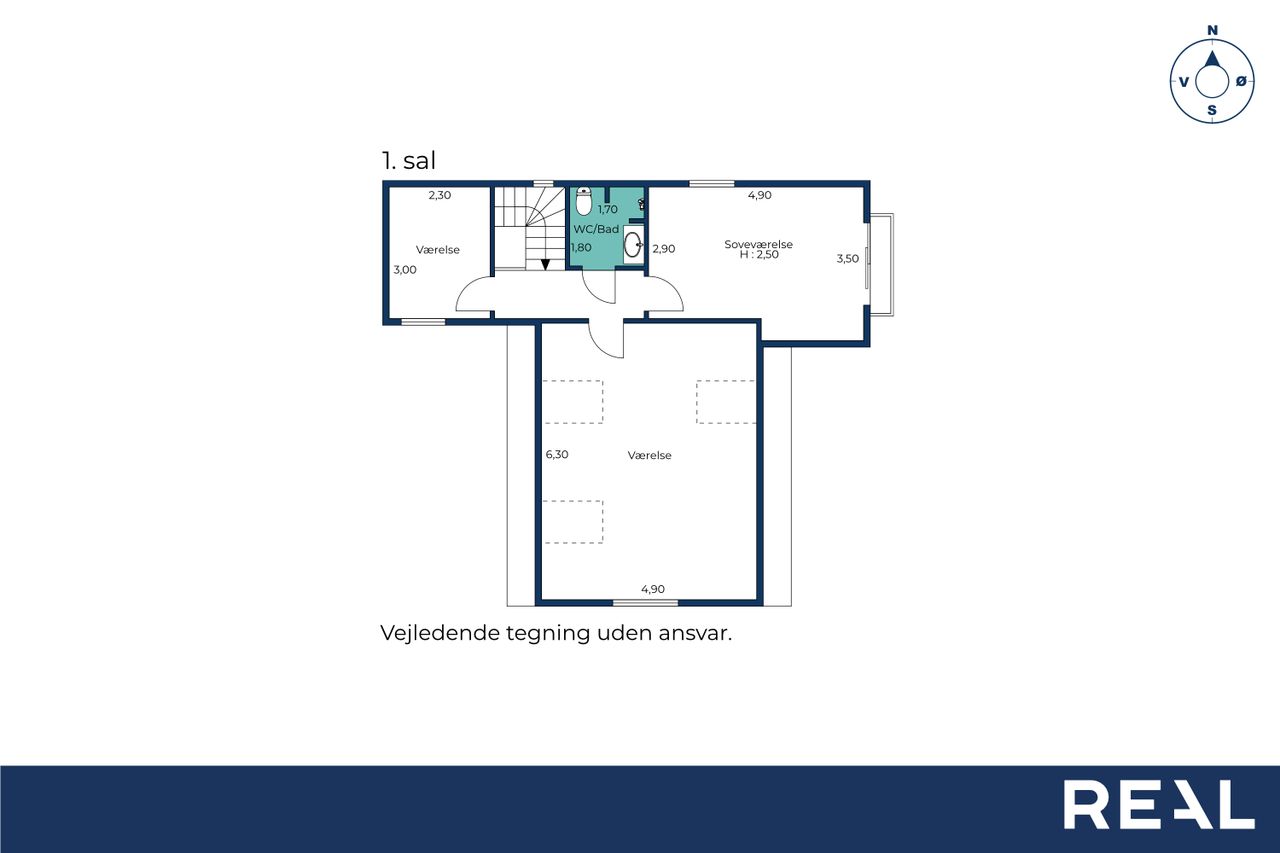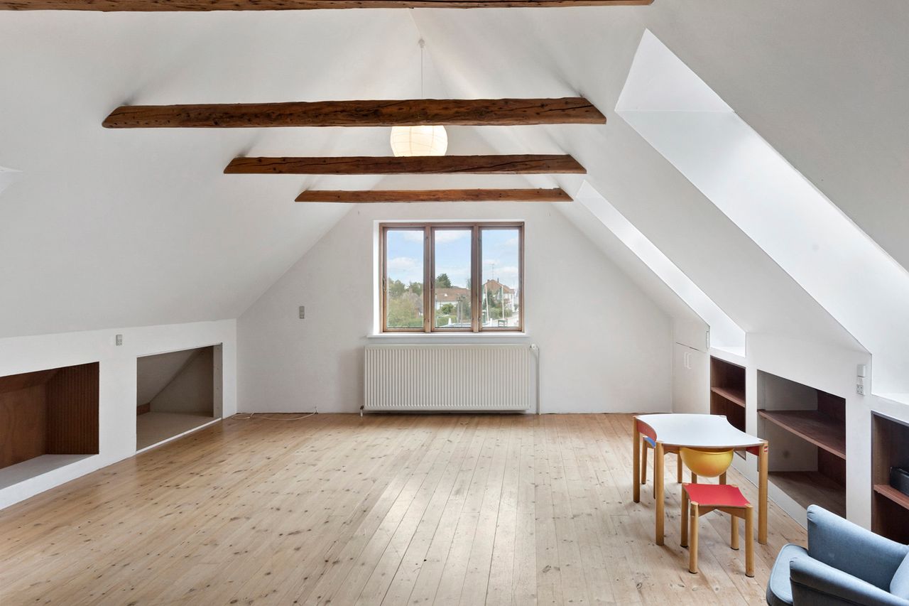 På 1. salen er der 3 gode værelser eller det ene kan bruges som stort multirum med synlige bjælker og masser af gulvplads til leg, gaming, kontor eller hobby – og let at opdele i et ekstra værelse, hvis behovet opstår. Etagen har eget WC, så morgenlogistikken kører uden kø.