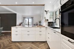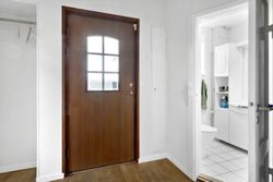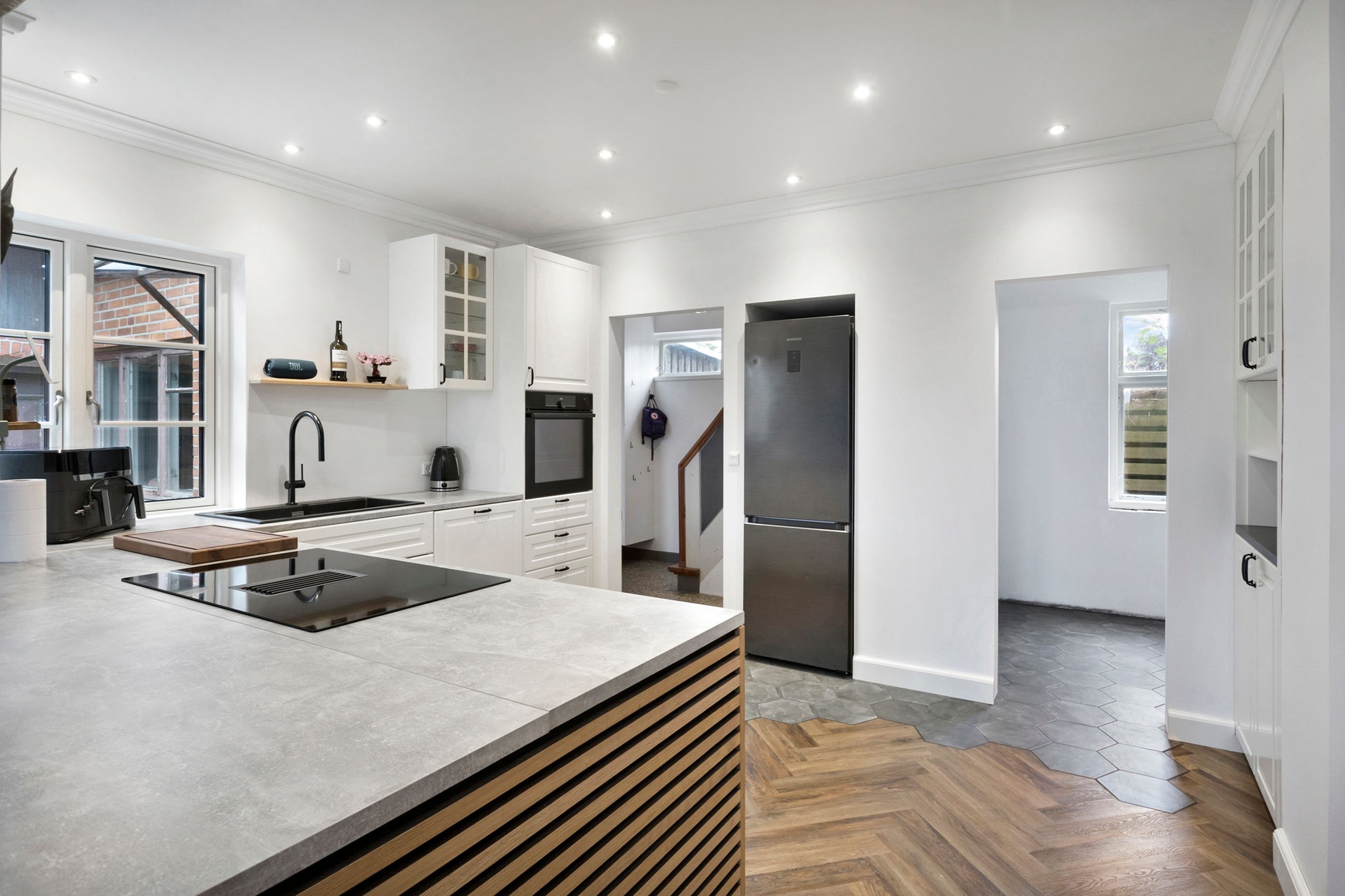 I træder ind i en praktisk entré med garderobe og flise badeværelse lige ved hånden. Videre ind åbner et lyst køkken/alrum med stor ø sig mod spiseafsnit og stor opholdsstue. Her er plads til både lektier, pastagryder og langbord. Fra alrummet er der dør ud til det lukkede gårdrum – perfekt til grill, kaffe og fred fra blæsten.