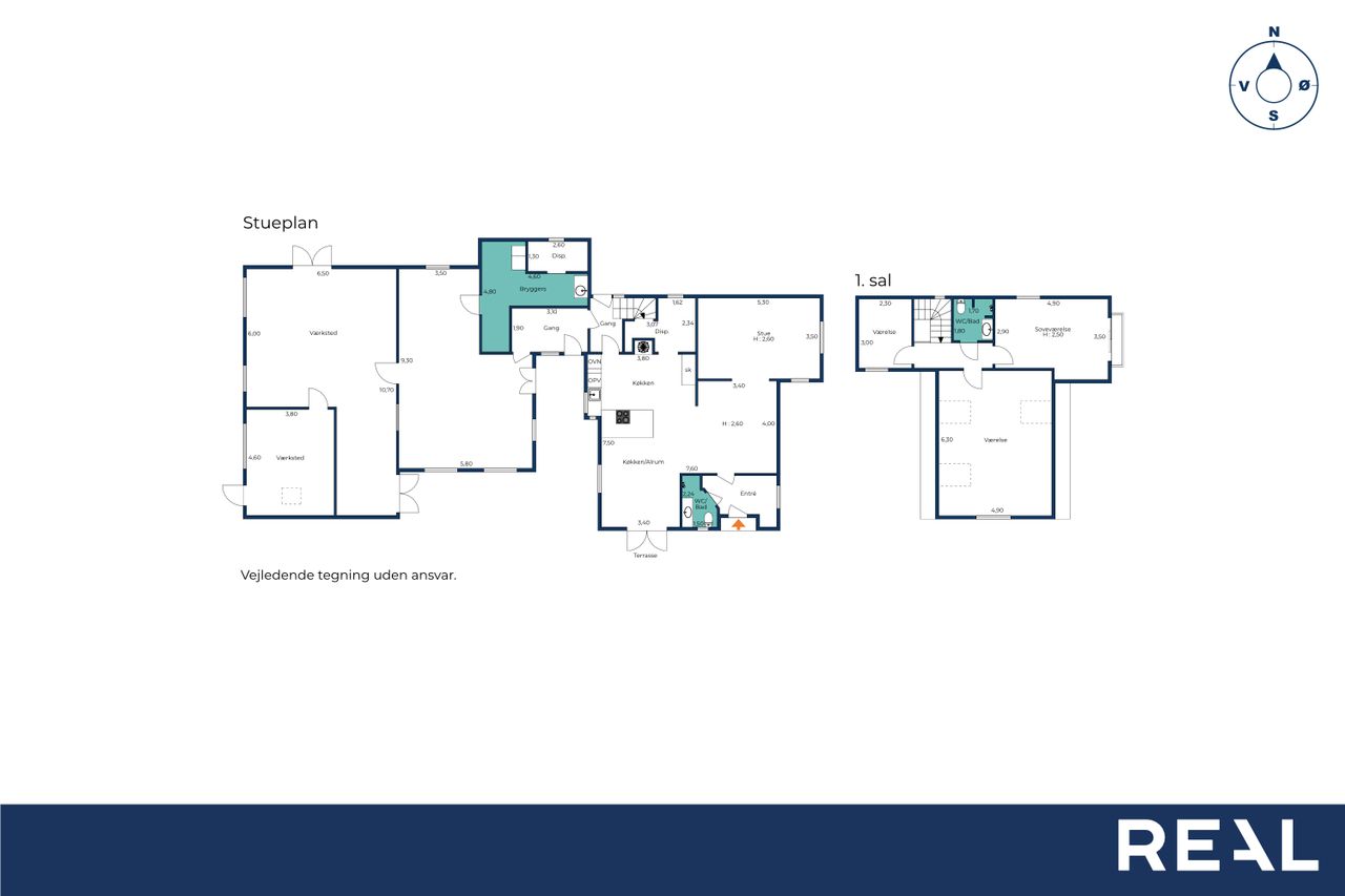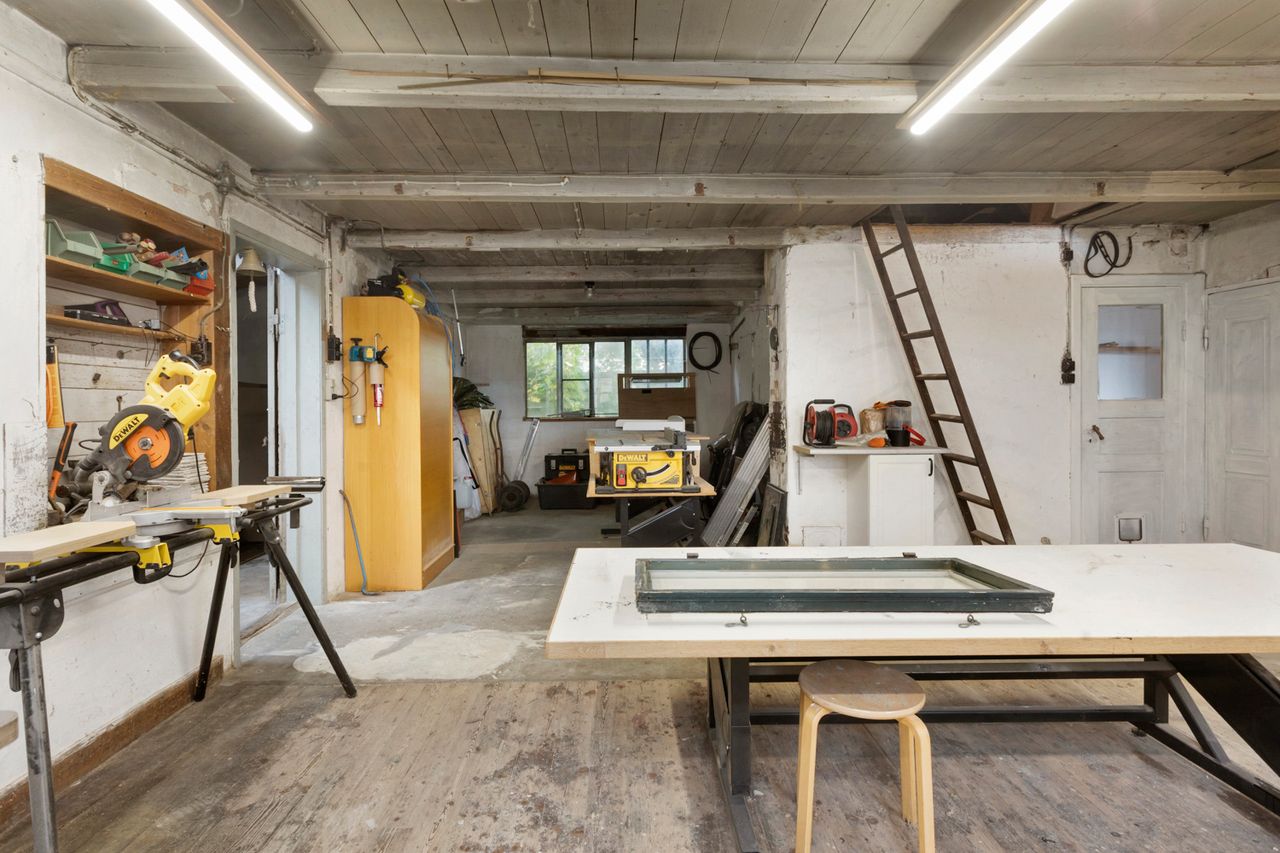 Her får I i alt 186 m2 udhus/værksted (131 m2 + 55 m2) med flere sammenhængende rum, god loftshøjde, vinduer/ovenlys og brede døre/port. Læg dertil 35 m2 garage. Det er oplagt til: