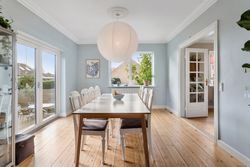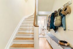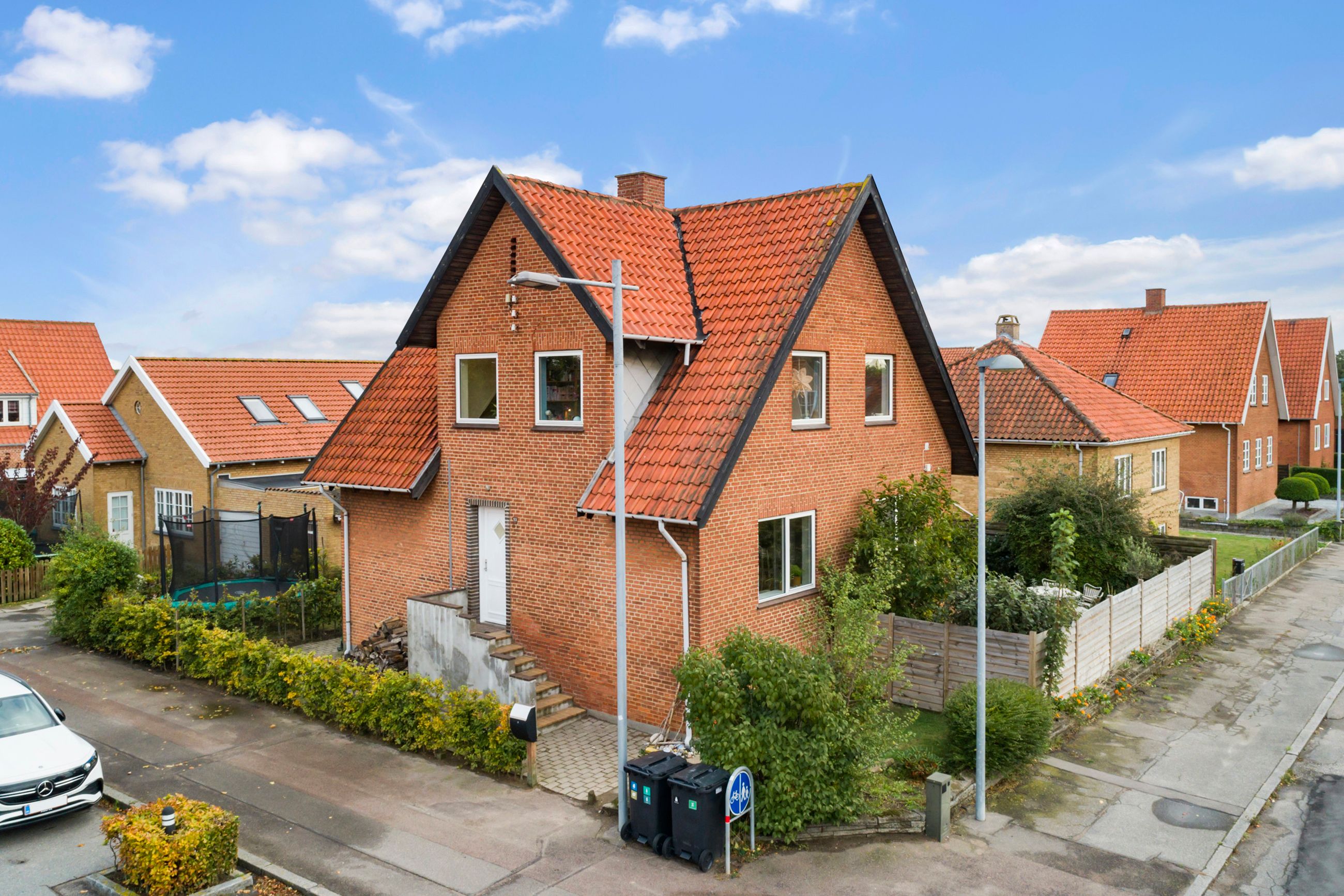 I ankommer til en villavej, hvor man hilser på naboerne og kan høre cyklerne hjule forbi på vej mod skole. Trinene leder jer op til entréen, hvor trappen elegant forbinder husets etager. Her er plads til overtøj og sko, og fra første skridt mærker I de smukke plankegulve og den behagelige loftshøjde, der giver luft og ro.