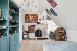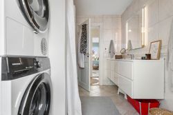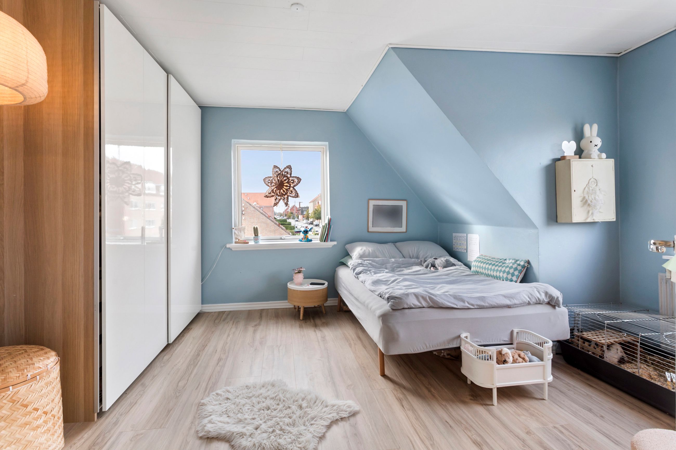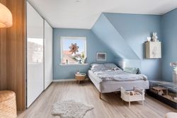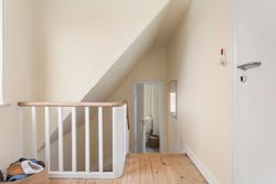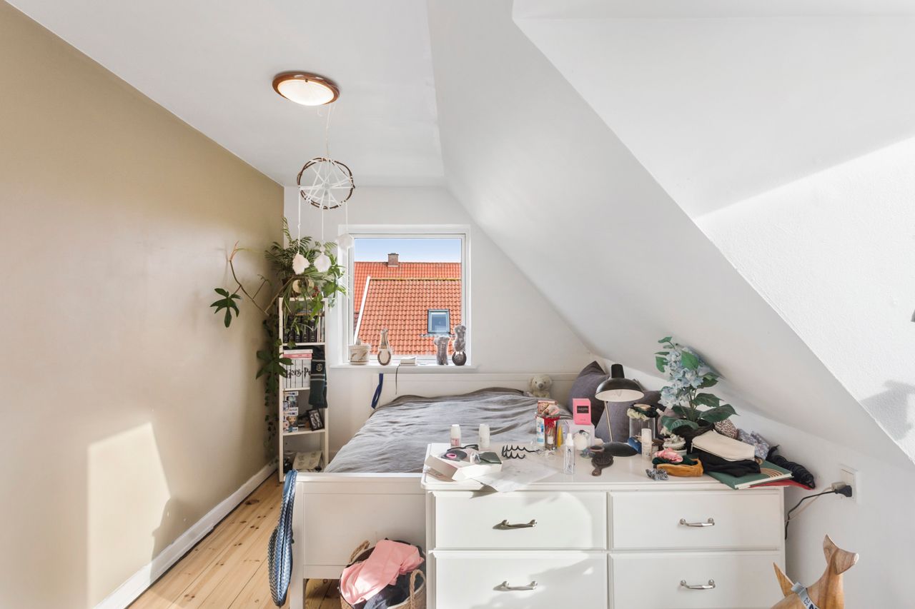 Oppe på førstesalen ligger en rolig soveafdeling med repos og tre regulære værelser, der kan fordeles efter behov og livsfase. Heroppe finder I også badeværelset i flotte lyse farver og med plads til vaskemaskine og tørretumbler.