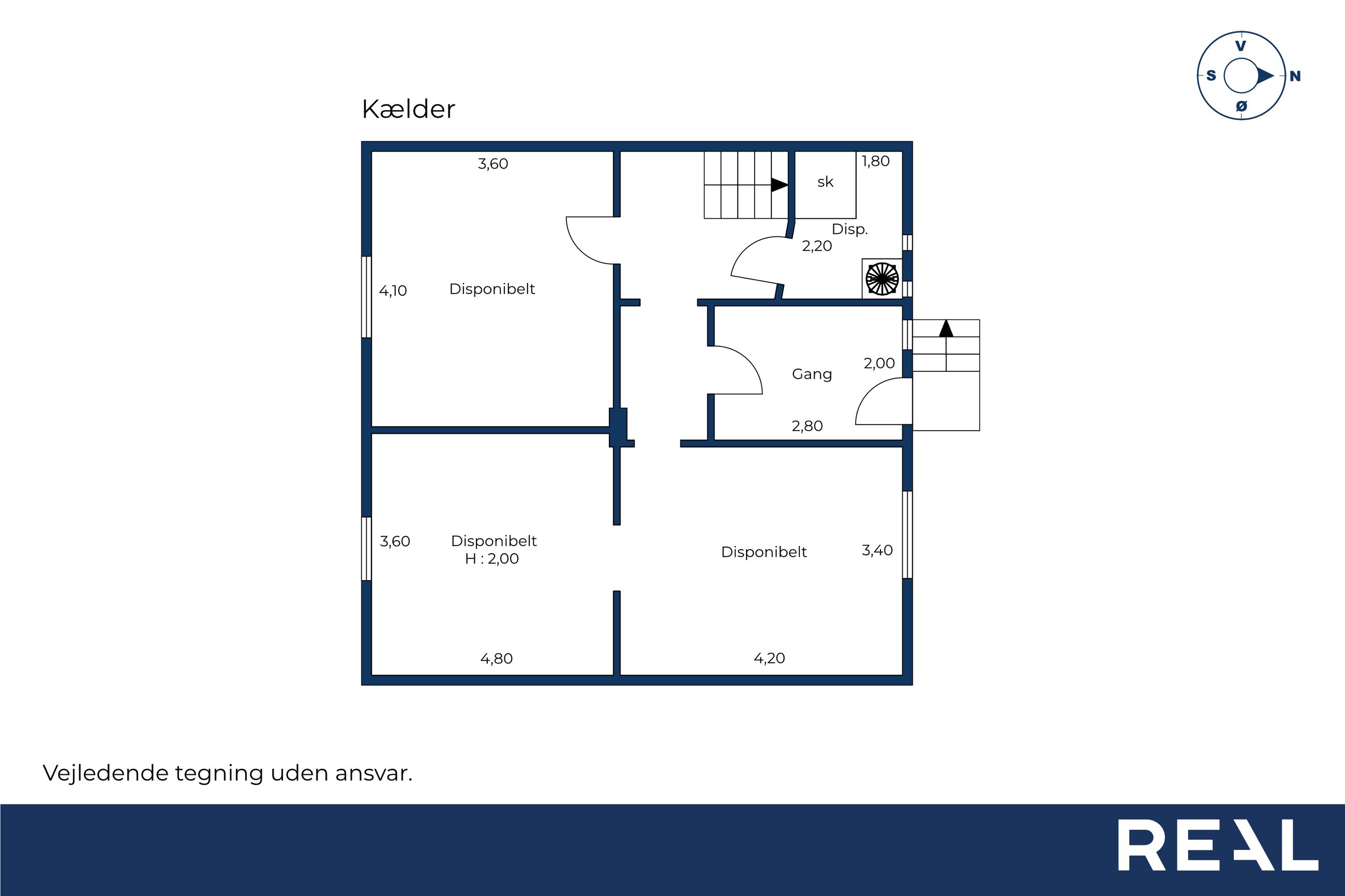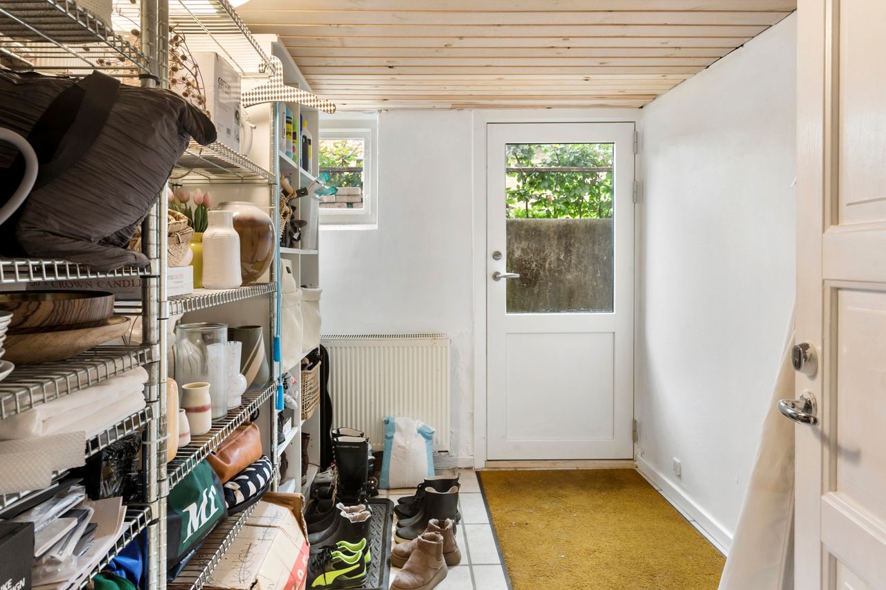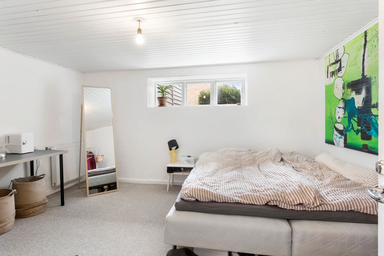Kælderen er pæn og brugbar med flere disponible rum til vask, opbevaring, værksted og hobby. Her er egen indgang udefra, så fritidsgear, løbesko, barnevogn eller våde fodboldstøvler kan komme direkte ind uden at runde stuen. I et af de store rum er loftshøjden ca. 2,0 m, hvilket gør det ekstra anvendeligt til projekter og motion.