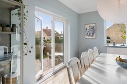 Hjertet er det store køkken/alrum i hele husets bredde. Lange bordplader, gode skabe, integrerede hvidevarer og en hyggelig sidde-niche gør madlavningen til en fornøjelse – også når lektierne skal klares ved siden af. De franske døre til stuen åbner for to gode opholdsrum, der hænger naturligt sammen: spisestuen til langbordet og hverdagsmiddage, stuen til film, fredagsslik og bogen, I ikke kan lægge fra jer. Og når vejret er med jer, går dobbeltdøren direkte ud på den store træterrasse i flere niveauer, så ude og inde smelter sammen.